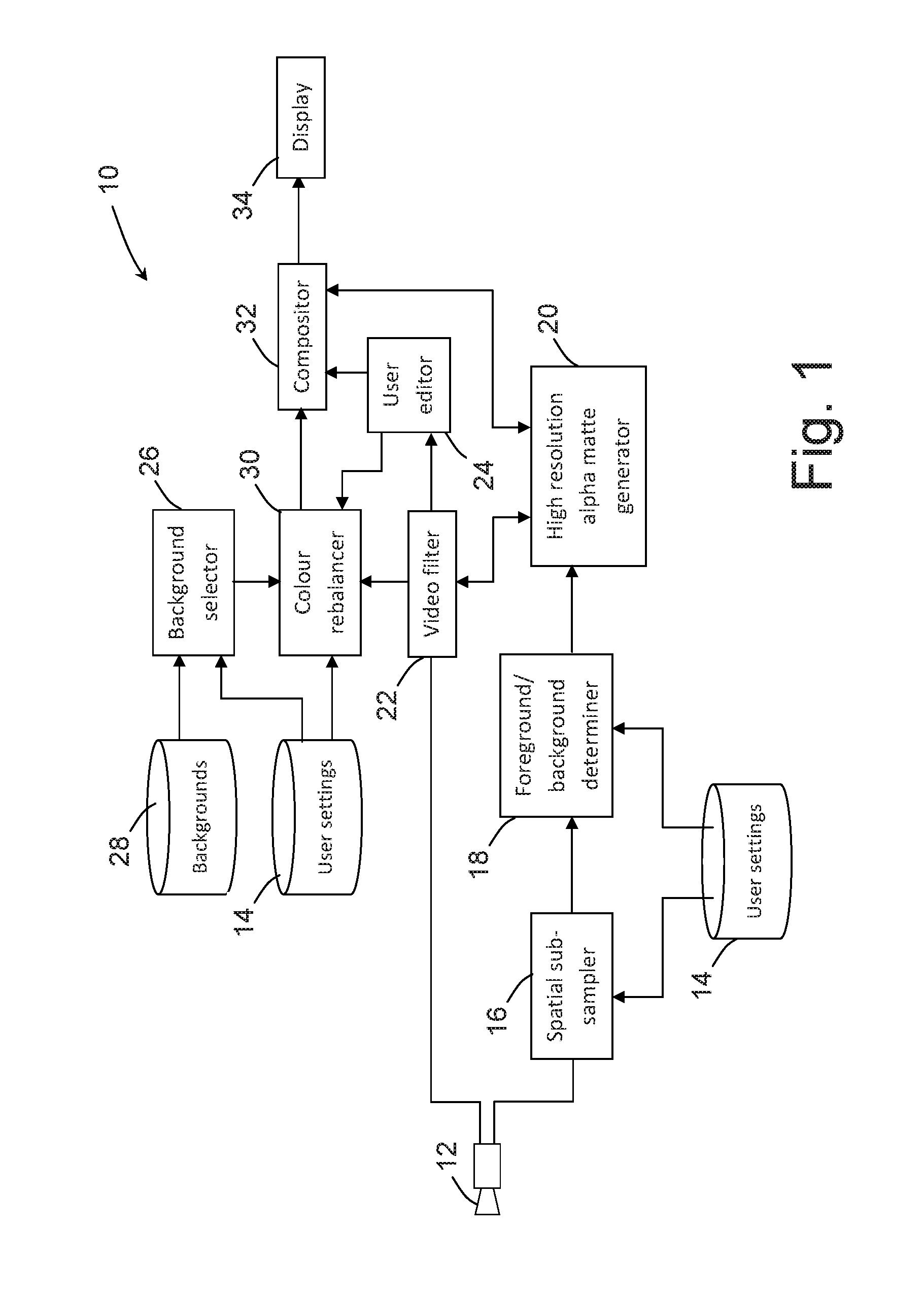 The search radius r is calculated from the search diameter, as follows: The distance weight dijis calculated from the distance between the relative x,y position of the low resolution RGB pixel from the location of the high resolution RGB pixel, as follows: The distance weight for each pixel in the output array is defined as: A threshold value T is calculated to account for colour variances within the image, as follows: As shown in The system also comprises a video filter 22 arranged to adjust the video frames of the high resolution video stream by modifying the colours in the video frames at the boundary between the foreground portion and the background portion identified by the high resolution alpha matte. At the boundary between the foreground portion and the background portion, the image pixels may contain a mix of colour information from both the foreground portion and the background portion, and the video filter 22 modifies the pixels of the image frame of the high resolution video stream around the edges of the foreground portion so as to avoid noticeable bleeding from the background portion. In some situations, such as in environments with poor lighting or wherein the colours in the foreground and background portions are similar, the foreground determiner circuit 18 is not able to identify the foreground portion with sufficient accuracy. For this purpose, in this example, the system 10 includes a user editor 24 arranged to enable the user to manually correct the results of the background removal process. In an embodiment, the user is able to indicate a portion of the image that has been incorrectly assigned, for example using a mouse or by interacting with the touch screen 17 of the device. For example, if the area indicated by the user is shown as part of the foreground portion, the user editor 24 changes the area to foreground. Similarly, if the area indicated by the user is shown as part of the background portion, the user editor 24 changes the area to background. In a particular implementation, a SLIC superpixel segmentation process is used wherein pixels in a video frame are grouped and segments re-assigned to or from the foreground portion in the area indicated by the user. In an alternative embodiment, selection by the user of an incorrect area is used to modify a torso modeller (described in more detail below) so that the areas indicated by the user are used in the evaluation of the torso models and the functionality of the torso modeller is thereby improved. In this example, the system also includes a background selector 26 arranged to facilitate selection, in this example, by a user of a replacement background that is to form a composite video with the identified foreground portion. The background selector 26 in this example includes a user interface component that allows the user to select an image, video or other graphic element from a background content storage device 28. In this example, the background content storage device 28 includes alternate background images and videos. Alternatively, the background selector 26 may be arranged to select a replacement background automatically. As an alternative to new background content, the replacement background content may be a modified version of the existing background portion. For example, the replacement background may be produced by applying a suitable image modifier circuit to the existing background portion that is arranged to blur the existing background portion, for example using a suitable alpha mask. The system 10 also includes at least one filter, for example a colour rebalancer 30 that is used to improve the colour levels of the foreground portion relative to the selected replacement background content. If the selected replacement background content is an image, this is achieved by analysing a RGB histogram of the background image. If the selected replacement background content is video, the RGB histogram of the background video is averaged over time. In an embodiment, the colours of the RGB histogram of the background content are weighted based on their spatial position so that colours in lower and central parts of the image have a greater effect on an overall colour average. Using the weighted colours of the background, the colour rebalancer 30 generates a gamma value for each RGB colour channel of the foreground portion of the image that is used to adjust the average of each colour channel of the foreground portion to be in accordance with the respective colour averages of the background portion of the image. This process serves to match the colour tone and brightness of the foreground portion of the image to the background portion of the image which makes the composite image frames appear more natural. In an alternative embodiment, the background colour average is weighted based on the location of the foreground portion relative to the background portion when the foreground portion is overlaid on the replacement background content. For example, if the foreground overlay is positioned on the right hand side of the replacement background content, then the background content average is more heavily weighted towards the left hand side of the image. This process further enhances the composite image of the foreground and background layers as it simulates ambient light. However, it will be understood that other arrangements are possible. For example, instead of modifying the colour tone and brightness of the foreground portion to match with the background content, the colour tone and brightness of the background content may be modified to match with the foreground portion. The system may include other filters applicable to the foreground portion and/or the replacement background content, including colour filters that apply a special effect and/or improve the combination of foreground and background graphics. For example, a sepia tone may be applied to both the foreground portion and the replacement background conten