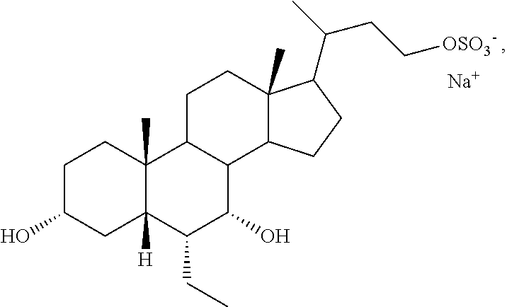 As used herein, “Compound 1” or “a compound of the invention” refers to 7α,11β-dihydroxy-6α-ethyl-5β-cholan-24-oic acid which has the following chemical structure:
