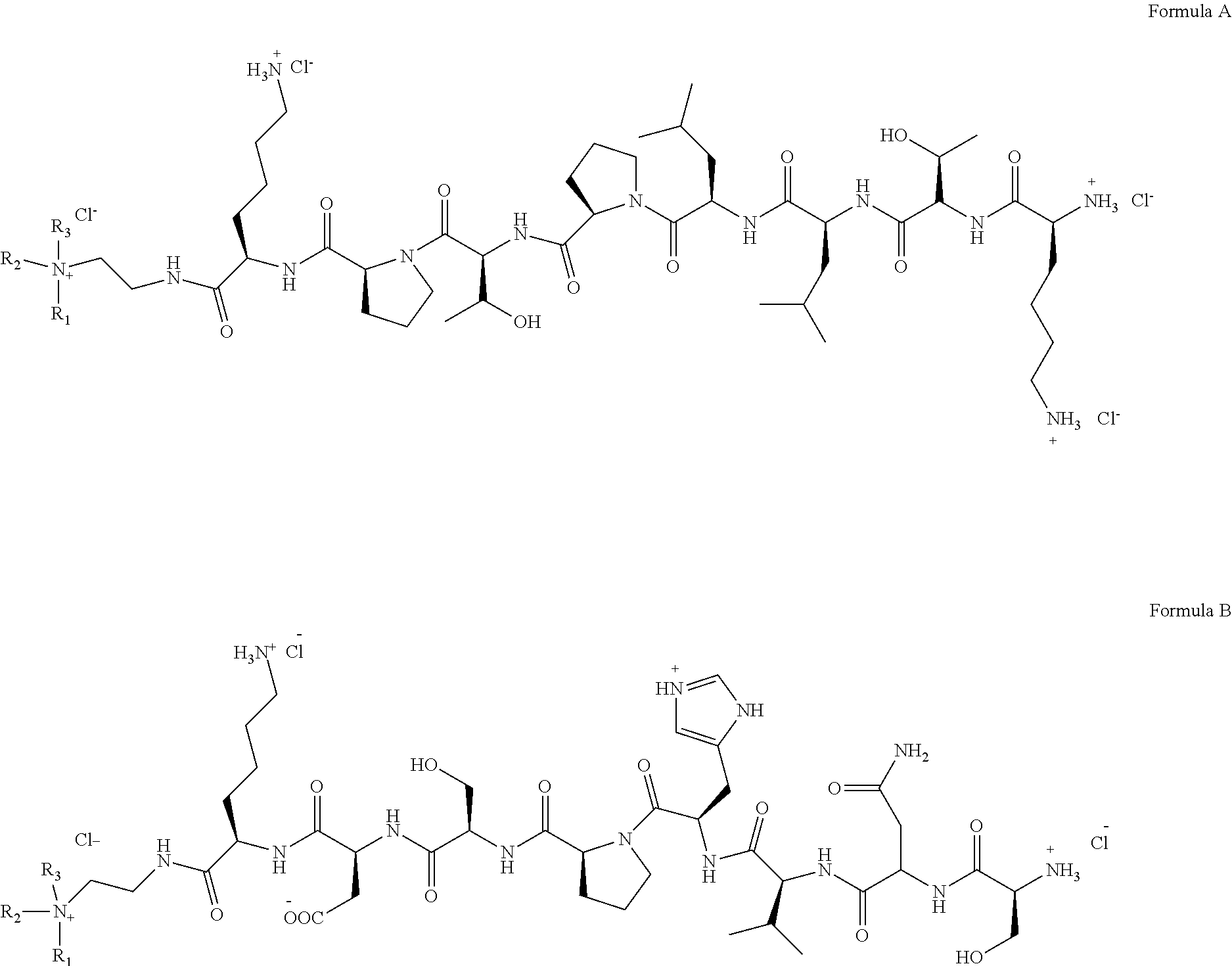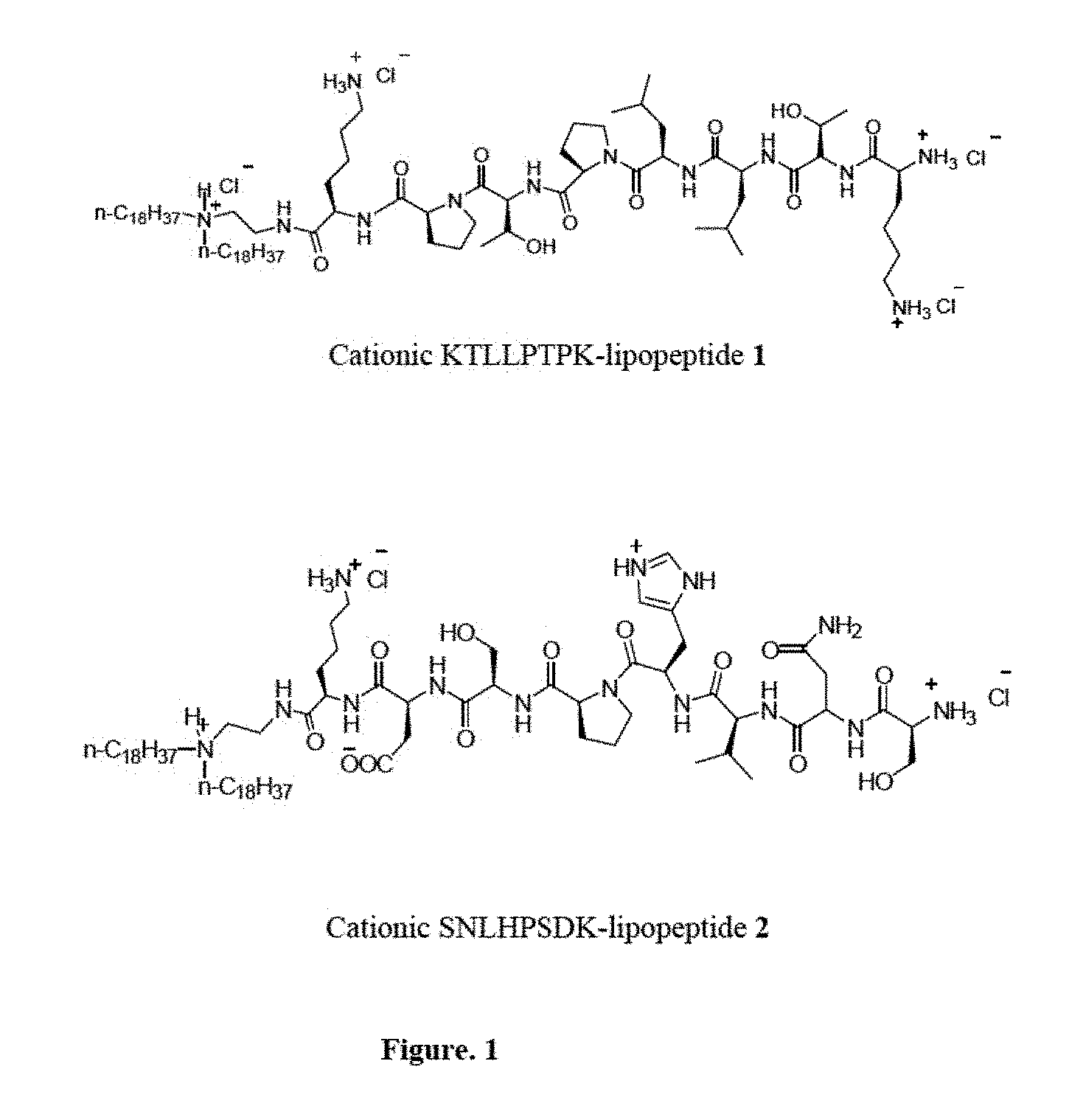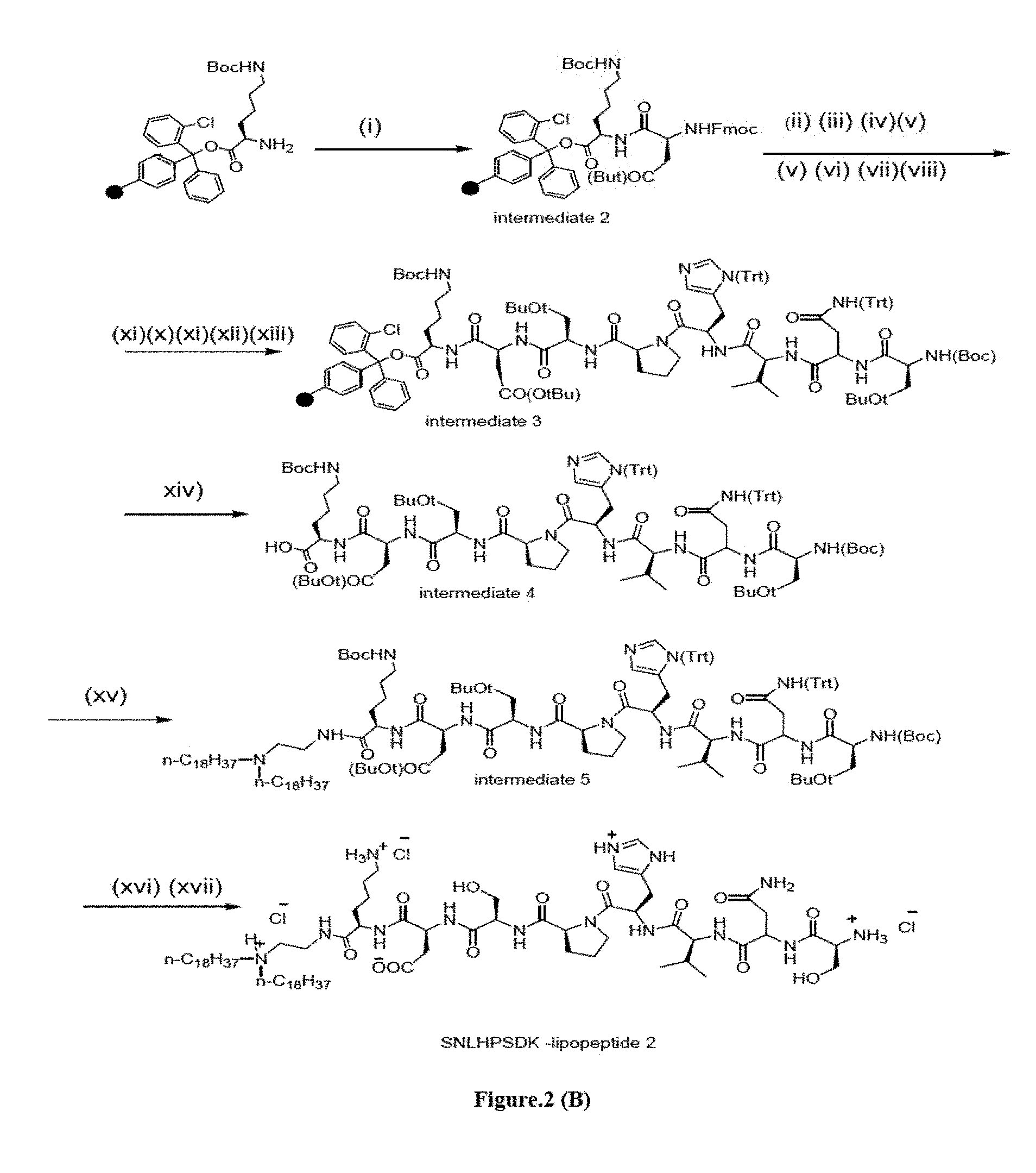 Synthetic strategies employed for preparing the cationic SNLPHSDK-lipopeptides B are depicted schematically in Scheme 2 (FIG. 2B) using SNLPHSDK-lipopeptide 2 as an illustrative example. Scheme 2 is a schematic representation of the Fmoc strategy based solid phase peptide synthesis procedures used for the preparation of a representative cationic SNLPHSDK-lipopeptide 2. H-Lys(Boc)-2-ClTrt resin-1 (Nε-Boc-Lysine pre-loaded 2-chloro trityl resin, Scheme 2) is first swelled in solvent and then coupled with Fmoc-Pro-OH using HBTU and DIPEA to afford intermediate 2. The resin is then washed and the Fmoc group is removed with a solution of piperidine and DMF. Following the same Fmoc strategy, sequential couplings of Fmoc-Asp (O-tert-butyl), Fmoc-Ser (O-tert-butyl), Fmoc-His (Trt), Fmoc-Leu-OH Fmoc-Asn (Trt)-OH, and Boc-Ser (O-tert-butyl), using HBTU and DIPEA affords the resin associated octa-peptide intermediate 3. The resin-bound intermediate 3 is treated with TFA:DCM (5:95, v/v) to obtain protected octa-peptide intermediate 4 (Scheme 2). N, N-di-n-Octadecyl-N-2-aminoethylamine is coupled with protected octapeptide intermediate 4 to prepare the protected SNLHPSDK-lipopeptide 2. To remove the protecting groups of amino acids the intermediate is treated with TFA:DCM:TIS (90:5:5, v/v). The deprotected lipopeptide is purified using Acetone and dietheylether precipitation method. The precipitate upon chloride ion exchange chromatography over Amberlyst IRA-400 resin followed by purification with reversed phase HPLC affords the pure non-targeting control SNLPHSDK-lipopeptide 2 as a white, solid. SNLPHSDK-lipopeptide 2 is characterized by the molecular ion peak in ESIMS and purity is confirmed by reversed phase analytical HPLC using two different mobile phases.