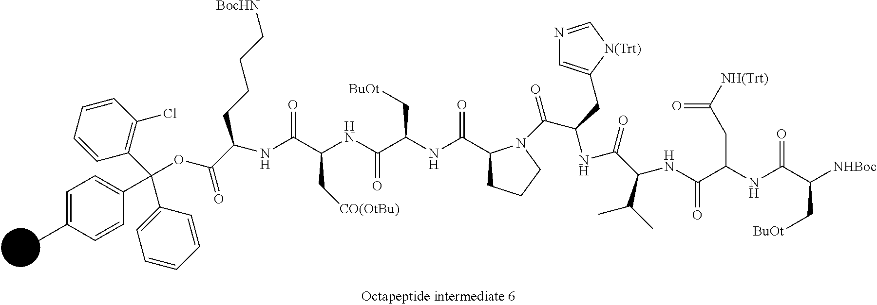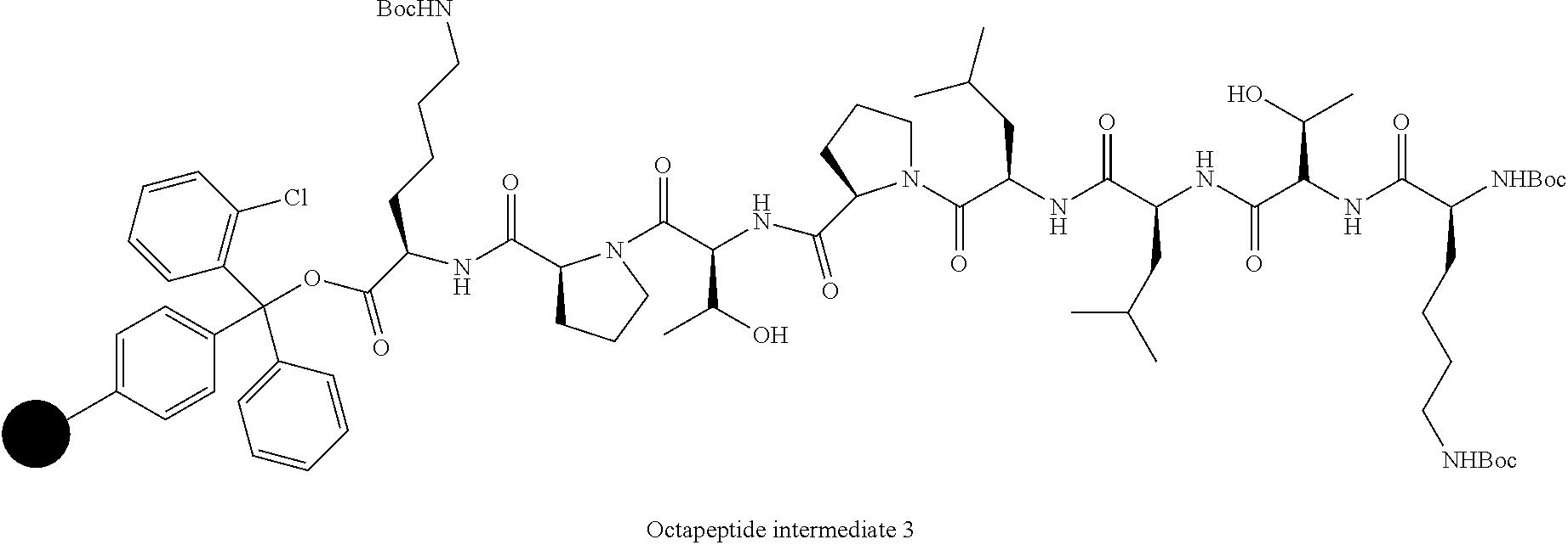 • iv. Removing the resin bound to octapeptide intermediate 6 obtained in step (iii) by treatment with TFA:DCM (0.5%, v/v) for 2 h at 0° C. to obtain a protected octapeptide intermediate 7;