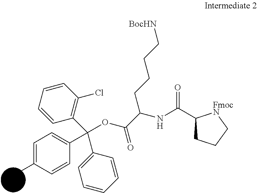 • i. Coupling Fmoc-Pro-OH with H-Lys(BOC)-2-ClTrt resin using HBTU and DIPEA in DMF at room temperature for 1.5 hour to obtain an intermediate