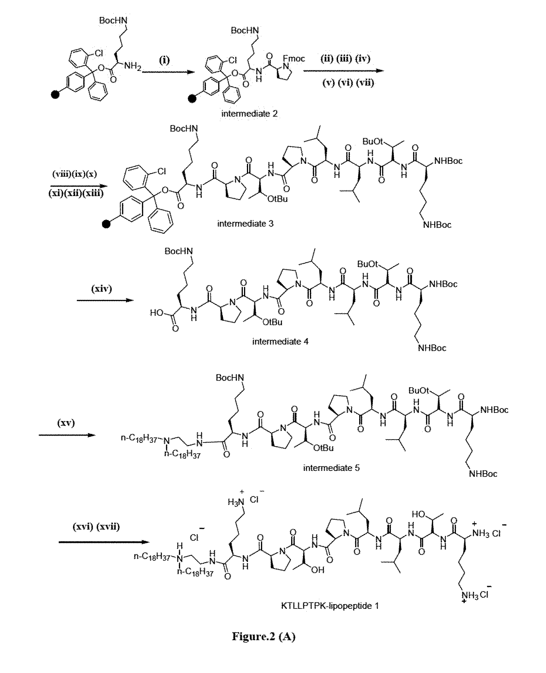 • vi. Deprotecting the KTLLPTPK-lipopeptide obtained in step (v) with TFA-DCM (95:5, v/v) to obtain a deprotected KTLLPTPK-lipopeptide; and