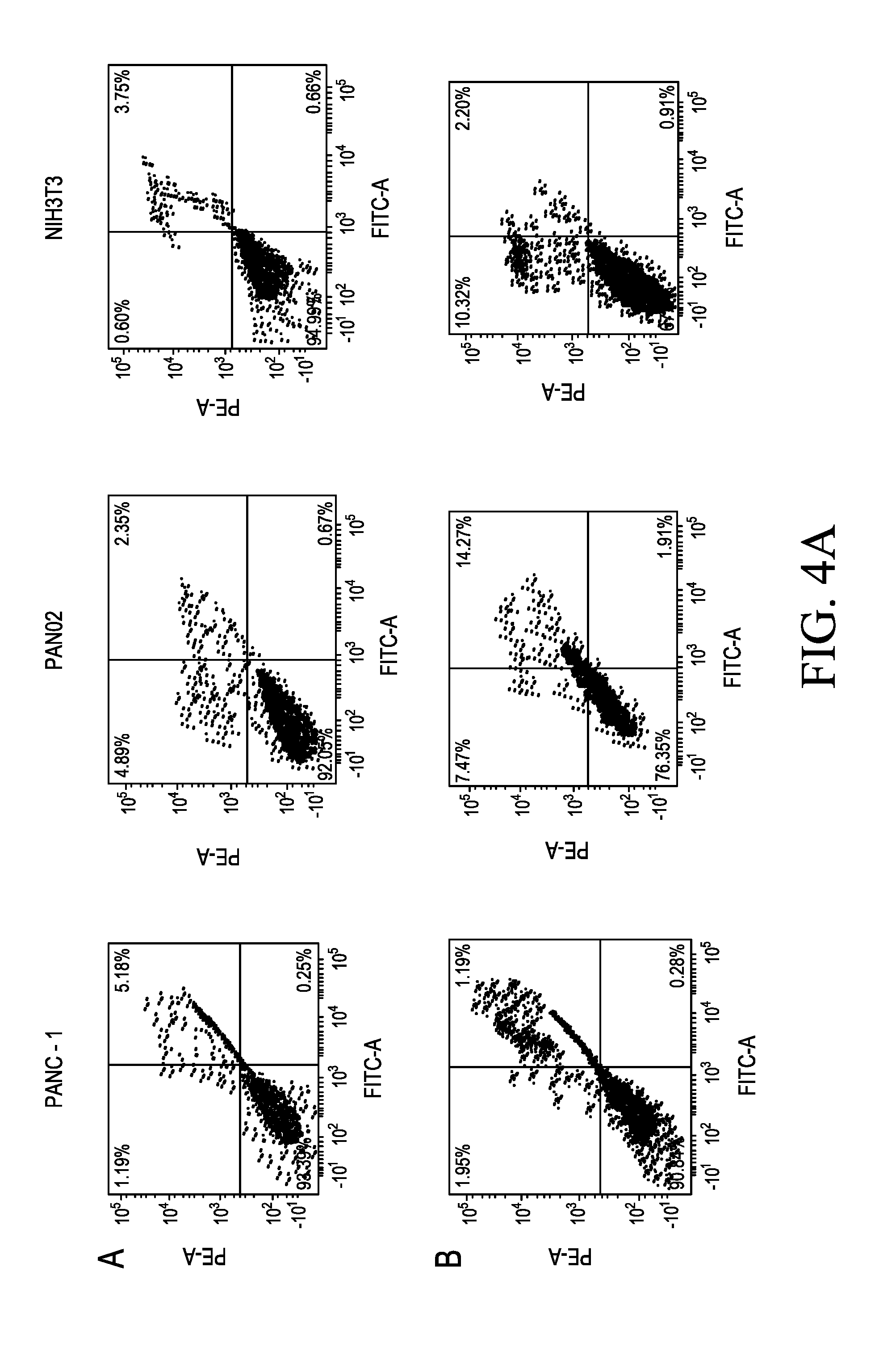 PANC-1, Pan02 and NIH-3T3 cells were seeded at a density of ˜1.5×105cells/well in a 6 well plate and cultured for 18-24 h. Pan02 and NIH-3T3 Cells were then treated for 4 h with: (B) curcumin (4 μM) solubilized in liposomes of KTLLPTPK-lipopeptide 1; (C) gemcitabine (200 nM) encapsulated in liposomes of KTLLPTPK-lipopeptide 1; (D) both curcumin (2 μM) and gemcitabine (100 nM) encapsulated in liposomes of KTLLPTPK-lipopeptide 1; and (E) both curcumin (2 μM); and gemcitabine (100 nM) co-encapsulated in non-targeting control liposomes of SNLHPSDK-lipoptide 2. PANC-1 Cells were then treated for 4 h with: (B) curcumin (8 μM) solubilized in liposomes of KTLLPTPK-lipopeptide 1; (C) gemcitabine (1000 nM) encapsulated in liposomes of KTLLPTPK-lipopeptide 1; (D) both curcumin (4 μM) and gemcitabine (500 nM) encapsulated in liposomes of KTLLPTPK-lipopeptide 1; and (E) both curcumin (4 μM); and gemcitabine (500 nM) co-encapsulated in non-targeting control liposomes of SNLHPSDK-lipoptide 2, An untreated cell (A) was used as control. In all the cases (A)-(E), the final volume of the complete media (RPMI-1640 containing 10% FBS, v/v) was 1.5 mL. After 4 h of incubation at 37° C., the media was replaced with 2 mL fresh complete medium and incubated for additional 24 h. Cells were then trypsinized, washed with PBS, centrifuged and the pellet was resuspended in 200 μL binding buffer containing Annexin-V FITC (0.25 μg) and Propidium iodide (PI) (1.0 μg). The mixture was then incubated for 15 min in dark and analyzed by flow cytometer (BD FACS Canto II). The degrees of apoptosis induced in pancreatic tumor cells were observed to be significantly higher when cells were treated with plectin 1 targeting liposomes of KTLLPTPK-lipopeptide 1 containing co-encapsulated curcumin & gemcitabine compared to those for cells treated with liposomes of KTLLPTPK-lipopeptide 1 containing only curcumin and only gemcitabine (FIG. 4). Degree of apoptosis induced was also found to be low in cells treated with non-targeting control liposomes of SNLHPSDK-lipopeptide 2 containing co-encapsulated curcumin & gemcitabine (FIG. 4). Such findings are consistent with synergistic effects of curcumin & gemcitabine in inducing apoptosis in pancreatic tumor (Pan02 and PANC-1) cells. Importantly, induction of apoptosis observed in non-cancerous healthy mouse fibroblast (NIH-3T3) cells was insignificant compared to that in pancreatic cancer cells (FIG. 4).