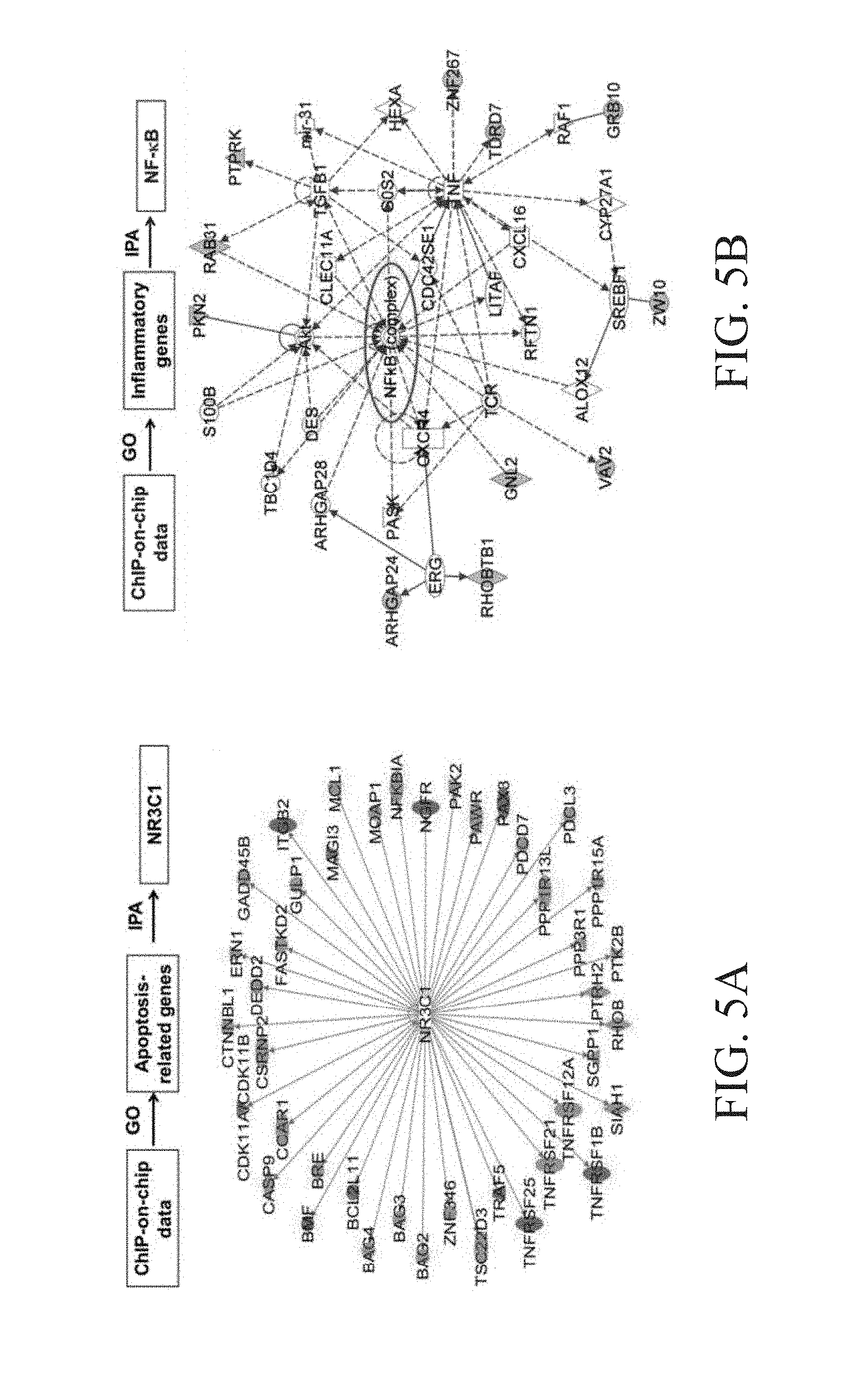 CHIP-on-chip analysis revealed that the binding of H3K27-acetylation to more than 10,000 genes has been altered by JMF3086. Those with two-fold down-regulation or up-regulation in log-ratio were selected and analyzed by Gene Ontology (GO) which categorized them into different biological functions, and the most significant ones were apoptosis and inflammation. Ingenuity Pathways Analysis (IPA) analysis predicted their regulation by NR3C1 and NF-κB, respectively (FIGS. 5A and 5B). JMF3086 inhibited the binding of H3K27-Ac to the gene promoters of inflammation and proliferation, stemness of cancer, and anti-apoptosis as well as reduced their mRNA expression. On the other hand, JM3086 increased the binding of H3K27-Ac to the gene promoters of tumor suppressors and also increased their mRNA expression (FIG. 5C).