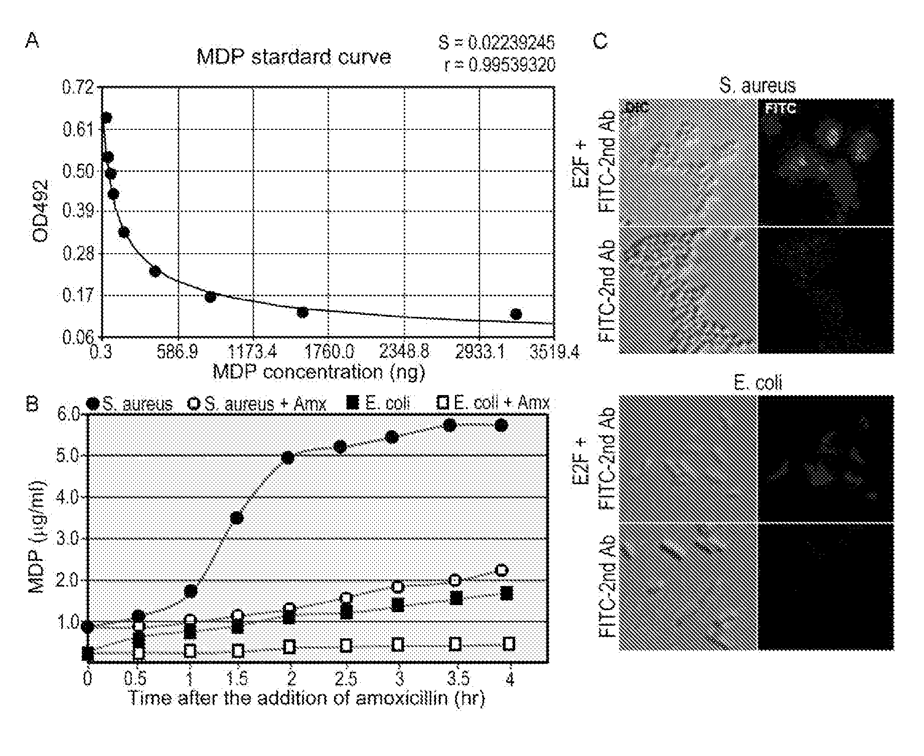 FIG. 1 shows the determination of the Kd value of one example of an antibody as described herein, which is the monoclonal antibody 2E7. To determine the Kd of 2E7 to N-acetylmuramyl-L-alanyl-D-glutamine, the bottom of wells of a 96-well plate was coated with MDP-OVA. 2-fold serial dilutions of 2E7 were added to the wells for incubation. After washes to remove unbound Abs, an anti-mouse-IgG Ab coupled with horseradish peroxidase (HSP) was added. After incubation, unbound secondary Ab was removed by washes and a chromogenic substrate of HSP was added. After reaction, the color intensity in each well was measured using a microtiter plate reader at 492 nm. A binding curve was generated using CurveExpert Basic program (http://www.curveexpert.net) by fitting 2E7 concentrations and OD492 values to the Weibull Model equation y=a−b*exp(−C*x̂d) using CurveExpert Basic. r: correlation coefficient; s: standard error. Coefficient data: a=2.8768241, b=2.8055033, c=212.44541, and d=0.8659833. Y50=1.45, X=0.00131 μg/ml. Kd=0.0131/[150×109]=8.7 pM (IgG MW=150).
