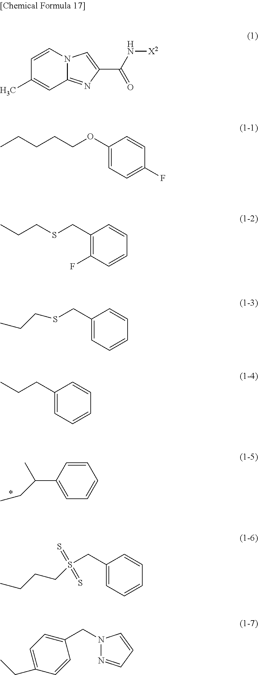 log(Brain/Blood)=−0.0148×PSA+0.152×log P+0.139Predicted Measured Predicted value value value Compound ID logP PSA Brain/Blood SR-4277 3.3 46 0.90 1.10 Famotidine −1.9 176 0.002 0.10 Series Common structure (expressed in a form of R—X: R is a common structure) 1 X (expressed in a form of —X: A symbol (*) is given to a Histamine bonding site in a compound uptake in which a bonding portion ratio with OCT3 logP Brain/Blood to a nitrogen atom (N) respect to inhibition Molecular predicted predicted Series Number Compound ID adjacent to X is not clear.) control (%) ratio (%) weight value value 1 1 SR- 5410 13.9 86.1 341 3.1 0.61 1 2 SR- 4277 15.4 84.6 343 3.3 0.90 1 3 SR- 5301 16.0 84 325 3.2 0.85 1 4 SR- 5349 17.1 82.9 279 2.8 0.74 1 5 SR- 5351 17.4 82.6 293 3.1 0.84 1 6 SR- 5315 24.3 75.7 371 1.4 0.14 1 7 SR- 5402 25.9 74.1 345 2.6 0.38 1 8 SR- 5406 29.2 70.8 325 2.2 0.33 1 9 SR- 5381 38.3 61.7 323 3.0 0.58 1 10 SR- 5403 40.3 59.7 339 2.6 0.37 1 11 SR- 5405 42.0 58 347 3.6 1.01 1 12 SR- 5355 45.1 54.9 295 2.3 0.46 1 13 SR- 5354 47.0 53 311 2.4 0.14 1 14 SR- 5370 52.2 47.8 245 2.3 0.64 1 15 SR- 5320 55.0 45 307 −0.2 0.08 1 16 SR- 5372 55.0 45 337 2.4 0.35 1 17 SR- 5326 56.9 43.1 348 2.8 0.68 1 18 SR- 5385 58.1 41.9 348 2.5 0.25 1 19 SR- 5333 58.3 41.7 295 2.3 0.46 1 20 SR- 5400 59.2 40.8 331 3.2 0.64 1 21 SR- 5379 60.3 39.7 269 2.9 0.78 1 22 SR- 5309 61.5 38.5 297 3.1 0.84 1 23 SR- 5310 61.8 38.2 283 2.6 0.70 1 24 SR- 5408 64.2 35.8 372 1.1 0.08 1 25 SR- 5308 65.0 35 297 3.1 0.84 1 26 SR- 5380 66.7 33.3 376 2.6 0.35 Series Common structure (expressed in a form of R—X: R is a common structure) 2 Histamine uptake ratio with OCT3 logP Brain/Blood X respect to inhibition Molecular predicted predicted Series Number Compound ID (expressed in a form of —X) control (%) ratio (%) weight value value 2 1 SR- 5335 55.6 44.4 325 2.6 0.20 2 2 SR- 5414 56.4 43.6 309 2.6 0.69 Series Common structure (expressed in a form of R—X: R is a common structure) 3 Histamine uptake ratio with OCT3 logP Brain/Blood X respect to inhibition Molecular predicted predicted Series Number Compound ID (expressed in a form of —X) control (%) ratio (%) weight value value 3 1 SR- 5340 41.6 58.4 334 2.5 0.83 3 2 SR- 5371 47.6 52.4 338 2.8 0.92 3 3 SR- 5344 50.6 49.4 446 4.6 1.71 3 4 SR- 5364 71.9 28.1 338 2.8 0.92 Series Common structure (expressed in a form of R—X: R is a common structure) 4 X (expressed in a form of —X: A symbol (*) is given to a Histamine bonding site in a compound uptake in which a bonding portion ratio with OCT3 logP Brain/Blood to a nitrogen atom (N) respect to inhibition Molecular predicted predicted Series Number Compound ID adjacent to X is not clear.) control (%) ratio (%) weight value value 4 1 SR- 4229 38.7 61.3 366 3.3 0.40 Series Common structure (expressed in a form of R—X: R is a common structure) 5 X (expressed in a form of —X: A symbol (*) is given to a Histamine bonding site in a compound uptake in which a bonding portion ratio with OCT3 logP Brain/Blood to a nitrogen atom (N) respect to inhibition Molecular predicted predicted Series Number Compound ID adjacent to X is not clear.) control (%) ratio (%) weight value value 5 1 SR- 4281 58.5 41.5 353 4.6 1.09 5 2 SR- 4233 72.6 27.4 397 4.2 0.66 Series Common structure (expressed in a form of R—X: R is a common structure) 6 X (expressed in a form of —X: A symbol (*) is given to a Histamine bonding site in a compound uptake in which a bonding portion ratio with OCT3 logP Brain/Blood to a nitrogen atom (N) respect to inhibition Molecular predicted predicted Series Number Compound ID adjacent to X is not clear.) control (%) ratio (%) weight value value 6 1 SR- 4234 66.7 33.3 396 2.7 0.63 Series Common structure (expressed in a form of R—X: R is a common structure) 7 X (expressed in a form of —X: A symbol (*) is given to a Histamine bonding site in a compound uptake in which a bonding portion ratio with OCT3 logP Brain/Blood to a nitrogen atom (N) respect to inhibition Molecular predicted predicted Series Number Compound ID adjacent to X is not clear.) control (%) ratio (%) weight value value 7 1 SR- 4290 47.9 52.1 388 3.1 0.54 7 2 SR- 4214 49.5 50.5 374 2.5 0.44 7 3 SR- 4207 54.8 45.2 353 3.7 1.05 7 4 SR- 4280 59.0 41 341 1.9 0.40 Series Common structure (expressed in a form of R—X: R is a common structure) 8 Histamine uptake ratio with OCT3 logP Brain/Blood X respect to inhibition Molecular predicted predicted Series Number Compound ID (expressed in a form of —X) control (%) ratio (%) weight value value 8 1 SR- 5327 54.5 45.5 355 2.7 0.73 8 2 SR- 5321 56.7 43.3 391 4.0 1.16 SR-4277 8.2 SR-4056 12.7 SR-4229 25.3 SR-4241 25.5 SR-4272 27.2 SR-4211 29.6 SR-4061 30.8 SR-4059 38.0 SR-4074 48.8 Famotidine 67.6 Example 2