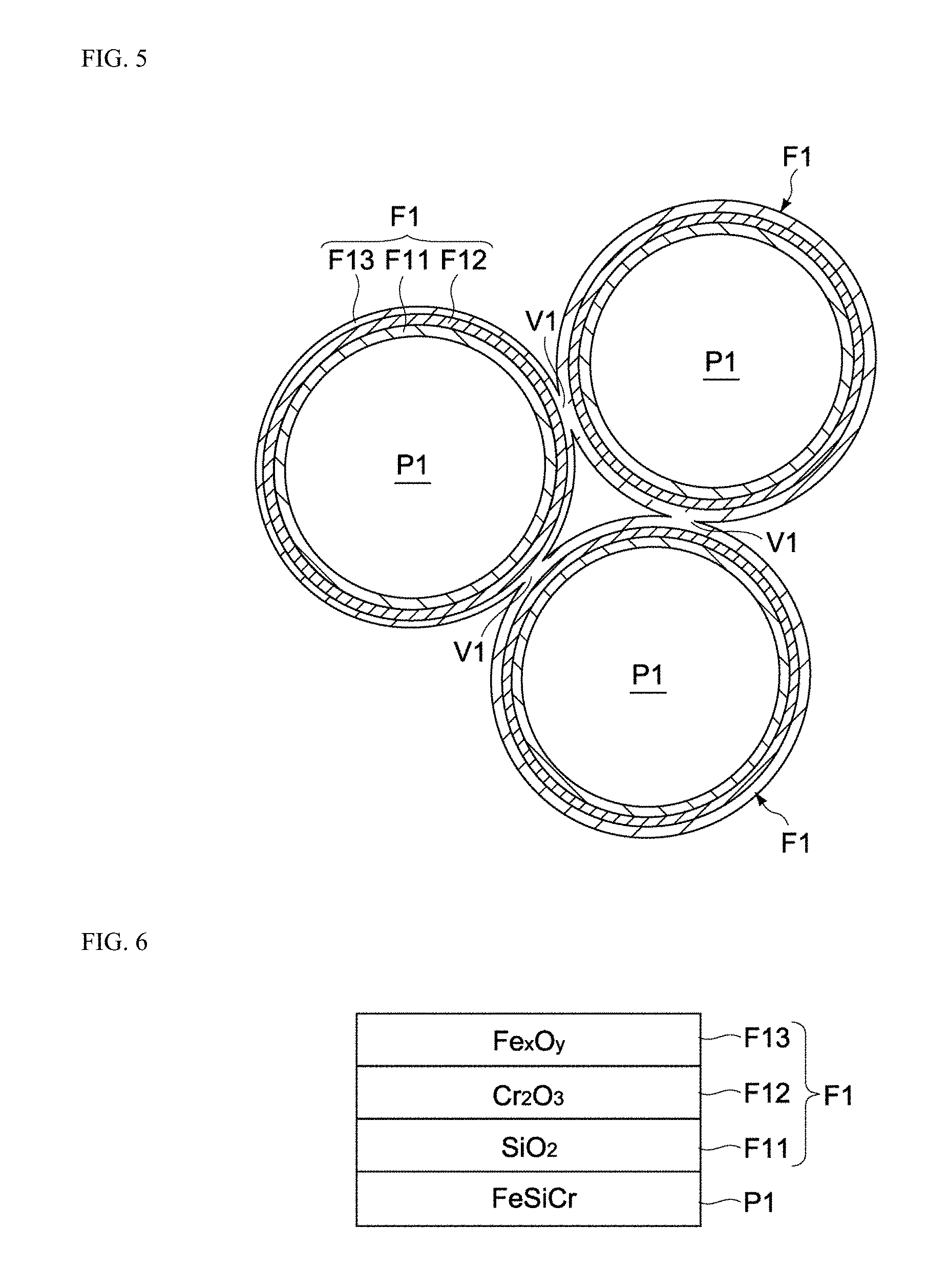 Magnetic body Material powder First oxide film Second oxide film Third oxide film Fourth oxide film Alloy grain Coating material Component Component Component Component Grain size [μm] Thickness [nm] Thickness [nm] Thickness [nm] Thickness [nm] Thickness [nm] Comparative FeSicr 6 SiO2 30 Si 5 Cr 11 Fe 71 — — Example Example 1 FeSiCr 6 SiO2 15 Si 5 Cr 11 Si 15 Fe 20 Example 2 FeSiCr 6 SiO2 1 Si 5 Cr 11 Si 1 Fe 60 Example 3 FeSiCr 6 SiO2 5 Si 5 Cr 11 Si 5 Fe 40 Example 4 FeSiCr 6 SiO2 11 Si 5 Cr 11 Si 11 Fe 30 Example 5 FeSiCr 6 ZrO2 15 Si 5 Cr 11 Zr 15 Fe 20 Example 6 FeSiCr 6 HfO2 15 Si 5 Cr 11 Hf 15 Fe 20 Example 7 FeZrCr 6 TiO2 15 Si 5 Cr 11 Ti 15 Fe 20 Example 8 FeSiAl 6 SiO2 15 Si 5 Al 15 Si 15 Fe 20 Example 9 FeZrCr 6 SiO2 15 Zr 5 Cr 11 Si 15 Fe 20 Example 10 FeSiCr 6 SiO2 20 Si 5 Cr 11 Si 20 Fe 20 Example 11 FeSiCr 6 SiO2 24 Si 5 Cr 11 Si 24 Fe 15 Example 12 FeSiCr 2 SiO2 1 Si 5 Cr 11 Si 1 Fe 60 Example 13 FeSiCr 1 SiO2 1 Si 5 Cr 11 Si 1 Fe 60 Comparative 20 1.1 × 101 7.0 × 10−4 7 Example Example 1 27 2.7 × 103 1.3 × 10−2 10 Example 2 36 7.1 × 101 5.3 × 10−3 14 Example 3 34 3.2 × 102 7.8 × 10−3 12 Example 4 30 3.2 × 102 7.8 × 10−3 11 Example 5 27 2.5 × 103 1.1 × 10−2 10 Example 6 26 2.4 × 103 1.2 × 10−2 10 Example 7 27 2.5 × 103 1.1 × 10−2 10 Example 8 25 3.0 × 103 1.1 × 10−2 11 Example 9 27 2.0 × 103 1.1 × 10−2 10 Example 10 25 4.1 × 103 1.1 × 10−2 10 Example 11 21 5.0 × 103 8.0 × 10−3 8 Example 12 21 8.0 × 101 6.6 × 10−3 12 Example 13 10 1.0 × 102 1.2 × 10−2 13