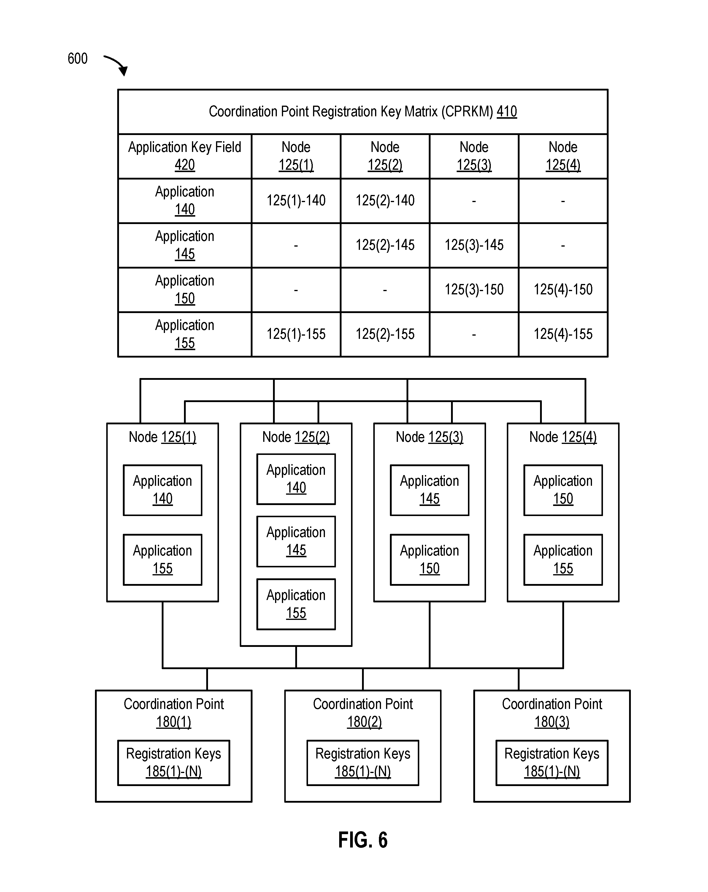 generating one or more other identifiers for the one or more instances of the one or more other applications, wherein the one or more other identifiers associate each of the one or more instances of the one or more other applications and the node, and installing the one or more other identifiers on the one or more coordination points. 19. The system of the identifier is a registration key, the one or more other identifiers are one or more other registration keys, and the registration key and the one or more other registration keys are part of the plurality of registration keys 20. The system of generating a coordination point registration key matrix, wherein