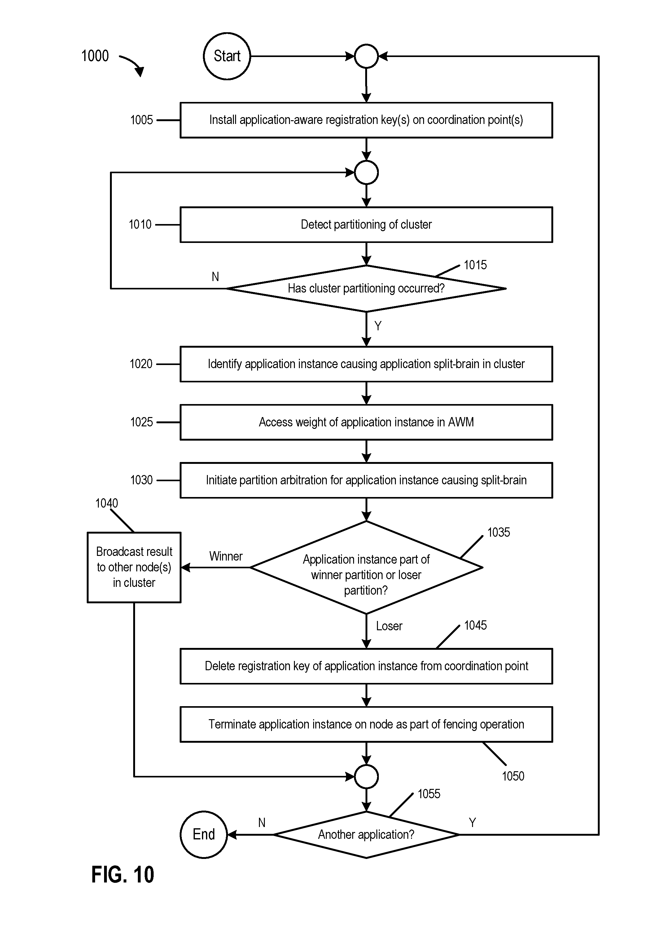 a total node weight; transmitting the application weight matrix to each node of the plurality of nodes that is communicatively coupled to the node; determining whether the cluster is partitioned into a plurality of network partitions; determining whether a split-brain condition exists in the cluster as a result of the partitioning, wherein