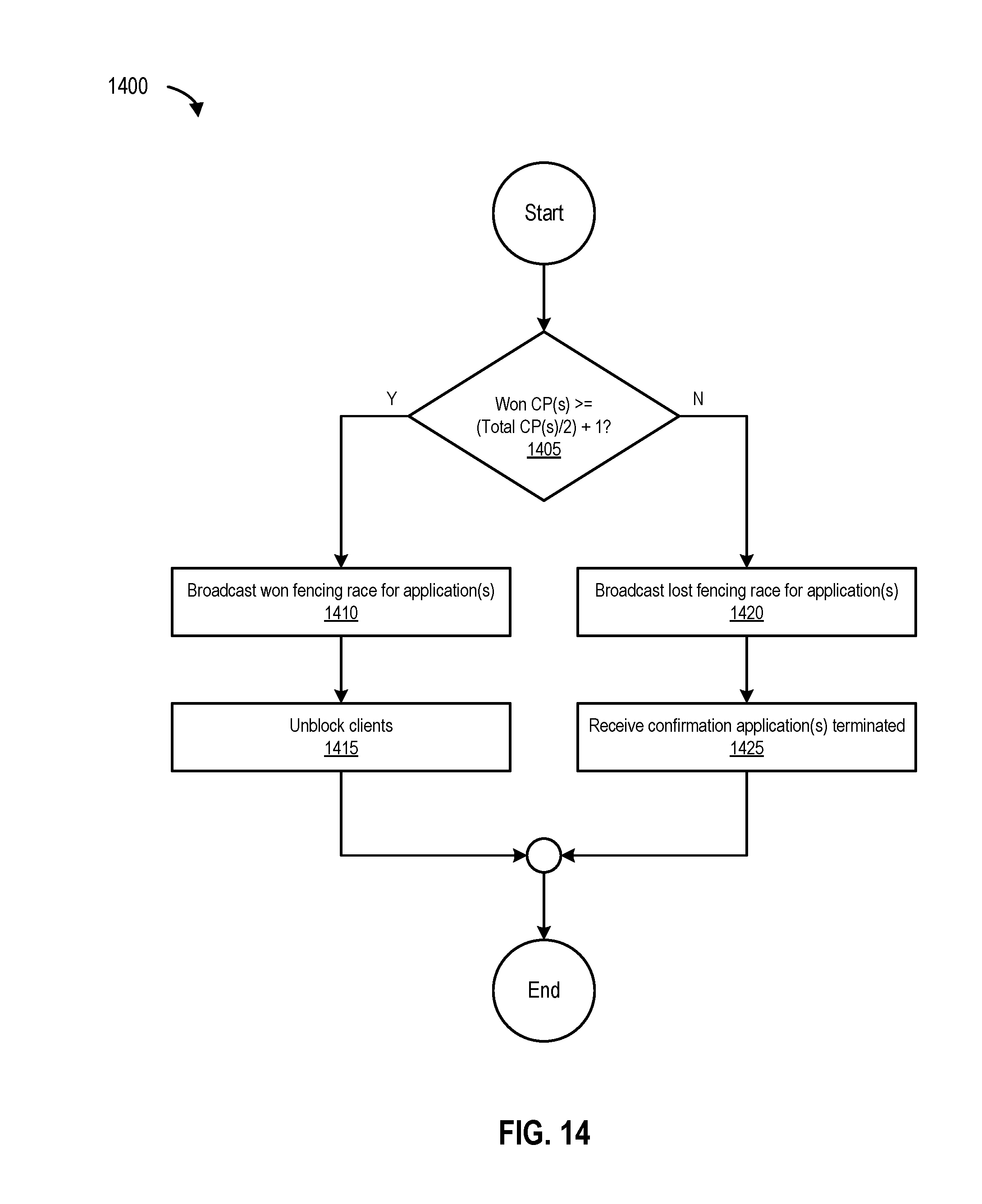 the split-brain condition is caused by one or more application instances of the plurality of application instances executing on the one or more nodes of the plurality of nodes; performing an application fencing operation to rectify the split-brain condition, wherein the application fencing operation comprises, at least in part,