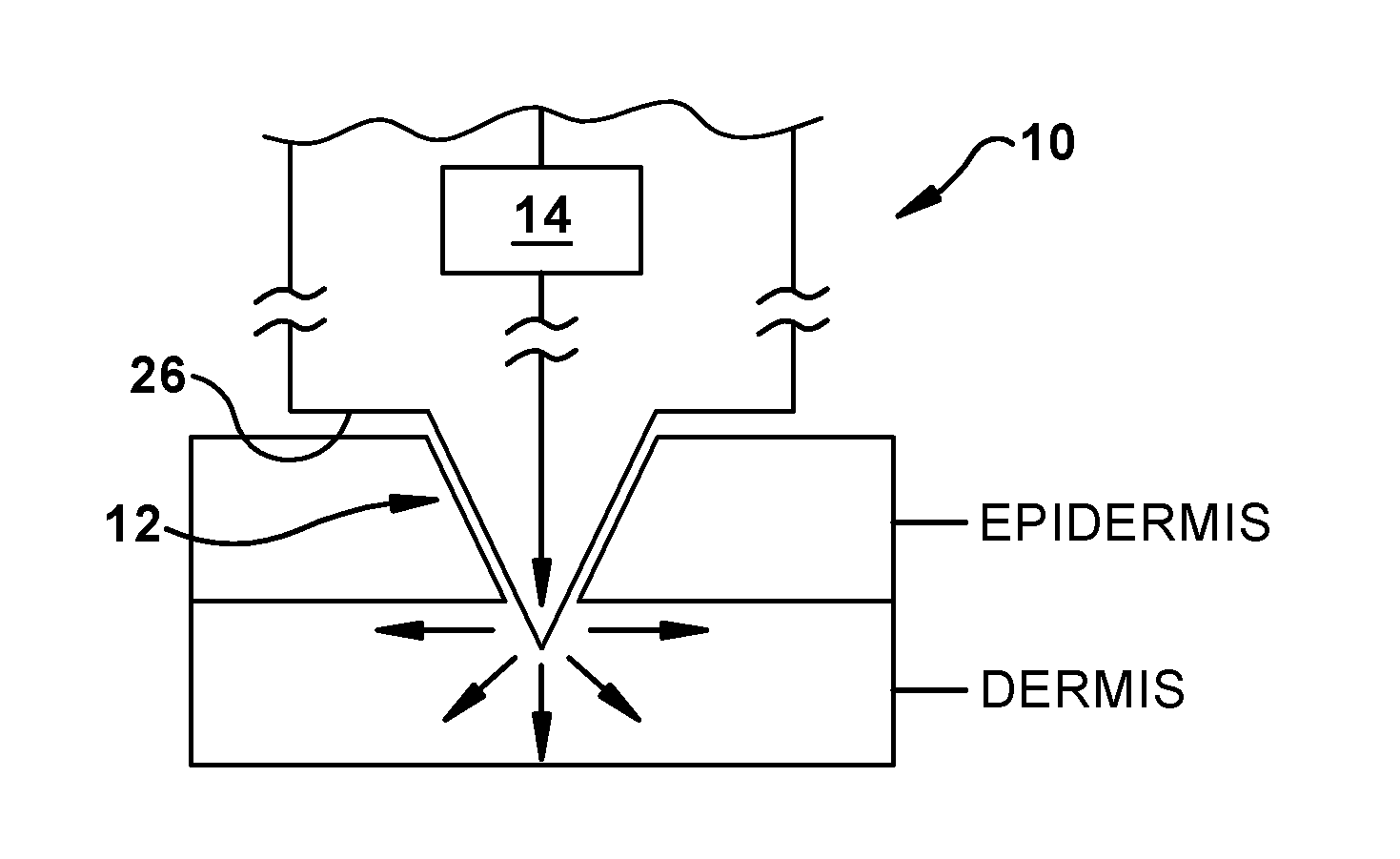 at least one penetration member having a body defined by oppositely disposed proximal and distal ends, the body having a length such that at least a portion of the distal end extends into a dermis of the skin of a subject when the device is contacted with the subject's skin; and a laser source coupled to the at least one penetration member so that, upon activation, the laser source delivers a laser beam into the dermis for a time sufficient to induce leakage or rupture of at least one blood vessel comprising the dermis. 2. The device of 3. The device of 4. The device of 5. The device of 6. The device of 7. The device of 8-12. (canceled) 13. The device of a memory storing computer-executable instructions; and a processor to access the memory and execute the computer-executable instructions to at least: