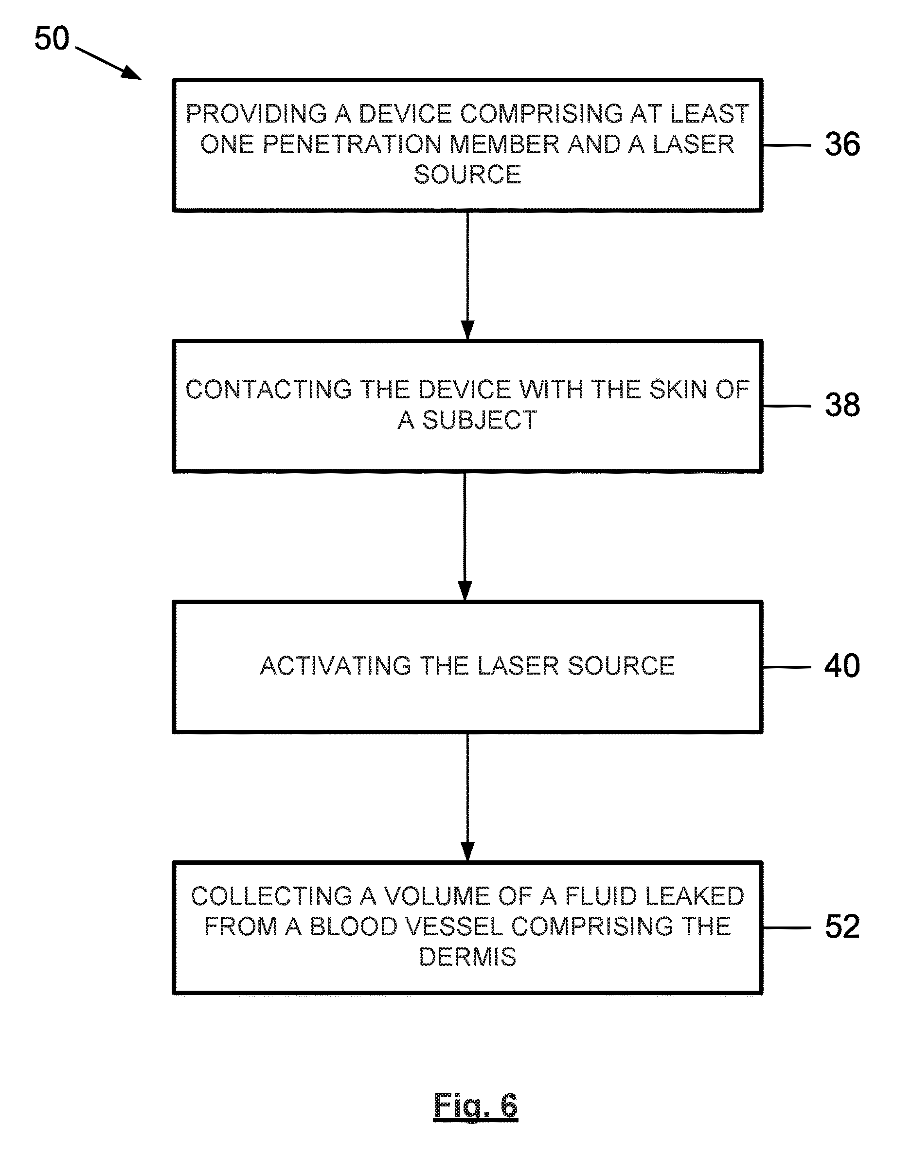 contacting a device with the skin of a subject so that at least a distal end of one or more penetrating members comprising the device directly contacts the dermis; activating a laser source coupled to the device to deliver a laser beam to the dermis for a time sufficient to induce leakage or rupture of at least one blood vessel comprising the dermis; and collecting a volume of a fluid leaked from the at least one blood vessel. 34. The method of 35. The method of 36-39. (canceled)