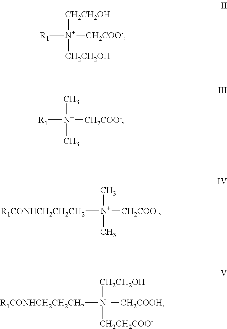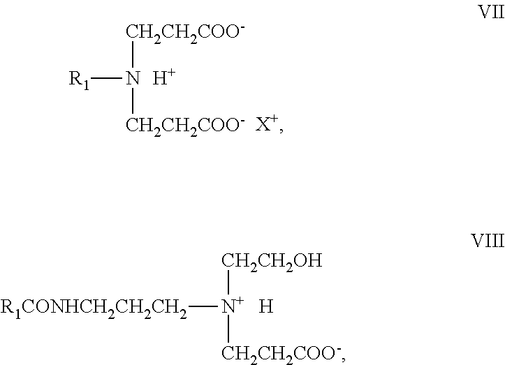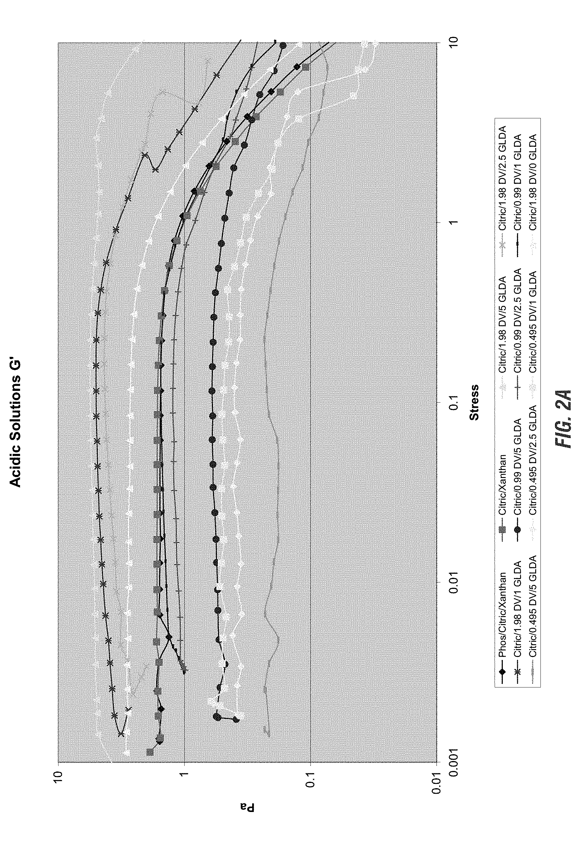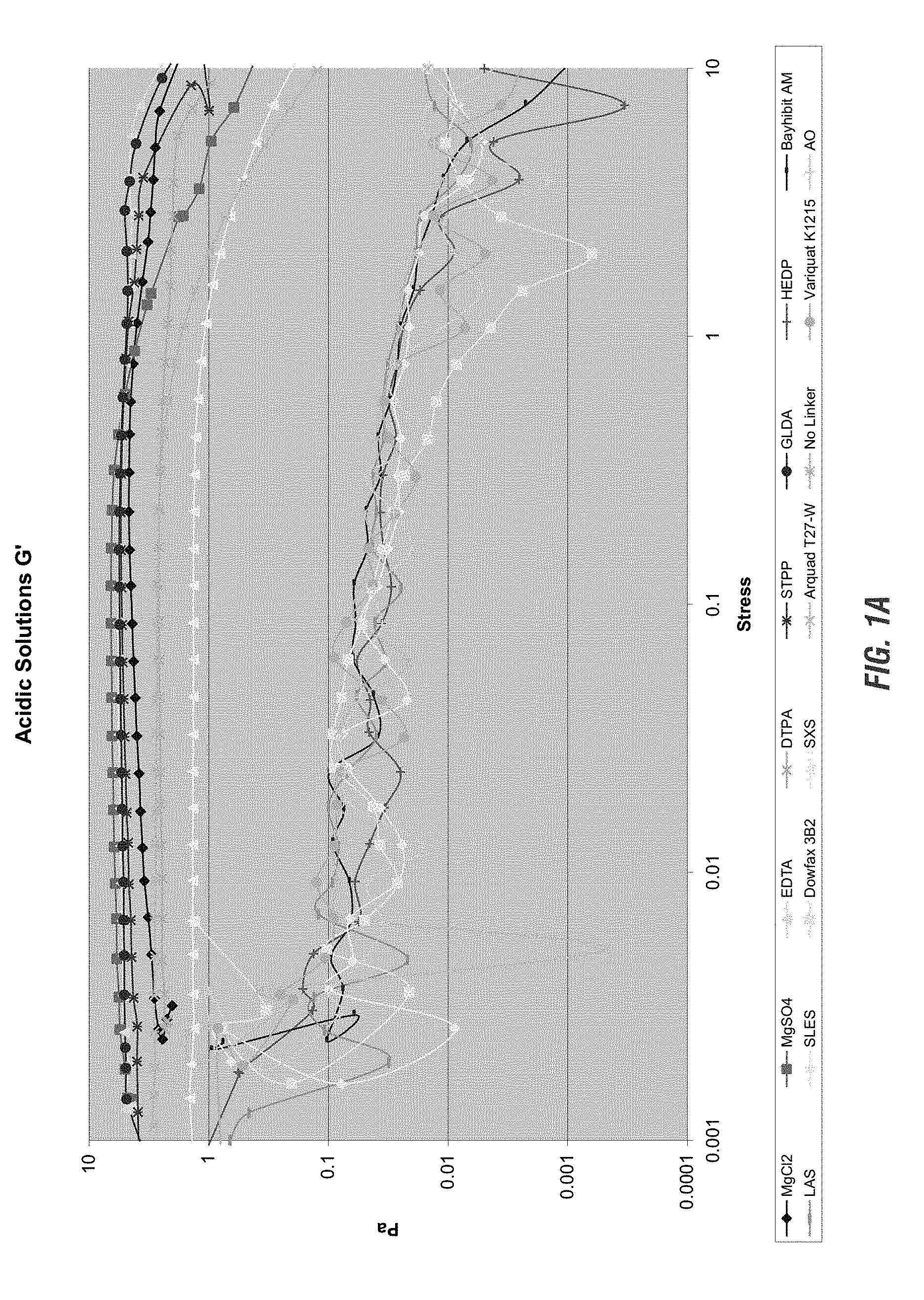 The acid constituent may be one or more water soluble inorganic acids, mineral acids, or water soluble organic acids, with virtually all such known materials contemplated as being useful in the present inventive compositions. Exemplary inorganic acids for use in the present invention include phosphoric acid, potassium dihydrogenphosphate, sodium dihydrogenphosphate, sodium sulfite, potassium sulfite, sodium pyrosulfite (sodium metabisulfite), potassium pyrosulfite (potassium metabisulfite), acid sodium hexametaphosphate, acid potassium hexametaphosphate, acid sodium pyrophosphate, acid potassium pyrophosphate and sulfamic acid. Alkyl sulfonic acids, e.g., methane sulfonic acid may also be used as a component of the acid system. Strong inorganic acids such as hydrochloric acid, nitric acid and sulfuric acid may also be used, however are less preferred due to their strong acid character; if present are present in only minor amounts in the acid system. The use of water soluble acids are preferred, including water soluble salts of organic acids. Exemplary organic acids are those which generally include at least one carbon atom, and include at least one carboxyl group (—COOH) in its structure. Exemplary useful water soluble organic acids which contain from 1 to about 6 carbon atoms, and at least one carboxyl group as noted. Exemplary useful organic acids include: Exemplary organic acids which may be used include linear aliphatic acids such as acetic acid, citric acid, propionic acid, butyric acid and valeric acid; dicarboxylic acids such as oxalic acid, malonic acid, succinic acid, glutaric acid, adipic acid, pimelic acid, fumaric acid and maleic acid; acidic amino acids such as glutamic acid and aspartic acid; and hydroxy acids such as glycolic acid, lactic acid, hydroxyacrylic acid, .alpha.-hydroxybutyric acid, glyceric acid, tartronic acid, malic acid, tartaric acid and citric acid, as well as acid salts of these organic acids. The acid constituent may be present in any effective amount, but desirably is not present in amounts of more than about 20% wt. based on the total weight of the compositions. It is to be understood that the nature of the acid or acids selected to form the acid constituent will influence the amount of acid required to obtain a desired final pH or pH range, and the precise amount of acid required for a specific composition can be readily obtained by a skilled artisan utilizing conventional techniques. Further, the amount of acid present in the composition, keeping in mind any optional ingredients that may be present, should be in an amount such that the pH of the composition is about 5 or less, and especially within the preferred pH ranges indicated previously. Generally however, the inclusion of the acid constituent in an amount of from about 0.1 to 20% wt., more preferably from about 3 to15% wt. Particularly preferred acids for use in the acid constituent and particularly preferred amounts thereof are described with reference to one or more of the Examples. As can be seen from the examples herein, particularly in alkaline conditions, a fairly large amount of the viscoelastic surfactant is required to achieve high levels of viscoelasticity. Additionally, in alkaline conditions, there is an adverse affect from the addition of caustic that needs to be overcome. Cleaning compositions made according to the invention may further include additional functional materials or additives that provide a beneficial property, e.g., for a particular use. Examples of conventional additives include one or more of each of salt or additional salt, chelating/sequestering agent, alkalinity source, surfactant, detersive polymer, cleaning agent, rinse aid composition, softener, pH modifier, source of acidity, anti-corrosion agent, secondary hardening agent, solubility modifier, detergent builder, detergent filler, defoamer, anti-redeposition agent, antimicrobial, rinse aid compositions, a threshold agent or system, aesthetic enhancing agent (i.e., dye, odorant, perfume), optical brighteners, lubricant compositions, bleaching agent or additional bleaching agent, enzyme, effervescent agent, activator for the active oxygen compound, other such additives or functional ingredients, and the like, and mixtures thereof. Adjuvants and other additive ingredients will vary according to the type of composition being manufactured, and the intended end use of the composition. The cleaning compositions of the invention may include a polar carrier media, such as water, alcohols, for example low molecular weight primary or secondary alcohols exemplified by methanol, ethanol, propanol, isopropanol, and the like, or other polar solvents, or mixtures and combinations thereof. Polar carrier may be present in the composition in the range of about 10 to about 90%, in the range of about 20 to about 80%, or in the range of about 25 to 75% by weight based on the total weight of the composition. The compositions may also include additional materials, such as additional functional materials, for example enzymes, enzyme stabilizing system, additional surfactant, chelating agents, sequestering agents, bleaching agents, additional thickening agent, solubility modifier, detergent filler, defoamer, anti-redeposition agent, a threshold agent or system, aesthetic enhancing agent (i.e. dye, perfume, etc.) and the like, or combinations or mixtures thereof. Adjuvants and other additive ingredients will vary according to the type of composition being manufactured and can be included in the compositions in any amount. The following is a brief discussion of some examples of such additional materials. The composition of the invention may include one or more enzymes, which can provide desirable activity for removal of protein-based, carbohydrate-based, or triglyceride-based stains from substrates; for cleaning, destaining, and sanitizing presoaks, such as presoaks for flatware, cups and bowls, and pots and pans; presoaks for medic