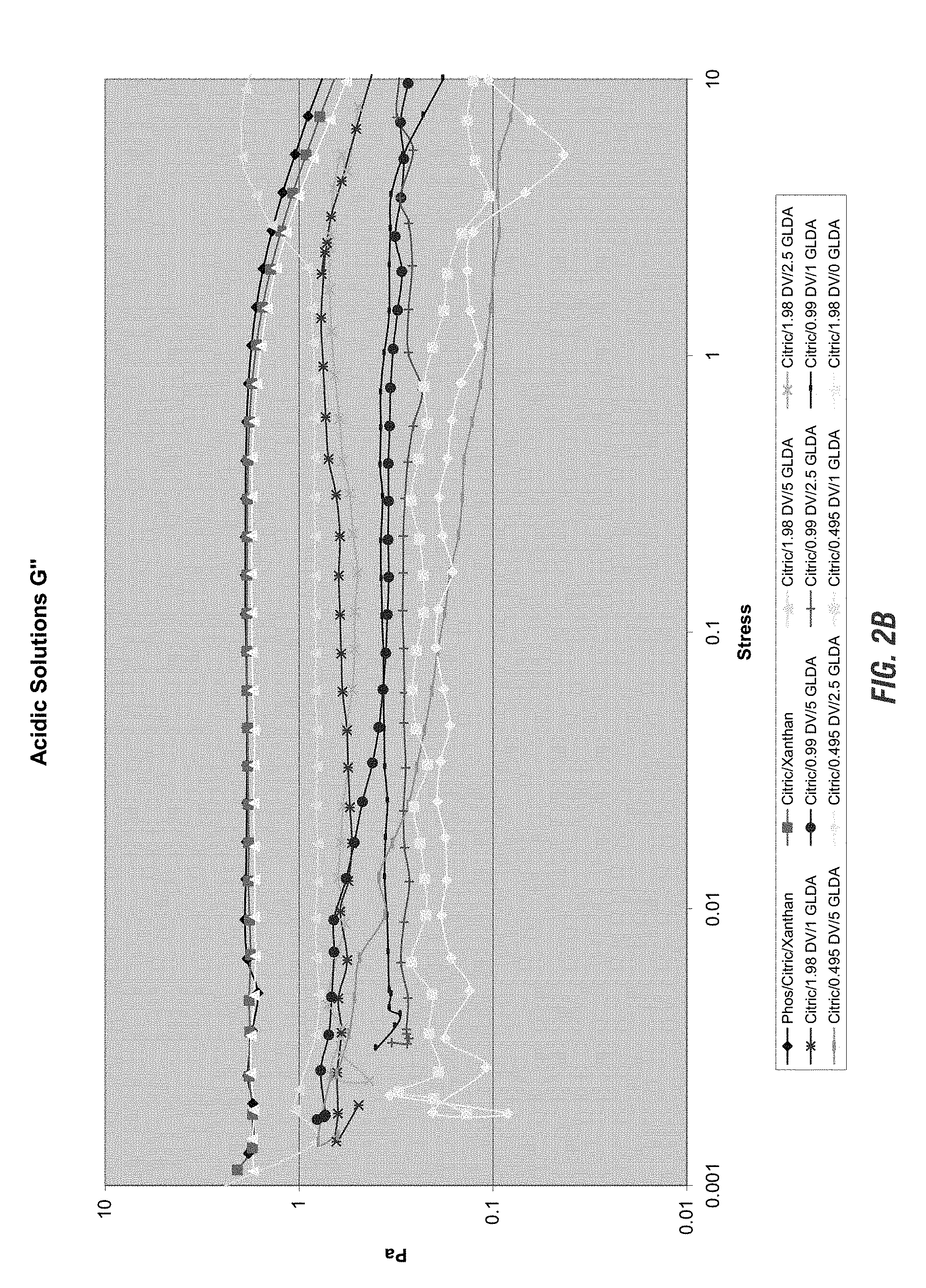 G′ and G″ values are showing in Increase MgSO4 Simple Salt 2+ 2- EDTA Simple Salt/Chelant 1+ (4) 4- (Ethylenediaminetetraacetic acid) Carboxyl(4), Amine(2) GLDA (glutamic acid diacetic Simple Salt/Chelant 1+ (4) 4- acid, tetra sodium salt) Carboxyl (4), amine (1) STPP (sodium tripolyphosphate) Simple Salt/Chelant 1+ (5) 5- Phosphonate (2), PO- (1) MgCl2 Simple Salt 2+ 1- (2) Approx. = DTPA (Diethylene triamine Simple Salt/Chelant 1+ (5) 5- pentaacetic acid) Carboxyl (5), amine (3) Slight SXS (Sodium xylene sulfonate) Anionic Surfactant/ 1+ 1- Decrease Hydrotrope Sulfate (1), cyclic (1) Decrease Dequest 2010 (1-Hydroxy Simple Salt/Chelant 1+ (5) 5- Ethylidene-1,1-Diphosphonic Phosphonate (2), CO- (1) Acid) Bayhibit AM (Phosphonobutane Simple Salt/Chelant 1+ (5) 5- tricarboxylic acid) Carboxyl (3), phosphorate (1) SLES (Sodium Lauryl Ether Anionic Surfactant 1+ 1- Sulfate) Sulfate (1), C12 Alcohol, EOn LAS (Sodium dodecyl benzene Anionic Surfactant 1+ 1- sulfonate) Sulfate(1), cyclic(1), C12 Alcohol Dowfax 3B2 (Alkyldiphenyloxide Anionic Surfactant/ 1+ (2) 2- Disulfonate) Hydrotrope Sulfate(2), cyclic (2), C10 Alcohol Variquat K1215 Cationic Surfactant Arquad T27-W Cationic Surfactant Amine Oxide Amphoteric Surfactant