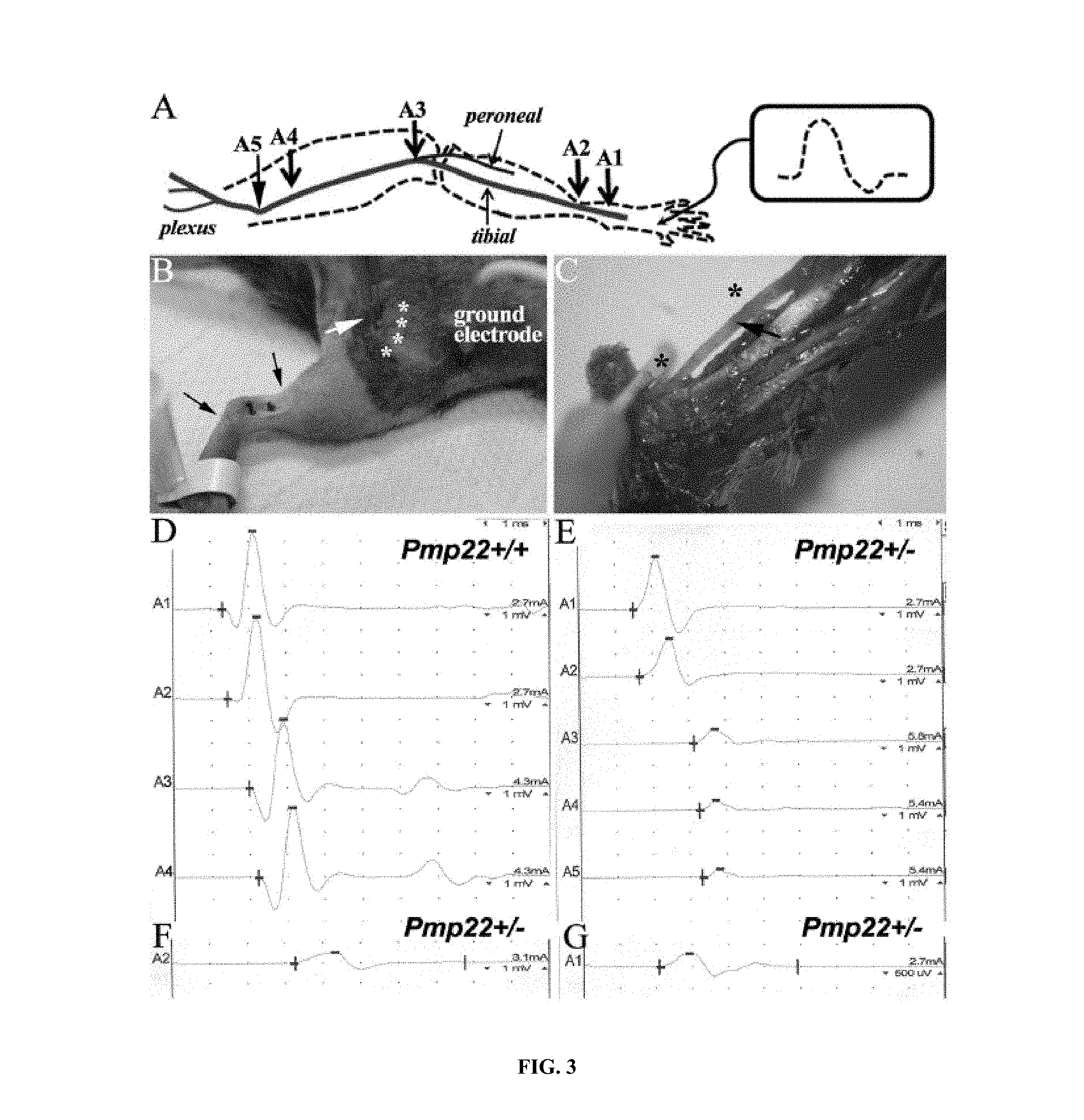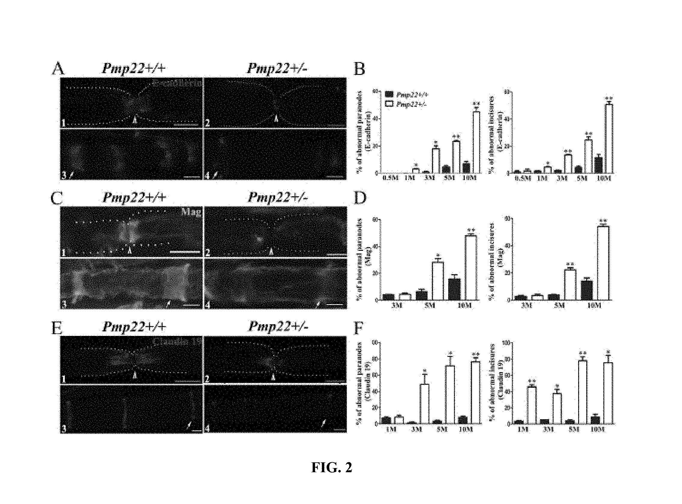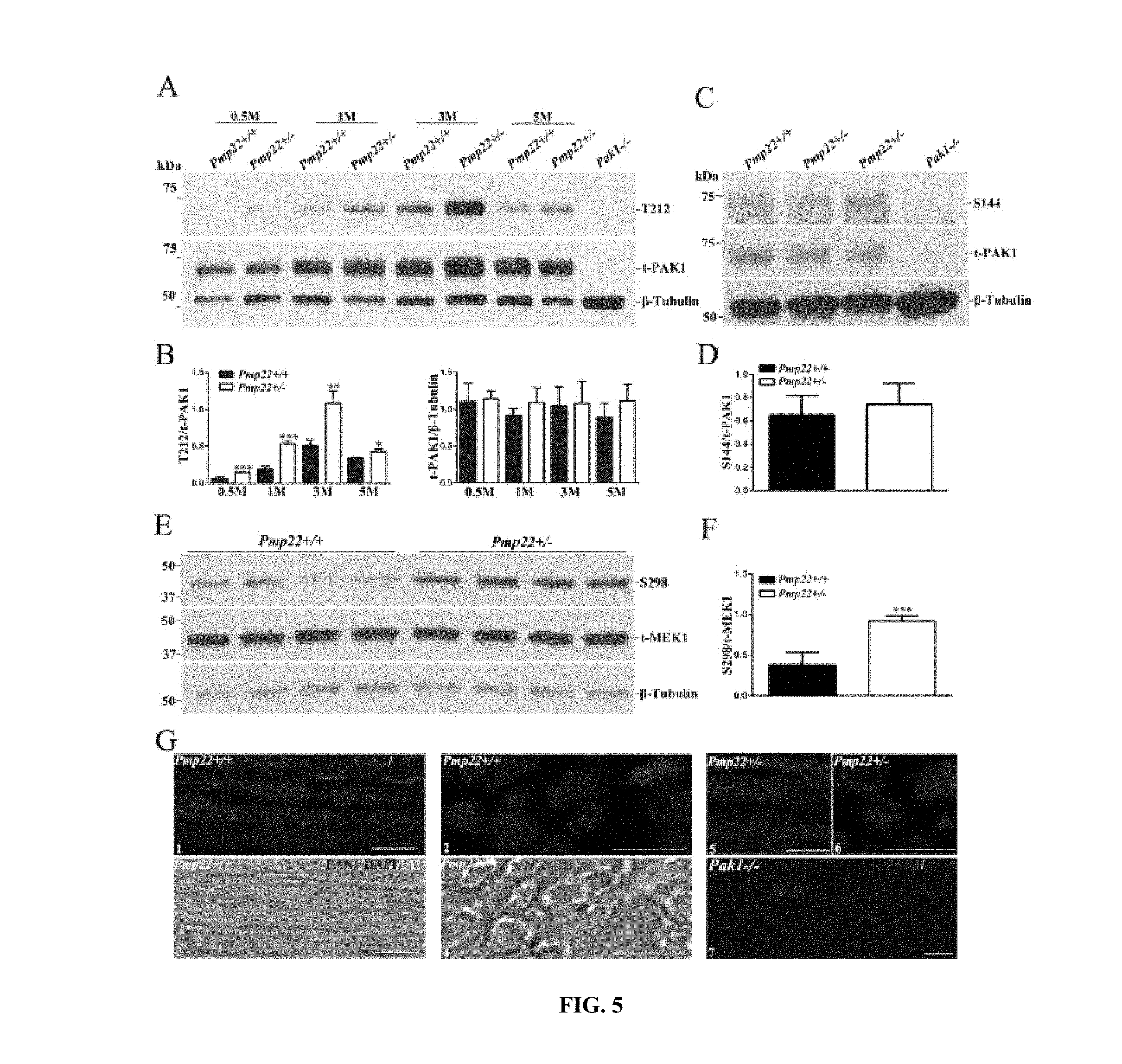 1 week old at start of injection (prior to tomacula formation) mouse Ratio % % abnormal Ratio number drug dose CV(m/s) (T212/PAK1) Tomacula Claudin-19 (S298/MEK1) Vehicle n = 8 0.25 mg/kg/day; 20.3 ± 1.5 0.75 ± 0.0 35.8 ± 5.5 55.7 ± 16.6a 39.5 ± 4.5b 0.90 ± 0.1 (4F/4M) via I.P.; PF-3758309 n = 8 duration = 17.8 ± 3.0 0.61 ± 0.0 27.3 ± 4.5 36.5 ± 18.4a 27.7 ± 4.6b 0.39 ± 0.2 (3F/5M) 11 weeks P value 0.069 0.015 0.028 0.045 0.010 0.004 6-11 month age at start of injection (after tomacula reached their peak prevalence) mouse Ratio % Tomacula % Tomacula % abnormal number drug dose CV(m/s) (T212/PAK1) +outlier −outlier Claudin-19 Vehicle n = 8 0.25 mg/kg/day; 24.6 ± 3.4 0.34 ± 0.1 29.1 ± 3.0 29.1 ± 3.0 66.3 ± 8.7a (3F/5M) via I.P.; PF-3758309 n = 8 duration = 19.7 ± 11.1 0.26 ± 0.1 25.2 ± 7.5 22.8 ± 4.3d 43.5 ± 13.3a (4F/4M) 4 weeksc P value 0.628 0.037 0.228 0.010 0.012 a Quantification of paranodes with abnormal claudin-19 staining. b Quantification of incisures with abnormal claudin-19 staining. c At the 4th week of injection, NCS already detected a significant difference. Thus, the treatment was terminated earlier than 12 weeks for this group of mice. d An outlier was taken off from the PF-3758309 group. REFERENCES
