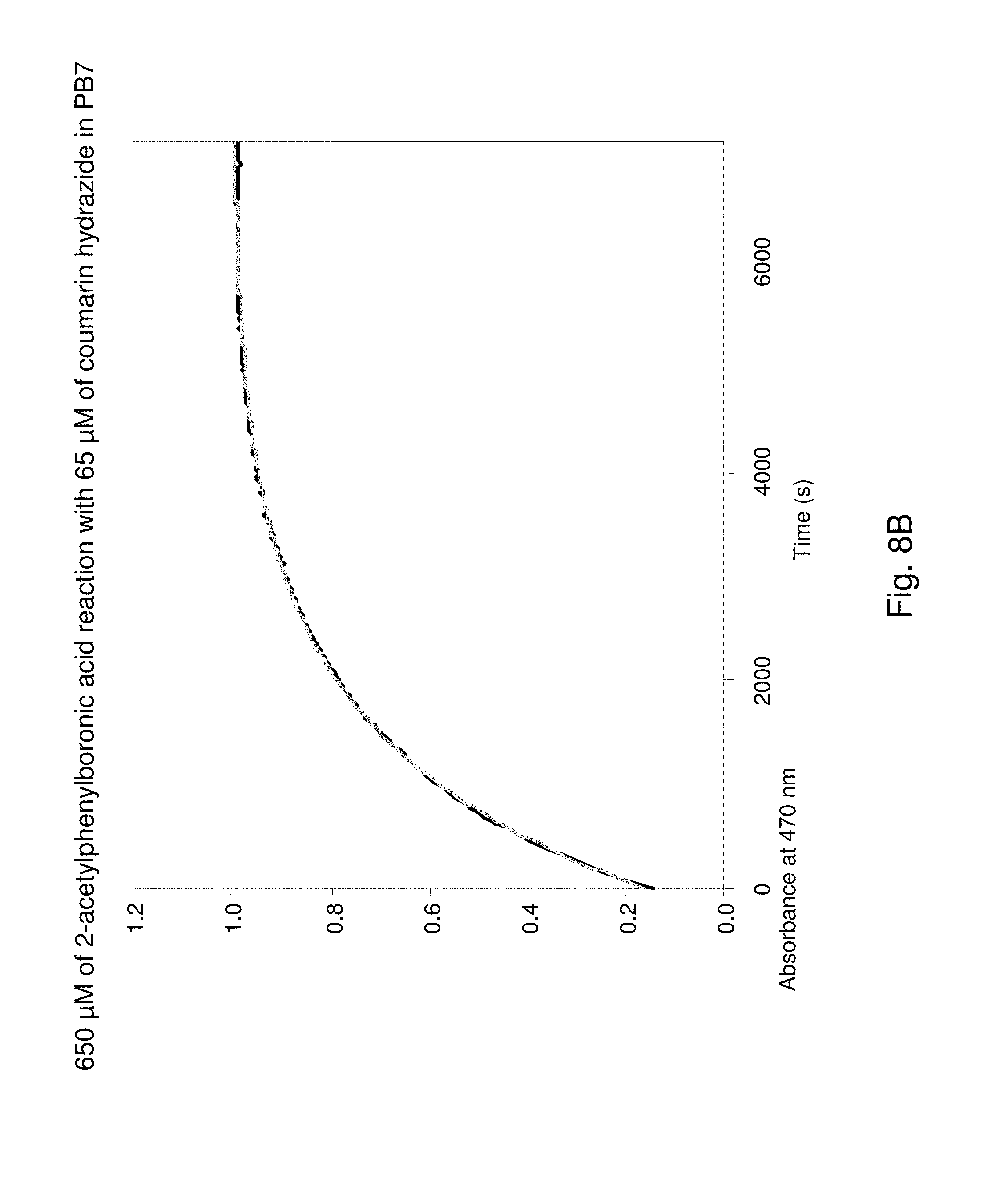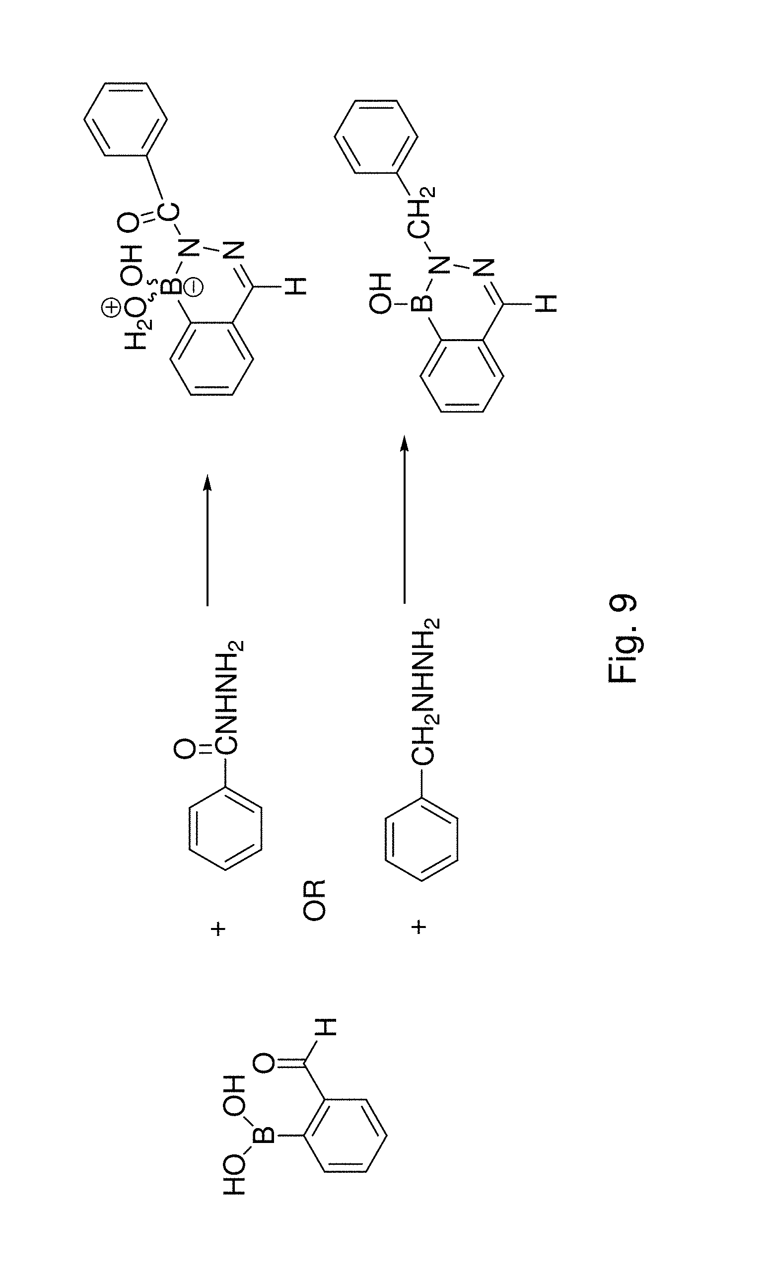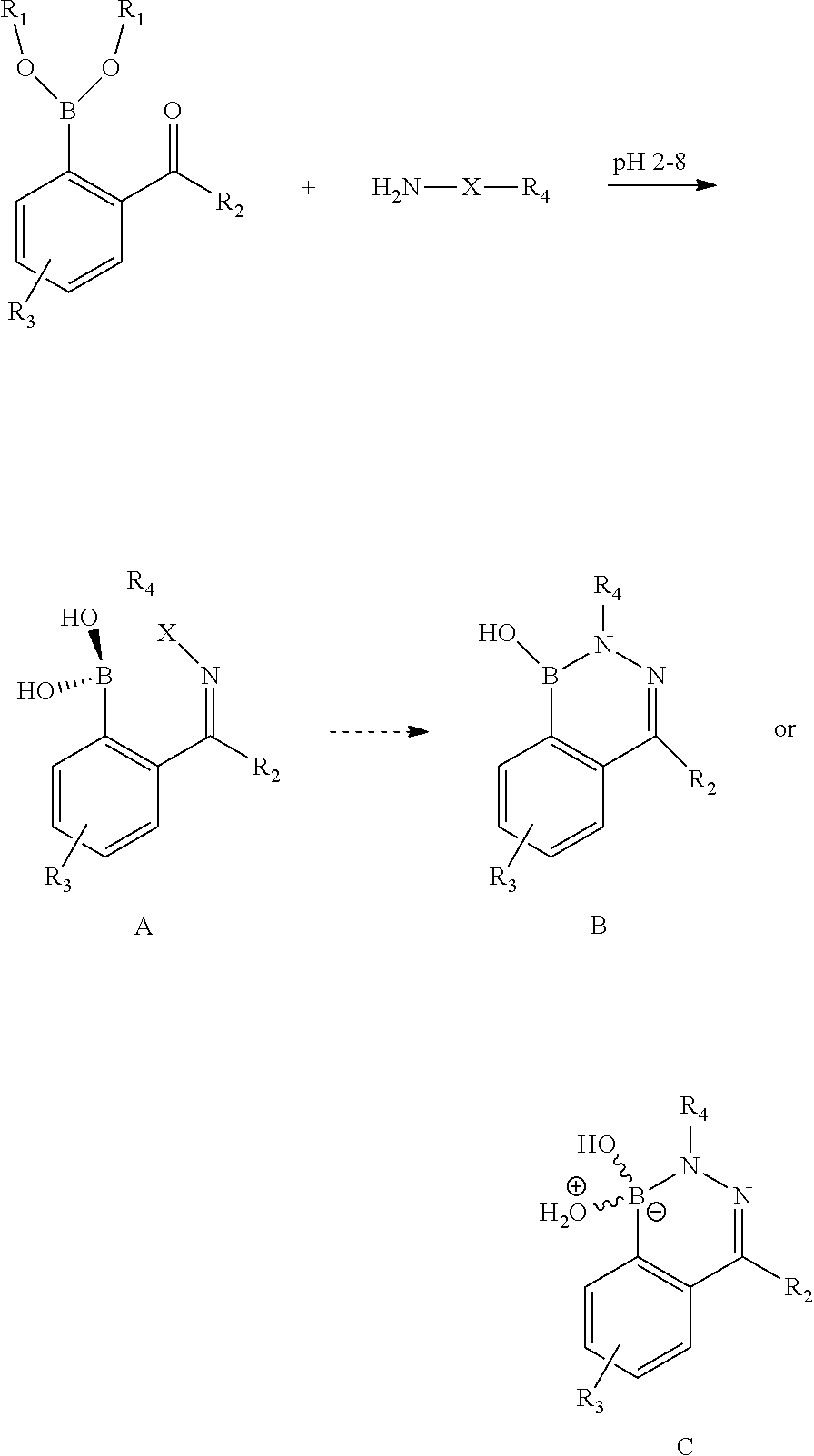 A reaction method comprising combining a carbonyl-substituted arylboronic acid or ester and an α-effect amine in aqueous solution at a temperature between about −5 C to 55 C, and a pH between 2 and 8 to produce an adduct. A process is also provided comprising: contacting a boron compound having a boron atom bonded to a sp2 hybridized carbon conjugated with a cis-carbonyl, the boron having at least one labile substituent, with an α-effect amine, in a solvent for a time sufficient to form an adduct, which may proceed to further products.