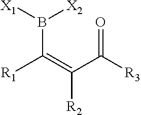 (1) a boron compound having a boron atom covalently bonded to an sp2 hybridized carbon conjugated with a cis-carbonyl; and (2) an α-effect amine; and (b) contacting the boron compound with the α-effect amine in a liquid solvent at a temperature of less than 55° C. and at a pH above 2, to spontaneously form an adduct by formation of a covalent bond between the boron compound and the α-effect amine. 2. The process according to 3. The process according to 4. The process according to 5. The process according to 6. The process according to wherein: X1, X2 are groups that can hydrolyze from the boron to yield boronic acid; and R1, R2, and R3 are independently selected from the group consisting of hydrogen, organic ligands, and heterorganic ligands, wherein X1, X2, R1, R2, and R3 exclude α-effect amines. 7. The process according to R2 is selected from the group consisting of: H, CH3; and R3 is selected from the group consisting of OH, O-alkyl, O-alkylbromide, O-alkylamine, O-alkylamide, O-alkylthiol, O-alkylthioester, alkylamine, alkylamide and alkylbromide. 8. The process according to 9. The process according to 10. The process according to 11. The process according to and a further product thereof formed through at least one of dehydration, interaction with the solvent, and interaction with a reactive heteroatom in the solvent, X1, X2 are groups that can hydrolyze from the boron to yield boronic acid; R1, R2, and R3 are hydrogen, organic ligands, or heterorganic ligands; X3 is O or N; and R4 is an alkyl, aryl, or heteroatom containing group. 12. The process according to wherein X4 is selected from the group consisting of alkyl, aryl, heteroalkyl, heteroaryl, hydroxyl, and water. 13. The process according to an ortho formyl phenylboronic acid or ester derivative; an ortho ketone phenylboronic acid or ester derivative; an ortho aldehyde phenylboronic acid ester derivative of an amino acid; a ketone phenylboronic acid or ester derivative of an amino acid; an ortho aldehyde phenylboronic acid derivatized with a reactive functional group which is orthogonal with respect to the boron compound and the α-effect amine; and a ketone phenylboronic acid derivatized with a reactive functional group which is orthogonal with respect to the boron compound and the α-effect amine. 14. The process according to 15. A boron compound comprising a boron atom bonded to a sp2 hybridized carbon conjugated with a cis-carbonyl and a biomolecule or a reporter, the boron having at least one labile substituent, the boron compound being reactive to form a covalently bonded adduct with an α-effect amine, and non-reactive to form a covalently bonded adduct with a non-α-effect amine, in an aqueous solution at pH 7 at 25° C.,