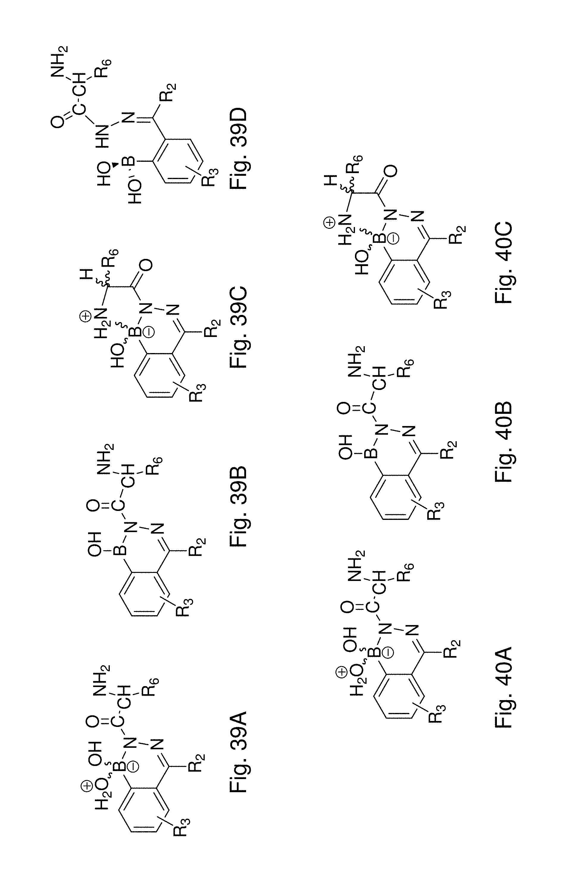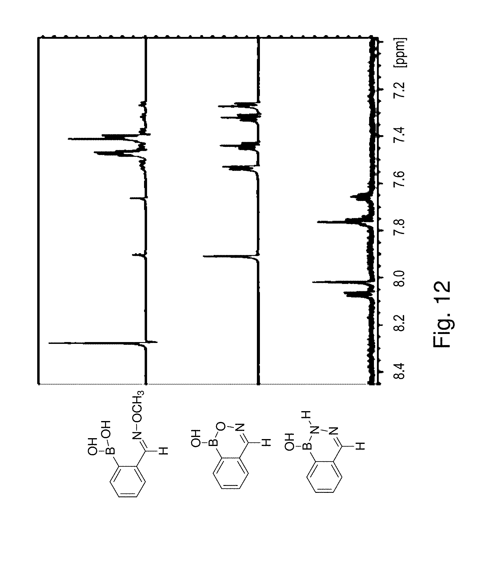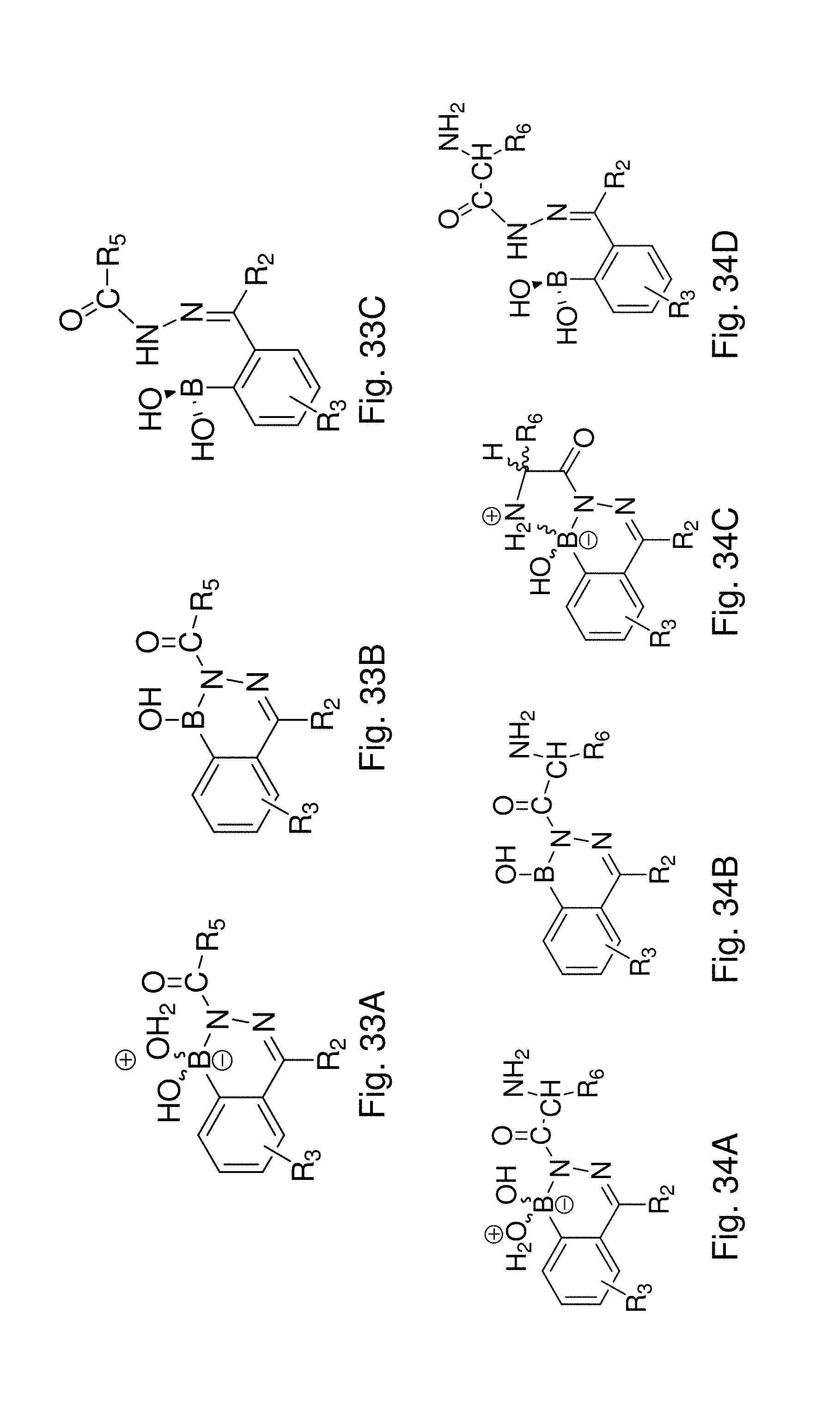 wherein the biomolecule comprises at least one of an amino acid, a peptide, a nucleotide, a carbohydrate, and a drug, and the reporter comprises at least one of a nanoparticle, a dye, a fluorophore, a radionuclide, and an isotopically enriched compound. 16. The boron compound according to wherein: X1, X2 are groups that can hydrolyze from the boron to yield boronic acid; and R1, R2, and R3 are hydrogen, organic ligands, or heterorganic ligands. and the adduct is selected from the group consisting of: a further product thereof formed through dehydration: wherein X4 is selected from the group consisting of alkyl, aryl, heteroalkyl, heteroaryl, hydroxyl and water, a further product formed through interaction with the solvent; and a further product formed through interaction with a reactive heteroatom in the solvent. 17. The boron compound according to wherein: R2 is H or CH3; R3 and R6 are independently selected from the group consisting of alkyl or OR, wherein R is selected from the group consisting of alkyl, heteroalkyl, heteroaryl, alkylamine, alkylthiol, alkylbromide, arylbromide, C2-C6 alkanoyl, CH2Ar or CH2CH2Ar, in which a heteroatom of the heteroalkyl and heteroaryl is selected from the group consisting of nitrogen, oxygen, and sulfur, the Ar group of CH2Ar or CH2CH2Ar is selected from the group consisting of a phenyl, a substituted phenyl ring, a naphtyl, a heteroaromatic ring, and a fused ring comprising at least one ring heteroatom selected from the group consisting of nitrogen, oxygen, and sulfur, a 4 to 7 member ring optionally incorporating one or more heteroatoms selected from the group consisting of oxygen, nitrogen, and sulfur, an aromatic ring optionally substituted with a fluorescent group, a sugar, and a polyethylene glycol chain; and R5 is selected from the group consisting of H, CH3, CH2CH3, CH2Ph, Ph, substituted Ph, and NH2. 18. The boron compound according to an ortho formyl phenylboronic acid or ester derivative; an ortho ketone phenylboronic acid or ester derivative; an ortho aldehyde phenylboronic acid ester derivative of an amino acid; a ketone phenylboronic acid or ester derivative of an amino acid; an ortho aldehyde phenylboronic acid derivatized with a reactive functional group which is orthogonal with respect to the boron compound and the α-effect amine; and a ketone phenylboronic acid derivatized with a reactive functional group which is orthogonal with respect to the boron compound and the α-effect amine. 19. The boron compound according to 20. A process comprising: