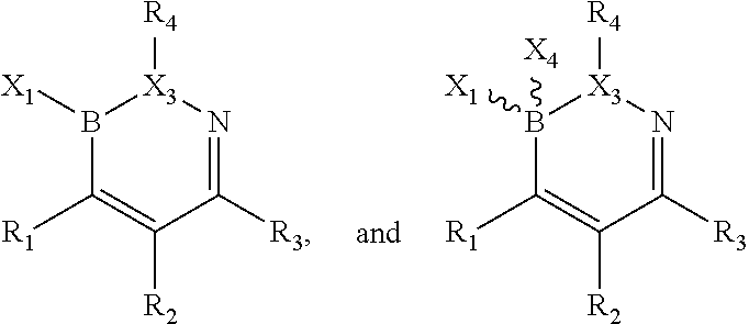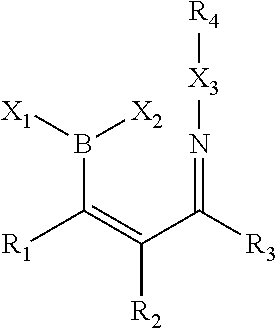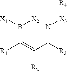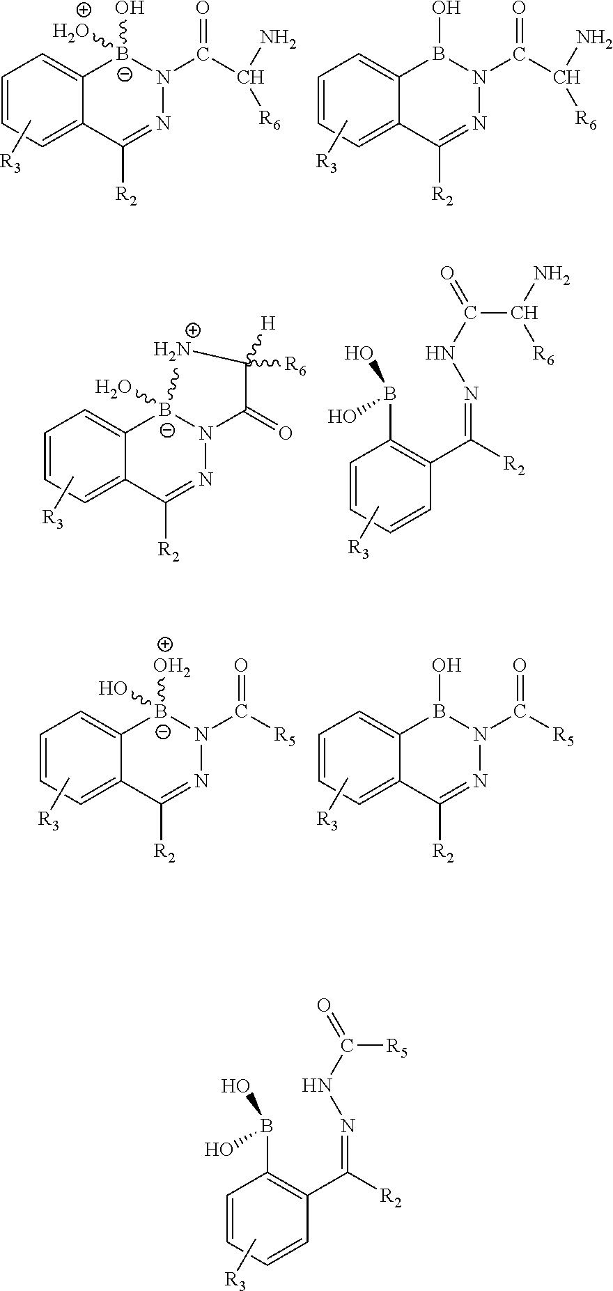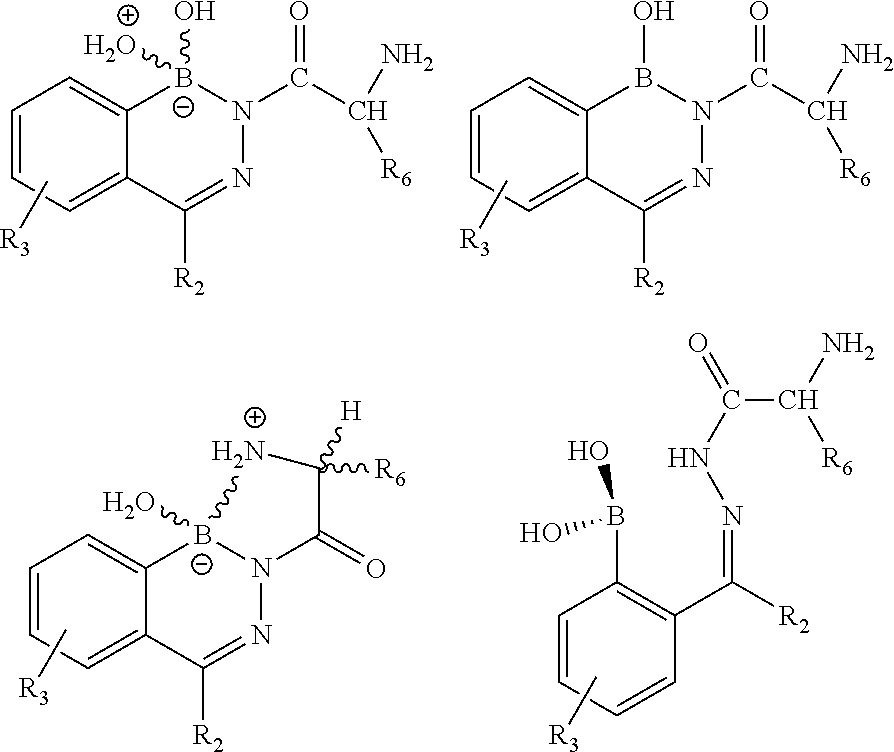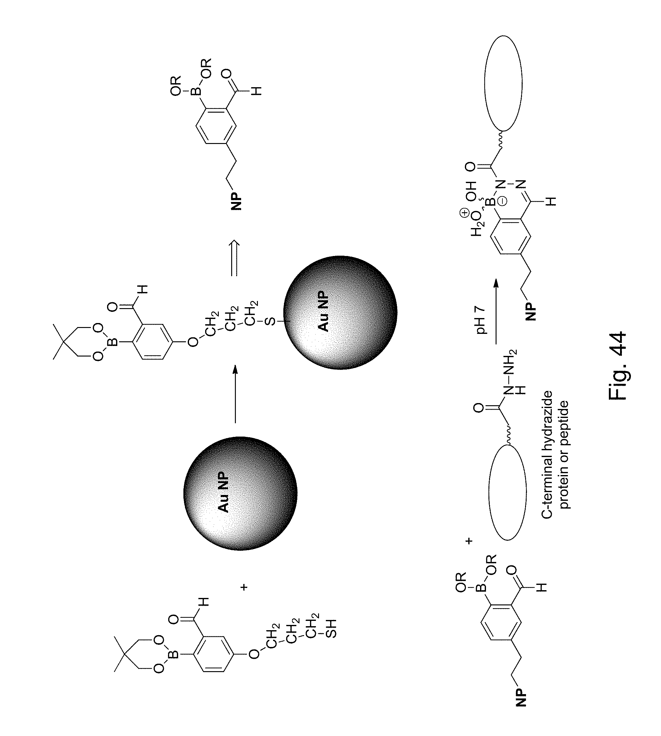 wherein the biomolecule comprises at least one of an amino acid, a peptide, a nucleotide, a carbohydrate, and a drug, and the reporter comprises at least one of a nanoparticle, a dye, a fluorophore, a radionuclide, and an isotopically enriched compound. 16. The boron compound according to wherein: X1, X2 are groups that can hydrolyze from the boron to yield boronic acid; and R1, R2, and R3 are hydrogen, organic ligands, or heterorganic ligands. and the adduct is selected from the group consisting of: a further product thereof formed through dehydration: wherein X4 is selected from the group consisting of alkyl, aryl, heteroalkyl, heteroaryl, hydroxyl and water, a further product formed through interaction with the solvent; and a further product formed through interaction with a reactive heteroatom in the solvent. 17. The boron compound according to wherein: R2 is H or CH3; R3 and R6 are independently selected from the group consisting of alkyl or OR, wherein R is selected from the group consisting of alkyl, heteroalkyl, heteroaryl, alkylamine, alkylthiol, alkylbromide, arylbromide, C2-C6 alkanoyl, CH2Ar or CH2CH2Ar, in which a heteroatom of the heteroalkyl and heteroaryl is selected from the group consisting of nitrogen, oxygen, and sulfur, the Ar group of CH2Ar or CH2CH2Ar is selected from the group consisting of a phenyl, a substituted phenyl ring, a naphtyl, a heteroaromatic ring, and a fused ring comprising at least one ring heteroatom selected from the group consisting of nitrogen, oxygen, and sulfur, a 4 to 7 member ring optionally incorporating one or more heteroatoms selected from the group consisting of oxygen, nitrogen, and sulfur, an aromatic ring optionally substituted with a fluorescent group, a sugar, and a polyethylene glycol chain; and R5 is selected from the group consisting of H, CH3, CH2CH3, CH2Ph, Ph, substituted Ph, and NH2. 18. The boron compound according to an ortho formyl phenylboronic acid or ester derivative; an ortho ketone phenylboronic acid or ester derivative; an ortho aldehyde phenylboronic acid ester derivative of an amino acid; a ketone phenylboronic acid or ester derivative of an amino acid; an ortho aldehyde phenylboronic acid derivatized with a reactive functional group which is orthogonal with respect to the boron compound and the α-effect amine; and a ketone phenylboronic acid derivatized with a reactive functional group which is orthogonal with respect to the boron compound and the α-effect amine. 19. The boron compound according to 20. A process comprising: