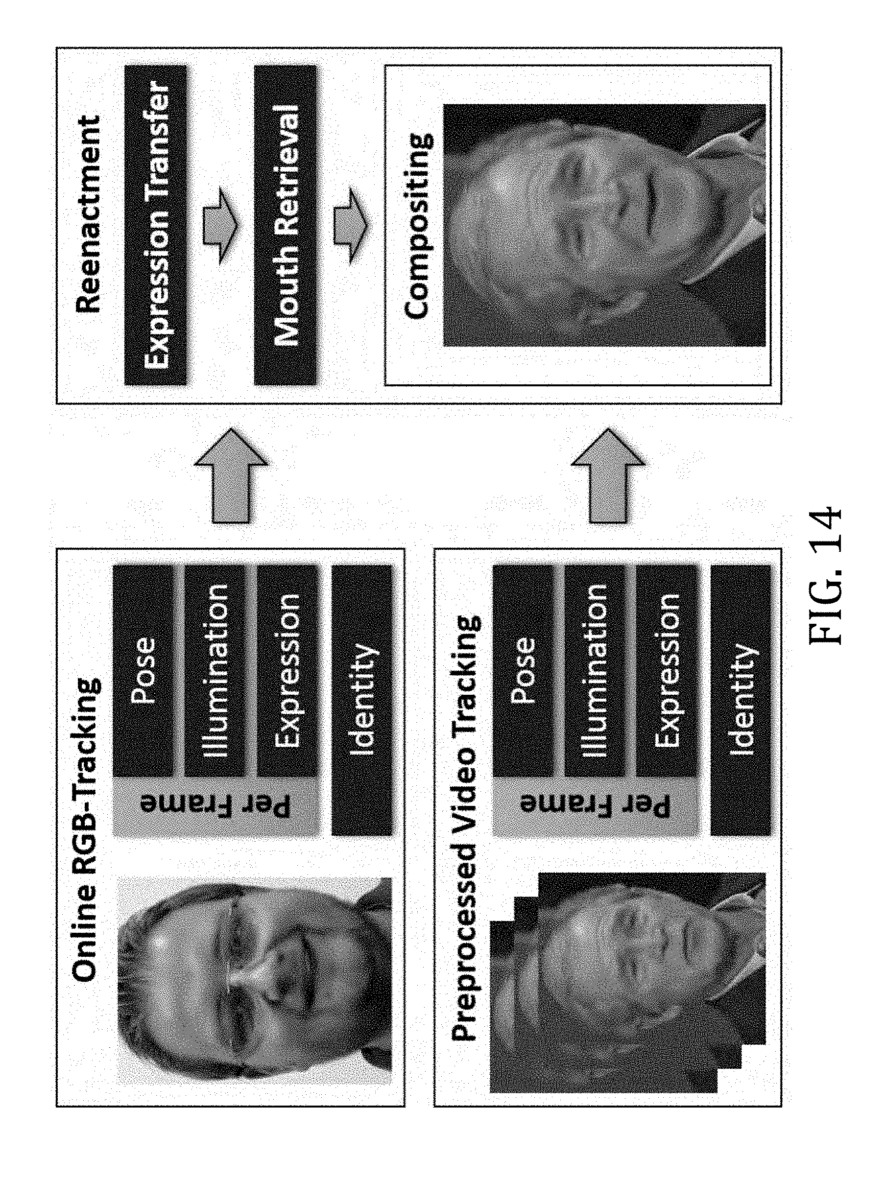 3, iε{1, . . . , n} of a generic face template mesh in a lower-dimensional subspace. The template is a manifold mesh defined by the set of vertex positions V=[vi] and corresponding vertex normals N=[ni], with |V|=|N|=n. The Mgeo(α,δ) parameterizes the face geometry by means of a set of dimensions encoding the identity with weights α and a set of dimensions encoding the facial expression with weights δ. In addition to the geometric prior, also a prior is used for the skin albedo Malb(β), which reduces the set of vertex albedos of the template mesh C=[ci], with ciε