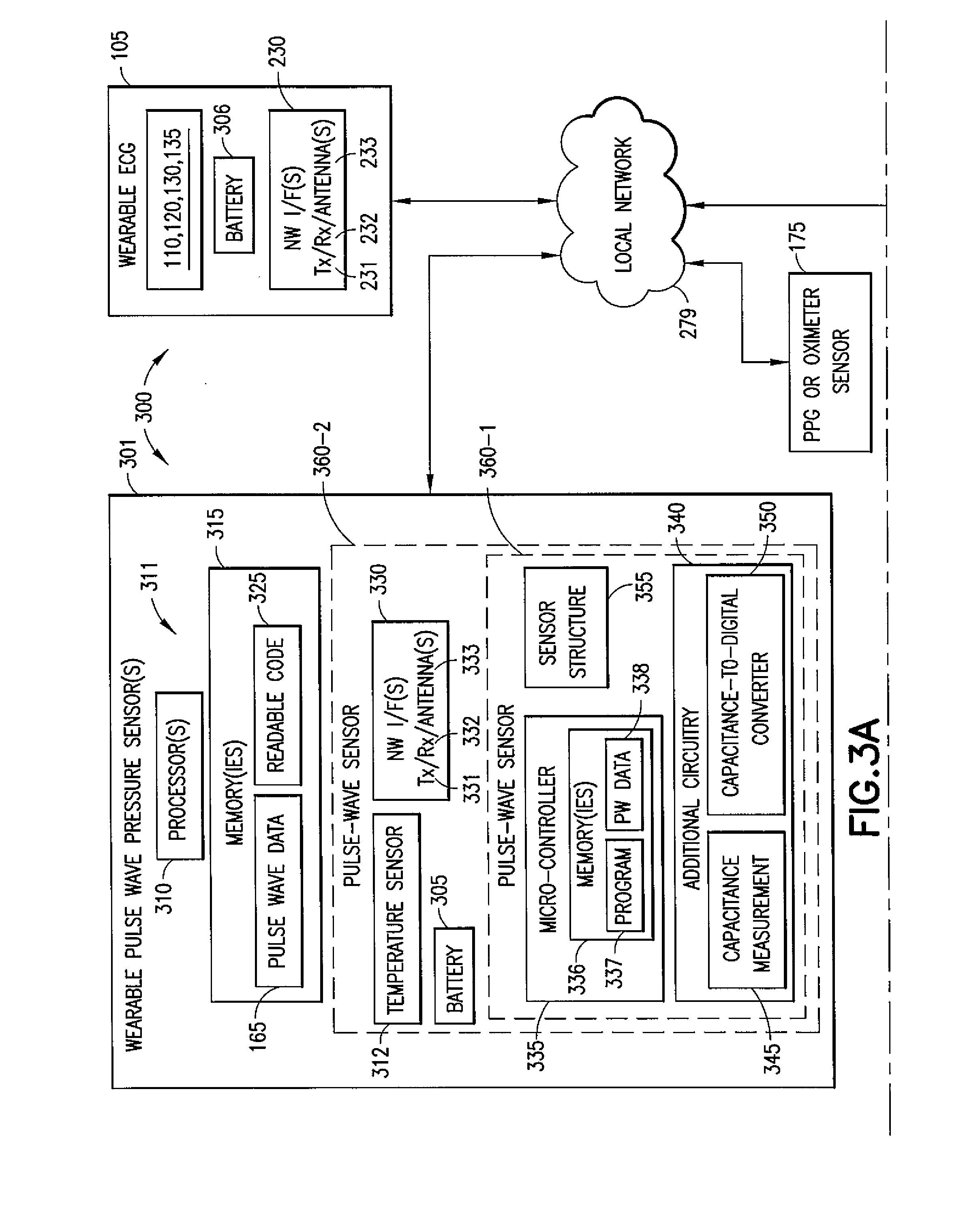 one or more memories storing computer readable code and one or more processors, the one or more processors, in response to loading and executing the computer readable code, causing the apparatus to perform operations comprising: receiving first pulse wave data from a first pulse wave sensor placed at a first location on a person, the first pulse wave data comprising data from one or more pulse waves from the first location of the person; receiving second pulse wave data from a second pulse wave sensor placed at a second location on the person, the first and second locations being different locations on the person, the second pulse wave data comprising data from one or more pulse waves from the second location of the person; determining blood pressure using at least the first and second pulse wave data; and outputting an indication of the blood pressure. 2. The apparatus of 3. The apparatus of 4. The apparatus of a sensor structure, comprising: a first portion configured to contact a surface of skin under which arteries or veins or both are to be located; a second portion that contacts the first portion and is configured to have a capacitance, wherein the first and second portions are configured to create a capacitance change in response to a squeezing or bending between the first portion and a fixed part of the second portion caused by a pulse pressure under the skin and in response to a return to an original state of the first portion with a release of the pulse pressure; circuitry connected to the sensor structure and configured to measure and transmit waveforms for the sensor unit and configured to digitize the measured waveforms, wherein each waveform captures the capacitance change for its corresponding individual sensor unit. 5. The apparatus of 6. The apparatus of 7. The apparatus of 8. The apparatus of 9. The apparatus of 10. The apparatus of 11. The apparatus of 12. The apparatus of where h is the person's height, a and b are constants which are empirically obtained, PTT is a pulse transit time determined using the first and second pulse wave data, and ln(•) means natural logarithm, and wherein FIT is determined as a time between a corresponding maximum inclination in pulse wave data from one of the pulse wave PPG sensor or the pulse wave pressure sensor and a corresponding maximum inclination in pulse wave data from the other of the pulse wave PPG sensor or the pulse wave pressure sensor. 13. The apparatus of 14. The apparatus of 15. The apparatus of where c, d and e are constants which are empirically obtained, and T2 is determined using certain pulse wave data from either the pulse wave pressure sensor or the pulse wave sensor and is a time interval between a peak point of a pulse wave in the certain pulse wave data and a baseline point where the pulse wave reaches to the baseline. 16. The apparatus of 17. The apparatus of determining the systolic blood pressure using the following equation: