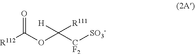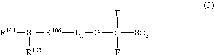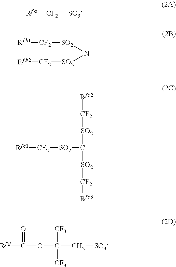 Example 2-1 R-01 Polymer P1 PAG-X Q-A SF-1 PGMEA GBL (80) (7.6) (1.6) (3.0) (1,728) (192) 2-2 R-02 Polymer P1 PAG-X Q-B SF-1 PGMEA GBL (80) (7.6) (1.6) (3.0) (1,728) (192) 2-3 R-03 Polymer P2 PAG-X Q-A SF-1 PGMEA GBL (80) (7.6) (1.6) (3.0) (1,728) (192) 2-4 R-04 Polymer P3 PAG-X Q-A SF-1 PGMEA GBL (80) (7.6) (1.6) (3.0) (1,728) (192) 2-5 R-05 Polymer P4 PAG-X Q-A SF-1 PGMEA GBL (80) (7.6) (1.6) (3.0) (1,728) (192) 2-6 R-06 Polymer P5 PAG-X Q-A SF-1 PGMEA GBL (80) (7.6) (1.6) (3.0) (1,728) (192) 2-7 R-07 Polymer P6 PAG-X Q-A SF-1 PGMEA GBL (80) (7.6) (1.6) (3.0) (1,728) (192) 2-8 R-08 Polymer P7 PAG-X Q-A SF-1 PGMEA GBL (80) (7.6) (1.6) (3.0) (1,728) (192) 2-9 R-09 Polymer P8 PAG-X Q-A SF-1 PGMEA GBL (80) (7.6) (1.6) (3.0) (1,728) (192) 2-10 R-10 Polymer P9 PAG-X Q-A SF-1 PGMEA GBL (80) (7.6) (1.6) (3.0) (1,728) (192) 2-11 R-11 Polymer P10 PAG-X Q-A SF-1 PGMEA GBL (80) (7.6) (1.6) (3.0) (1,728) (192) 2-12 R-12 Polymer P11 PAG-X Q-A SF-1 PGMEA GBL (80) (7.6) (1.6) (3.0) (1,728) (192) 2-13 R-13 Polymer P12 PAG-X Q-A SF-1 PGMEA GBL (80) (7.6) (1.6) (3.0) (1,728) (192) 2-14 R-14 Polymer P1 PAG-X Q-C SF-1 PGMEA GBL (80) (7.6) (1.7) (3.0) (1,728) (192) Comparative 1-1 R-15 Polymer P1 PAG-X Q-1 SF-1 PGMEA GBL Example (80) (7.6) (1.3) (3.0) (1,728) (192) 1-2 R-16 Polymer P1 PAG-X Q-2 SF-1 PGMEA GBL (80) (7.6) (3.8) (3.0) (1,728) (192) 1-3 R-17 Polymer P1 PAG-X Q-3 SF-1 PGMEA GBL (80) (7.6) (3.1) (3.0) (1,728) (192) 1-4 R-18 Polymer P1 PAG-X Q-4 SF-1 PGMEA GBL (80) (7.6) (2.5) (3.0) (1,728) (192) 1-5 R-19 Polymer P1 PAG-X Q-5 SF-1 PGMEA GBL (80) (7.6) (1.4) (3.0) (1,728) (192) 1-6 R-20 Polymer P1 PAG-X Q-6 SF-1 PGMEA GBL (80) (7.6) (3.5) (3.0) (1,728) (192) 4) Evaluation of Resist Composition: ArF Lithography Test 1