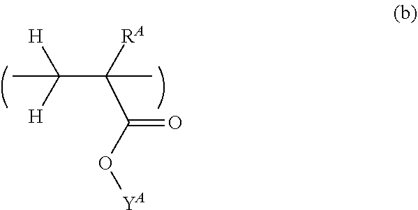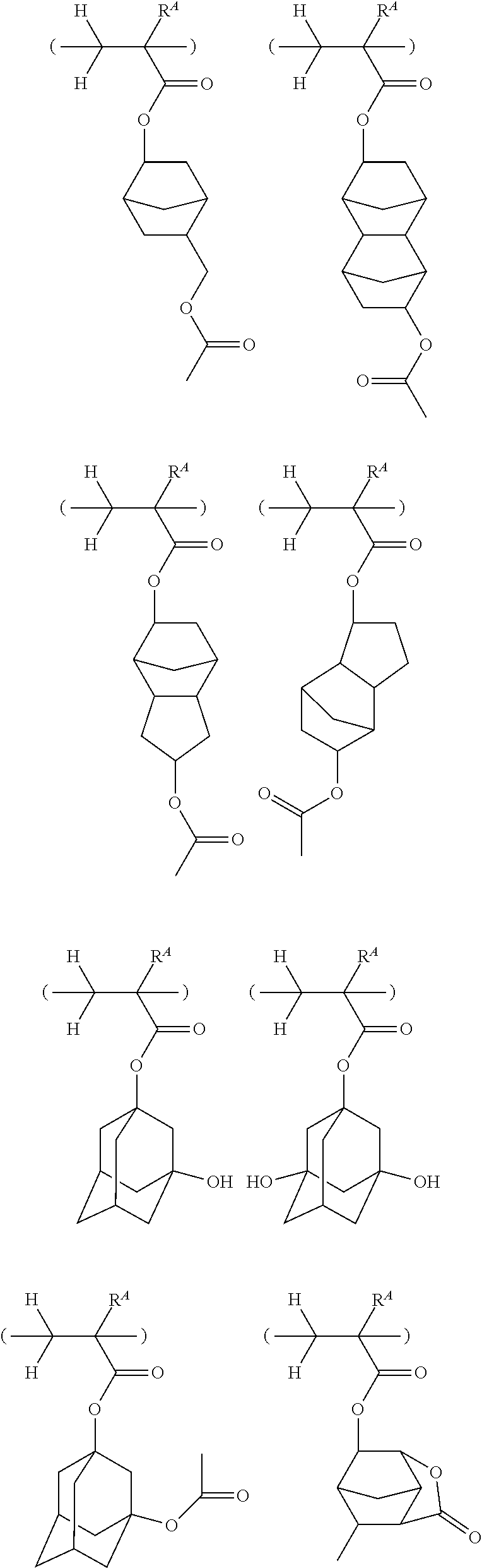 Synthesis 1 Polymer P1 A-1 (0.50) B-1 (0.50) — — 8,755 1.94 Example 2 Polymer P2 A-3 (0.50) B-1 (0.50) — — 8,052 1.77 3 Polymer P3 A-1 (0.40) B-1 (0.50) B-2 (0.10) — 8,297 1.70 4 Polymer P4 A-2 (0.40) B-1 (0.60) — — 8,802 1.58 5 Polymer P5 A-2 (0.40) B-3 (0.60) — — 8,118 1.91 6 Polymer P6 A-2 (0.20) A-3 (0.30) B-1 (0.40) B-4 (0.10) 8,192 1.90 7 Polymer P7 A-2 (0.20) A-3 (0.30) B-2 (0.40) B-4 (0.10) 8,684 1.85 8 Polymer P8 A-1 (0.25) A-2 (0.25) B-2 (0.40) B-4 (0.10) 8,214 1.89 9 Polymer P9 A-1 (0.25) A-2 (0.20) B-1 (0.35) B-2 (0.20) 8,355 1.89 10 Polymer P10 A-3 (0.25) A-5 (0.25) B-1 (0.35) B-4 (0.15) 8,511 1.88 11 Polymer P11 A-4 (0.50) B-3 (0.50) — — 8,652 1.78 12 Polymer P12 A-5 (0.30) A-6 (0.10) B-2 (0.50) B-4 (0.10) 8,278 1.82 A-1 A-2 A-3 A-4 A-5 A-6 B-1 B-2 B-3 B-4 3) Preparation of Resist Compositions