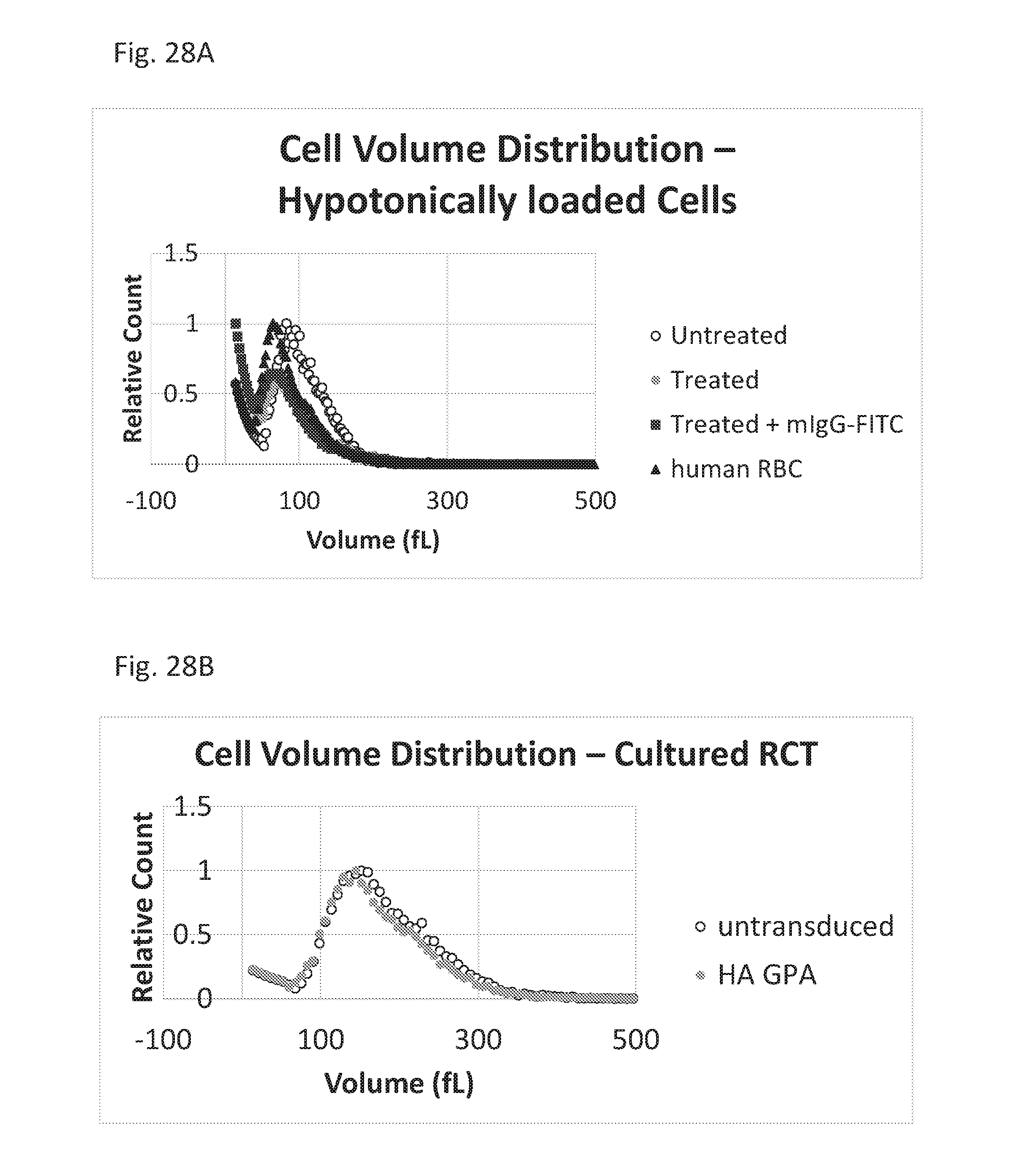 DNA encoding the following genes—glycophorin A (Uniprot ID P02724), Kell (Uniprot ID P23276), antibody scFv against hepatitis B surface antigen (Bose et al. 2003 Mol Immunol 40(9):617, GenBank ID AJ549501.1), adenosine deaminase (Uniprot ID P00813), phenylalanine hydroxylase from Genes were assembled into expression vectors by standard molecular biology methods known in the art. The gene for complement receptor 1 (CR1) was synthesized by a commercial vendor (DNA2.0) and supplied in a standard cloning vector (pJ series). The gene was amplified out of the pJ vector by polymerase chain reaction (PCR) using oligos with non-homologous terminal sequences to prepare for insertion into the mammalian expression vector (System Biosciences, pM series): the upstream oligo consisted of 25 nt homologous to the upstream pM insertion site and 25 nt homologous to the start of CR1; the downstream oligo consisted of 25 nt homologous to the downstream pM insertion site and 25 nt homologous to the end of CR1. The amplified product was purified by gel electrophoresis (Qiagen). The pM vector was linearized by PCR with tail-to-tail oligos homologous to the upstream and downstream insertion sites and purified by PCR purification (Qiagen). The CR1 amplicon was ligated into the linearized pM vector by Gibson assembly, described in detail in Gibson 2011, Methods Enzymology Vol 498, p. 394. Sequences were confirmed by Sanger sequencing. The gene for Kell was purchased as cDNA and supplied in a standard cloning vector (pJ series). The gene for an antibody scFv specific to hepatitis B surface antigen (scFv, described in Bose 2003, Molecular Immunology 40:617) was synthesized by a commercial vendor (DNA2.0) and supplied in a standard cloning vector (pJ series). The genes was amplified out of the pJ vectors by polymerase chain reaction (PCR) using oligos with non-homologous terminal sequences to prepare for insertion into the mammalian expression vector (System Biosciences, pM series). Kell was amplified with an upstream oligo consisting of 25 nt homologous to the upstream pM insertion site and 25 nt homologous to the 5′ terminus of Kell, and a downstream oligo consisting of 25 nt homologous to the 5′ terminus of scFv and 25 nt homologous to the 3′ terminus of Kell. scFv was amplified with an upstream oligo consisting of 25 nt homologous to the 3′ terminus of Kell insertion site and 25 nt homologous to the 5′ terminus of scFv, and a downstream oligo consisting of 25 nt homologous to the downstream pM insertion site and 25 nt homologous to the 3′ terminus of scFv. The amplified products were purified by gel electrophoresis (Qiagen). The pM vector was linearized by PCR with tail-to-tail oligos homologous to the upstream and downstream insertion sites and purified by PCR purification (Qiagen). The Kell and scFv amplicons were ligated into the linearized pM vector by one-pot Gibson assembly, described in detail in Gibson 2011, Methods Enzymology Vol 498, p. 394. Sequences were confirmed by Sanger sequencing. The gene for Kell was purchased as cDNA and supplied in a standard cloning vector (pJ series). The gene for an antibody scFv specific to hepatitis B surface antigen (scFv, described in Bose 2003, Molecular Immunology 40:617) was synthesized by a commercial vendor (DNA2.0) and supplied in a standard cloning vector (pJ series). The genes was amplified out of the pJ vectors by polymerase chain reaction (PCR) using oligos with non-homologous terminal sequences to prepare for insertion into the mammalian expression vector (System Biosciences, pM series). Kell was amplified with an upstream oligo consisting of 25 nt homologous to the upstream pM insertion site and 25 nt homologous to the 5′ terminus of Kell; and a downstream oligo consisting of 25 nt homologous to the 5′ terminus of scFv, 24 nt encoding a (GlyGlyGlySer)×2 (SEQ ID NO: 23) spacer, and 25 nt homologous to the 3′ terminus of Kell. scFv was amplified with an upstream oligo consisting of 25 nt homologous to the 3′ terminus of Kell insertion site, 24 nt encoding a (GlyGlyGlySer)×2 (SEQ ID NO: 23) spacer, and 25 nt homologous to the 5′ terminus of scFv; and a downstream oligo consisting of 25 nt homologous to the downstream pM insertion site and 25 nt homologous to the 3′ terminus of scFv. The amplified products were purified by gel electrophoresis (Qiagen). The pM vector was linearized by PCR with tail-to-tail oligos homologous to the upstream and downstream insertion sites and purified by PCR purification (Qiagen). The Kell and scFv amplicons were ligated into the linearized pM vector by one-pot Gibson assembly, described in detail in Gibson 2011, Methods Enzymology Vol 498, p. 394. Sequences were confirmed by Sanger sequencing. The gene for Kell was purchased as cDNA and supplied in a standard cloning vector (pJ series). The gene for an antibody scFv specific to hepatitis B surface antigen (scFv, described in Bose 2003, Molecular Immunology 40:617) was synthesized by a commercial vendor (DNA2.0) and supplied in a standard cloning vector (pJ series). The genes was amplified out of the pJ vectors by polymerase chain reaction (PCR) using oligos with non-homologous terminal sequences to prepare for insertion into the mammalian expression vector (System Biosciences, pM series). Kell was amplified with an upstream oligo consisting of 25 nt homologous to the upstream pM insertion site and 25 nt homologous to the 5′ terminus of Kell; and a downstream oligo consisting of 25 nt homologous to the 5′ terminus of scFv, 24 nt encoding a (GlyGlyGlySer)×2 (SEQ ID NO: 23) spacer, and 25 nt homologous to the 3′ terminus of Kell. scFv was amplified with an upstream oligo consisting of 25 nt homologous to the 3′ terminus of Kell insertion site, 24 nt encoding a (GlyGlyGlySer)×2 (SEQ ID NO: 23) spacer, and 25 nt homologous to the 5′ terminus of scFv; and a downstream oligo consisting of 25 nt homologous to the downstream pM insertion site, the 2