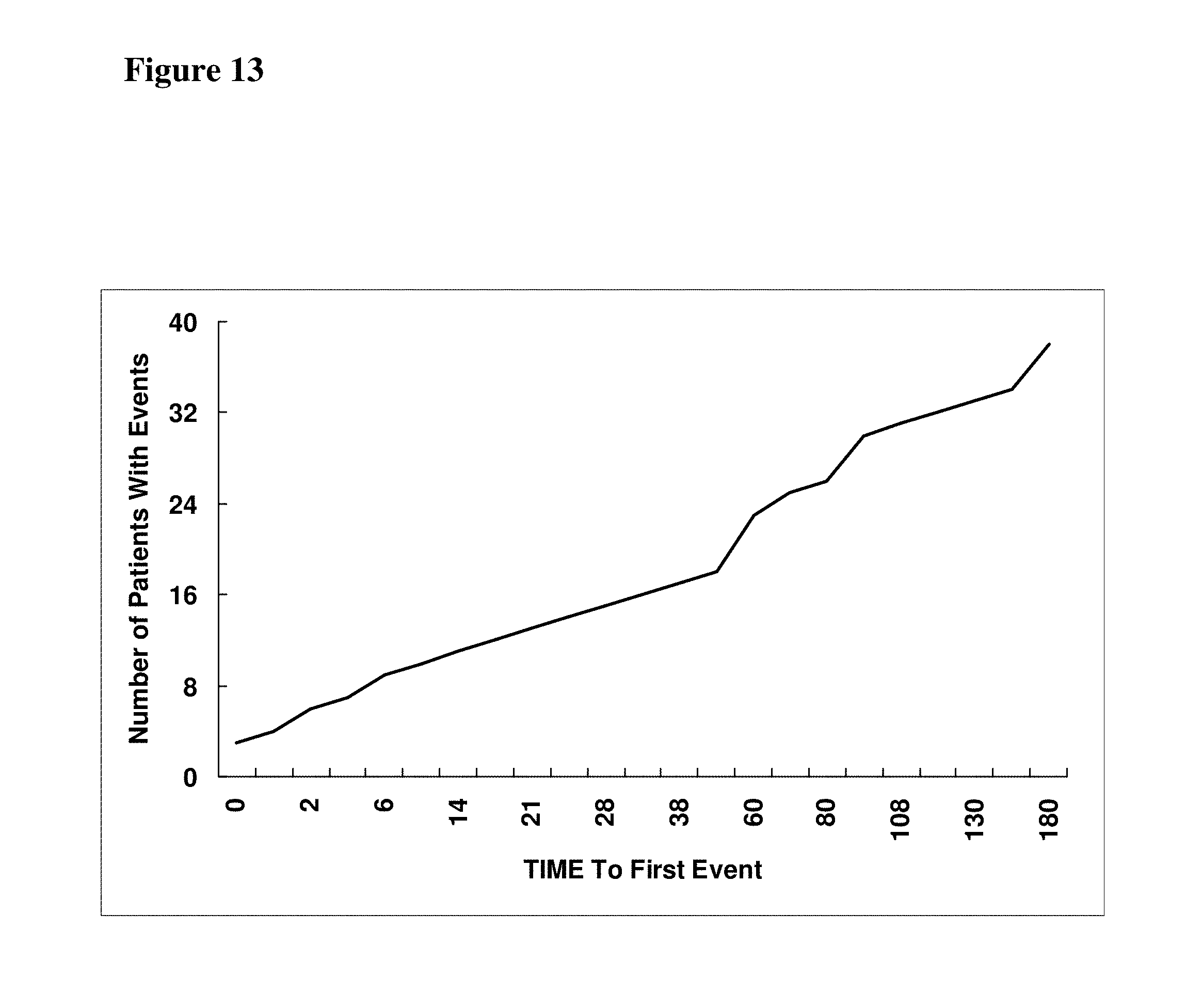Patient Demographics SAT No SAT (n = 20) (n = 50) p - value Age (years) 65 ± 11 62 ± 13 NS Race (Caucasian) n, (%) 10 (50) 38 (76) .04 Gender (Male) n, (%) 10 (50) 35 (70) NS Risk Factors/Past medical Hx n, (%) Smoking 9 (45) 27 (54) NS Family history of CAD 16 (80) 28 (56) .06 Hypertension 15 (75) 28 (56) NS Hyperlipidemia 15 (75) 36 (77) NS Diabetes 12 (60) 21 (42) NS Prior Myocardial Infarction 12 (60) 24 (48) NS Prior CABG 5 (25) 12 (24) NS Prior PTCA 4 (20) 20 (40) NS Baseline Medications n, (%) Beta blockers 17 (85) 45 (90) NS ACE Inhibitors 15 (75) 26 (52) NS Calcium blockers 5 (25) 10 (20) NS Lipid lowering agents 3A4 11 (55) 29 (58) NS Non 3A4 5 (25) 13 (26) NS CABG = coronary artery bypass graft surgery; CAD = coronary artery disease; PTCA = percutaneous coronary angioplasty; ACE = angiotensin converting enzyme; SAT = stent thrombosis Procedural Characteristics SAT No SAT (n = 20) (n = 50) p Value Ejection Fraction (%) 40 ± 10 53 ± 6 .001 Number of vessels treated 1.3 ± 6.4 1.4 ± 0.7 NS Lesion Morphology Denovo n, (%) 20 (100) 46 (92) NS Lesion Location n, (%) LAD 5 (30) 14 (28) NS CX 3 (15) 11 (22) NS RCA 12 (60) 17 (34) .05 SVG 0 (0) 8 (16) NS Stent Types Drug eluting n, (%) 6 (30) 31 (62) .01 Bare metal n, (%) 14 (70) 16 (32) .01 Reference vessel diameter (mm) 2.8 ± 0.3 3.1 ± 0.4 NS Total lesion length (mm) 24 ± 6 18 ± 8 .007 Pre-stenosis (%) 94 ± 7 87 ± 12 NS Post-stenosis (%) 9 ± 12 3 ± 6 NS CX = circumflex artery; LAD = left anterior descending artery; RCA = right coronary artery; SVG = saphenous vein graft Platelet Characteristics No SAT SAT p Value LTA - 5 μM ADP (%) 26 ± 2 49 ± 4 <0.001 LTA - 20 μM ADP (%) 46 ± 2 65 ± 3 <0.001 LTA -Arachidonic Acid 0 non-responder 1 non-responder NS P2Y12Reactivity Ratio 46 ± 9 69 ± 5 0.030 GP IIb/IIIa (MFI) Unstimulated 15 ± 3 9 ± 1 NS Stimulated 42 ± 4 138 ± 19 <0.001 CD 41 (MFI) Unstimulated 513 ± 30 515 ± 31 NS Stimulated 729 ± 60 770 ± 38 NS LTA = light transmittance aggregometry; MFI = mean fluorescence intensity; NS = not significant Example 2: Clopidogrel Loading with Eptifibatide to Arrest the Reactivity of Platelets