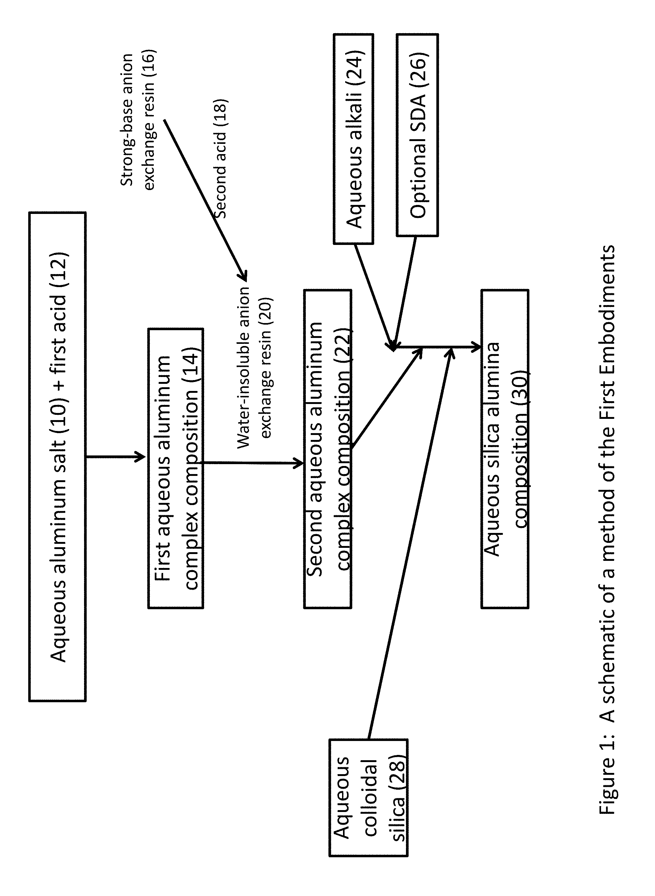 combining in an aqueous blend a water-soluble aluminum salt, a first acid having a pKa of 3.5 to 9.5, and an aqueous colloidal silica to form an aluminum-silica reaction product; passing the aluminum-silica reaction product through a fixed bed of a water-insoluble anion exchange resin to provide an aluminum-silica effluent; optionally diluting or concentrating the aluminum-silica effluent; and combining the aluminum-silica effluent with an aqueous alkali, further aqueous colloidal silica, and optionally a structure directing agent to form an aqueous silica-alumina composition, wherein the structure directing agent is selected from the group consisting of N,N,N-trimethyl-1-adamantylammonium hydroxide, tetramethylammonium hydroxide, tetrapropylammonium hydroxide, tetraethylammonium hydroxide, tetrabutylammonium hydroxide, tetrahexylammonium hydroxide, tetraoctylammonium hydroxide, methyltributylammonium hydroxide, methyltriethylammonium hydroxide, phenyltrimethylammonium hydroxide, methyltripropylammonium hydroxide, dodecyltrimethylammonium hydroxide, hexadecyltrimethylammonium hydroxide, N-dodecyl N-ethyl N,N-dimethyl ammonium hydroxide, N,N-dimethyl N,N-diethyl ammonium hydroxide, and any combination thereof. 17. The method of 18. The method of 19. The method of 20. The method of