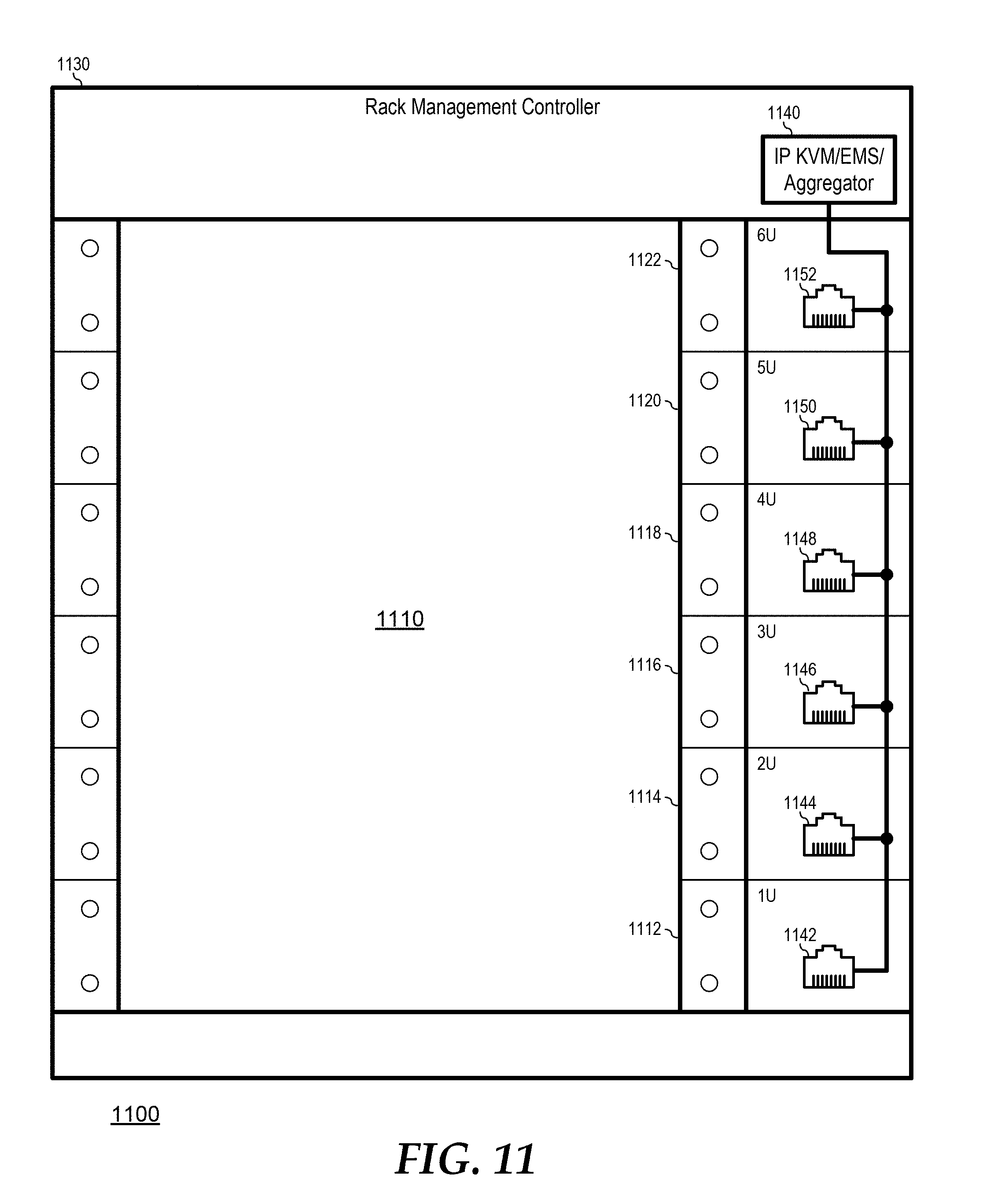 This application is a continuation of U.S. patent application Ser. No. 14/199,748 entitled “System and Method for Providing a Data Center Management Controller,” filed on Mar. 6, 2014, which is soon to issue as U.S. Pat. No. 9,923,766 the disclosure of which is hereby expressly incorporated by reference in its entirety. This disclosure relates generally to information handling systems, and more particularly relates to a system and method for providing a management controller to a server rack. As the value and use of information continues to increase, individuals and businesses seek additional ways to process and store information. One option is an information handling system. An information handling system generally processes, compiles, stores, and/or communicates information or data for business, personal, or other purposes. Because technology and information handling needs and requirements may vary between different applications, information handling systems may also vary regarding what information is handled, how the information is handled, how much information is processed, stored, or communicated, and how quickly and efficiently the information may be processed, stored, or communicated. The variations in information handling systems allow for information handling systems to be general or configured for a specific user or specific use such as financial transaction processing, reservations, enterprise data storage, or global communications. In addition, information handling systems may include a variety of hardware and software resources that may be configured to process, store, and communicate information and may include one or more computer systems, data storage systems, and networking systems. A data center is a facility to house a group of networked information handling systems typically used by organizations for the remote storage, processing, or distribution of large amounts of data, and includes associated components, such as telecommunication systems, storage systems, power supplies, environmental controls, and security infrastructure. A data center includes a group of server racks that house the information handling systems, and that are located on floor tiles of a raised floor. A space below the raised floor can be utilized to provide an air flow from an AC system to the server racks. It will be appreciated that for simplicity and clarity of illustration, elements illustrated in the Figures have not necessarily been drawn to scale. For example, the dimensions of some of the elements are exaggerated relative to other elements. Embodiments incorporating teachings of the present disclosure are shown and described with respect to the drawings presented herein, in which: The use of the same reference symbols in different drawings indicates similar or identical items. The following description in combination with the Figures is provided to assist in understanding the teachings disclosed herein. The following discussion will focus on specific implementations and embodiments of the teachings. This focus is provided to assist in describing the teachings, and should not be interpreted as a limitation on the scope or applicability of the teachings. However, other teachings can certainly be used in this application. The teachings can also be used in other applications, and with several different types of architectures, such as distributed computing architectures, client/server architectures, or middleware server architectures and associated resources. Server aisle 110 includes server racks 112, 114, 116, 118, and 120 that operate to perform the data storage and processing functions of data center 100. Floor 130 is a false-floor that forms a platform above a ground level floor, crating sub-floor 160, an area between floor 130 and the ground level floor. Sub-floor 160 provides for power routing and cabling for servers 112, 114, 116, 118, and 120, and acts as a conduit for air conditioning (AC) to provide temperature controlled air flow to the servers. As such, floor 130 includes floor tiles 132, 134, 136, 138, and 140 that each include vents that permit the temperature controlled air to pass from sub-floor 160 to cold aisle 170. There, the temperature controlled air is drawn through the equipment in server racks 112, 114, 116, 118, and 120 to cool the equipment, and the air flows out the back of the server racks, removing the heat from the equipment, and passing to hot aisle 180, where the hot air is recirculated through an AC system. The skilled artisan will recognize that other floor configurations than the illustrated raised floor configuration shown herein can be utilized in combination with the teachings of the present disclosure, as needed or desired. Further, the skilled artisan will recognize that other air flows than the air flows from the floor to the cold aisle to the hot isle as illustrated herein can be utilized in combination with the teachings of the present disclosure, as needed or desired. In an embodiment, DCMC 150 operates to provide a management network for the equipment in server racks 112, 114, 116, 118, and 120. For example, one or more of the elements of server racks 112, 114, 116, 118, and 120 can include a service processor such as a baseboard management controller, an Integrated Dell Remote Access Controller (iDRAC), another service processor, or a combination thereof, such that DCMC 150 can remotely manage the equipment in the server racks. An example of a DCMC includes a dedicated hardware device, a software stack on a dedicated server, a software stack on a server of data center 100, or other hardware, software, or firmware located in the data center or remote from the data center, as needed or desired. In a particular embodiment, the floor tiles operate to provide information to respective server racks. In a first case, the information is communicated via a passive communication channel. In another case, the information is communicated via an active comm