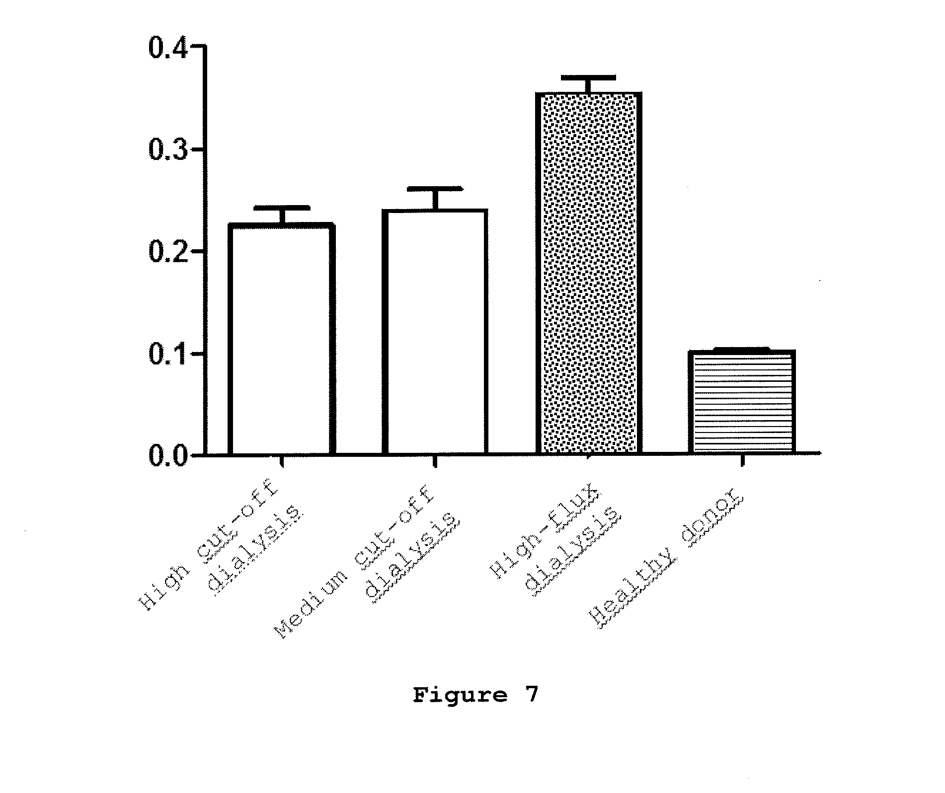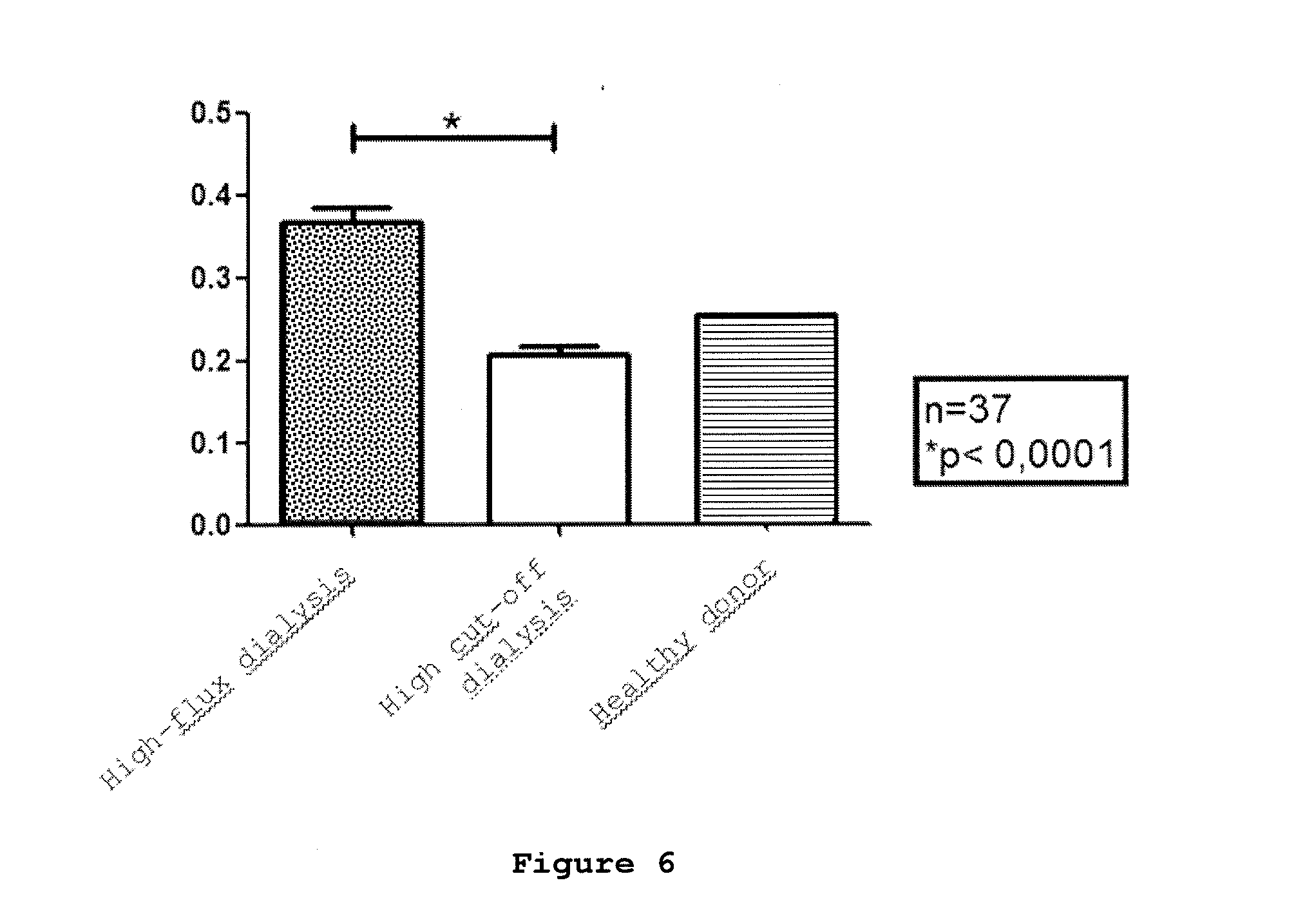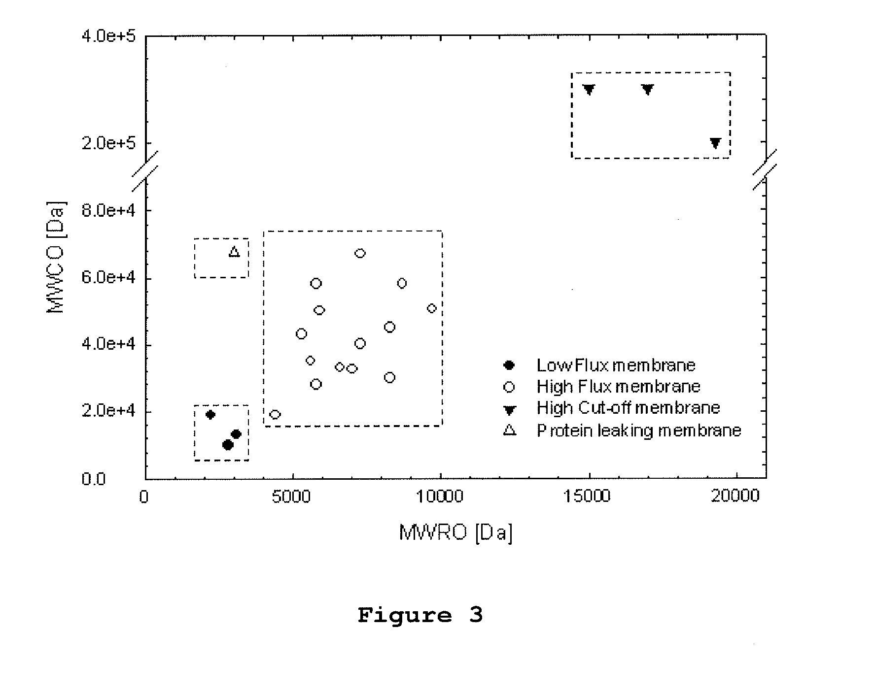General classification and typical performance of hemodialysis membranes Sieveing Coefficientb Album Water β2- FLC in Dialyzer permeabilitya Micro- Clearancec Loss type ml/(m2hmmHg) globulin Albumin Kappa Lambda (g)d Low- 10-20 — <0.01 — — 0 flux High- 200-400 0.7-0.8 <0.01 <10 <2 <0.5 flux Protein 50-500 0.9-1.0 0.02-0.03 — — 2-6 leaking High 1100 1.0 0.2 38 33 28 cut- off awith 0.9 wt.-% sodium chloride at 37 ± 1° C. and QB 100-500 ml/min baccording to EN1283 with QB max and UF 20% cSerum Free Light Chains, Clearance in vitro, QB 250 ml/min and QD 500 ml/min, UF 0 ml/min, Bovine Plasma, 60 g/l, 37° C., Plasma Level: human κ 500 mg/l, human λ 250 mg/l. All clearances in ml/min, measured for membrane areas between 1.7 and 2.1 m2 dmeasured in conventional hemodialysis, after a 4-h session, with QB 250 ml/min and QD 500 ml/min, for membrane areas between 1.7 and 2.1 m2 General classification of hemodialysis membranes based on dextran sieving Structural Characteristics Dialyzer MWRO MWCO Pore radius type [kDa] [kDa] [nm] Low-flux 2-4 10-20 2-3 High-flux 5-10 25-65 3.5-5.5 Protein 2-4 60-70 5-6 leaking High cut-off 15-20 170-320 8-12 Medium cut- 8.5-14.0 55-130 5.5 < pore off radius < 8.0 SUMMARY OF THE INVENTION