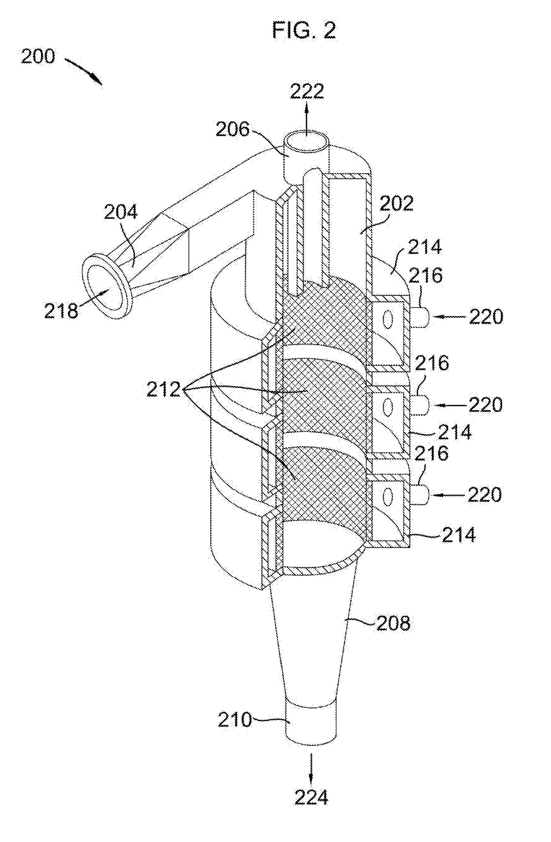 a vessel having a generally cylindrical shape with a generally circular cross-section; a tangential feed inlet for a cryogenic liquid, attached to a cylindrical wall of the vessel on an upper end of the vessel such that injected fluids form a tangential flow and a cyclone vortex; a vortex finder outlet on a top of the vessel, perpendicular to the tangential feed inlet; a lower section of the vessel that tapers conically down in size to an apex nozzle outlet; at least a portion of a wall of the air-sparged hydrocyclone comprising a porous sparger covered by an outer gas plenum which encloses the porous sparger, the outer gas plenum containing at least one inlet for the carrier gas; and, sizing the vessel, the tangential feed inlet, the vortex finder, the lower section, and the apex nozzle outlet to cause a gas/liquid separation; providing the cryogenic liquid to the tangential feed inlet at a velocity that induces the tangential flow and the cyclone vortex in the air-sparged hydrocyclone; injecting the carrier gas into the air-sparged hydrocyclone through the porous sparger; wherein the vapor dissolves, condenses, desublimates, or a combination thereof, forming a vapor-depleted carrier gas and a vapor-enriched cryogenic liquid; the vapor-depleted gas is drawn through the vortex finder while the vapor-enriched cryogenic liquid is drawn through the apex nozzle outlet; whereby the vapor is removed from the carrier gas. 2. The method of 3. The method of 4. The method of 5. The method of 6. The method of 7. The method of 8. The method of 9. The method of 10. The method of 11. The method of 12. The method of 13. The method of 14. The method of 15. The method of 16. The method of 17. The method of 18. The method of 19. The method of 20. The method of