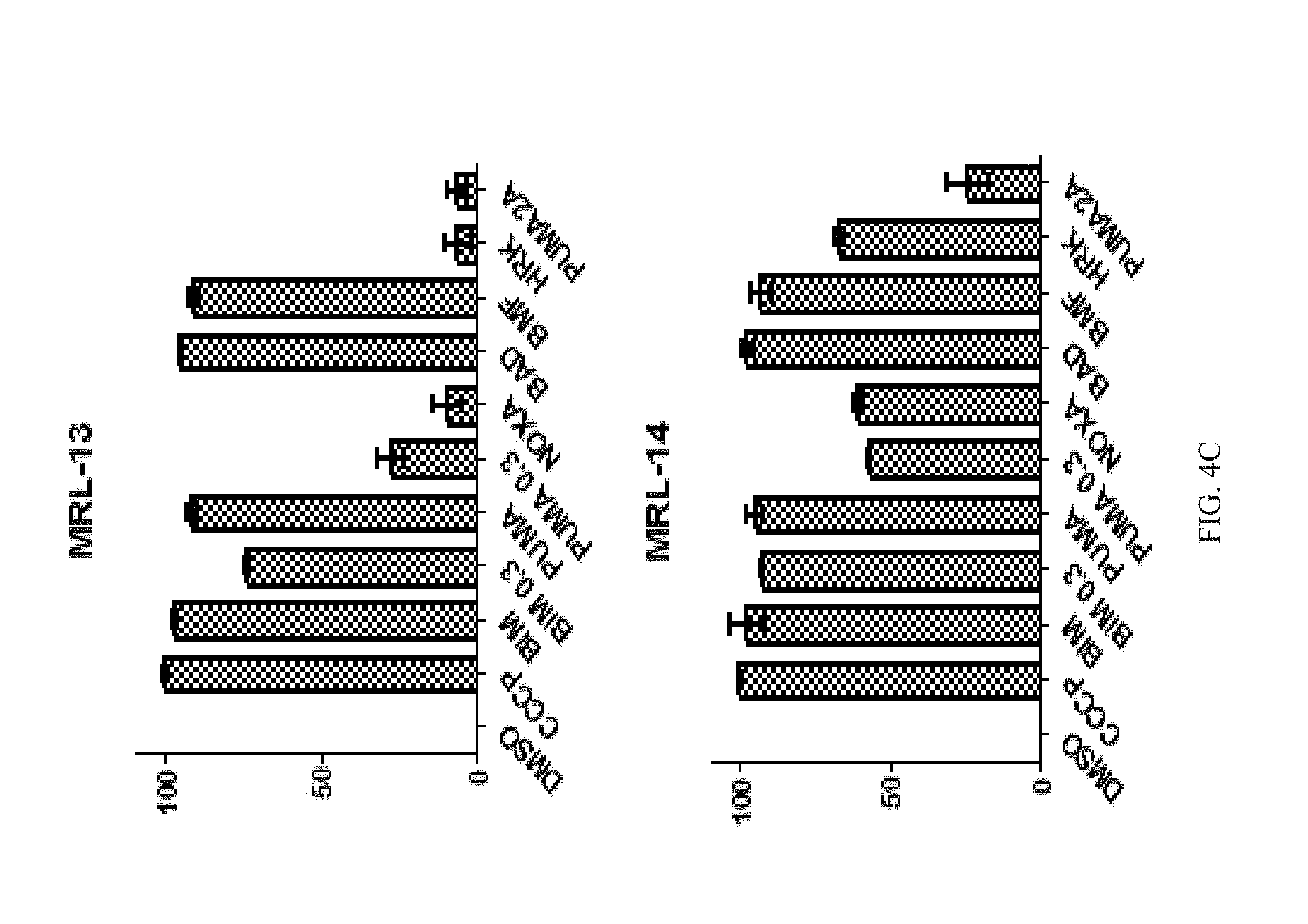 FIG. 1A, FIG. 1B, FIG. 1C and FIG. 1D show representative BH3 profiling data. FIG. 1A, FIG. 1B, FIG. 1C. an FIG. 1D show differences in patterns of high versus low primed cell lines. MRL-14 is highly primed for BIM 0.3, PUMA 0.3 and NOXA relative to MRL-11 (correlates with therapeutic inhibitor activity by MTS Assay).