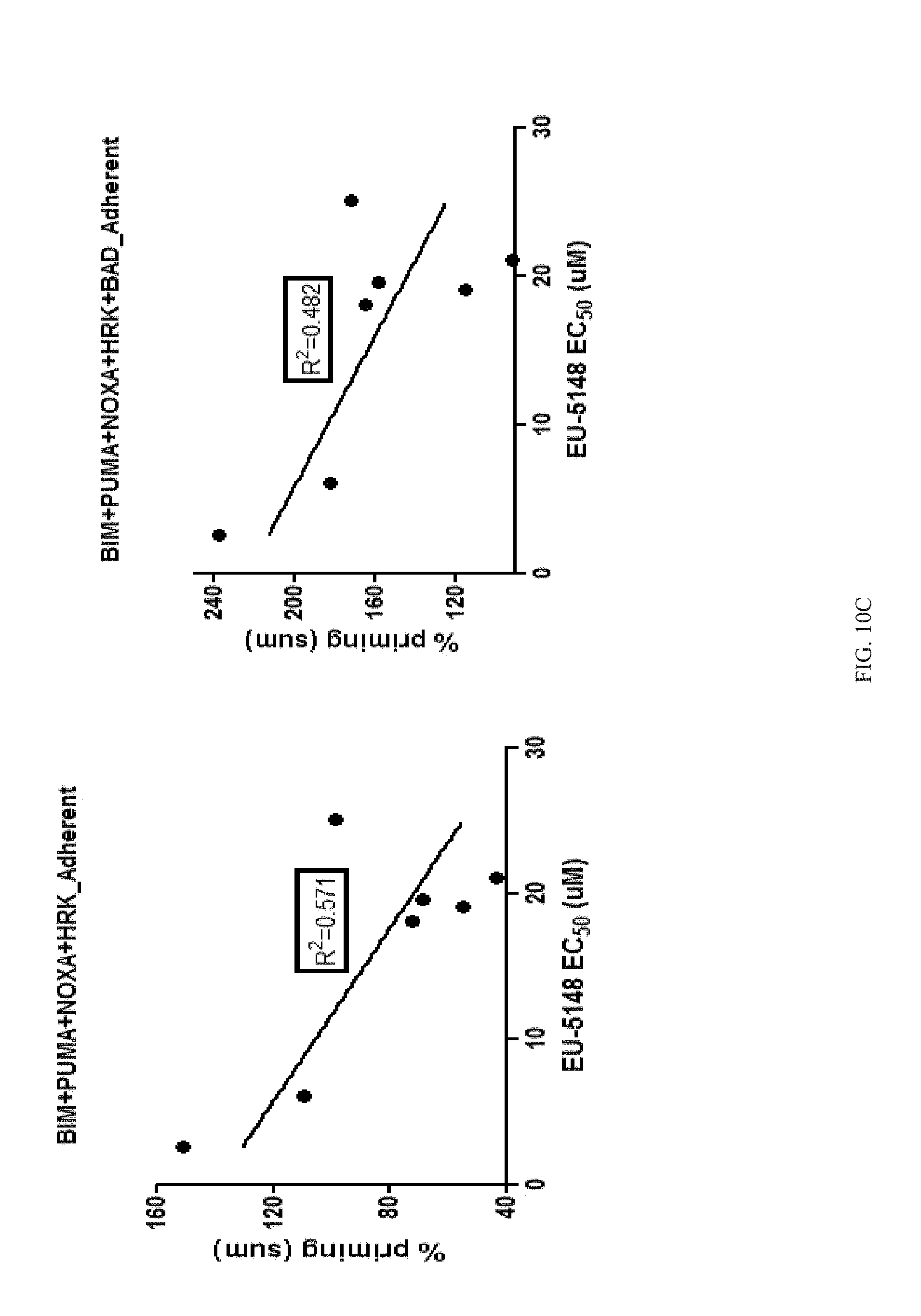 Kinesin Spindle Protein (KSP) inhibitor development: A KSP inhibitor was tested in antiproliferative assay against 8 multiple myeloma/leukemia-derived human cell lines. BH3 profiling was simultaneously performed on these cell lines. The data yields a strong indication of correlation between BH3 profiling readout (% priming with respect to PUMA and BAD, individually) with antiproliferative properties of the compound (FIG. 11A an FIG. 11B).
