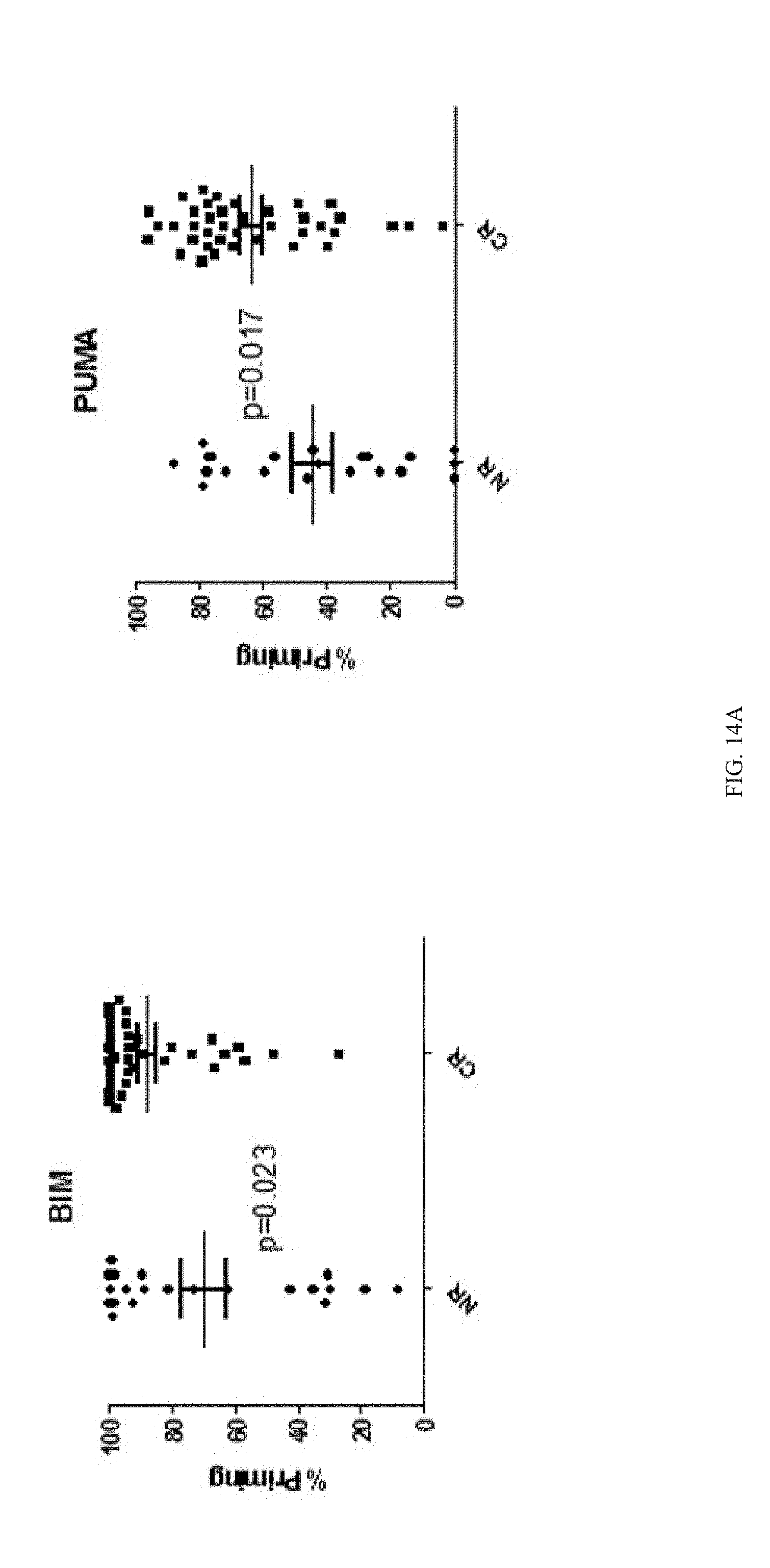 Among the biomarker peptides assayed, higher BIM (0.1) percent priming scores correlated with response at a high degree of statistical significance (p=0.0000018) (FIG. 13A and FIG. 13B). Analyses of other BH3 Profiling biomarkers assayed are indicated in Table 4. In addition to statistical significance yielded by BIM(0.1), PUMA(10) displayed significant association with response (p=0.0064) (FIG. 14A, FIG. 14B, FIG. 14C, and FIG. 14D).