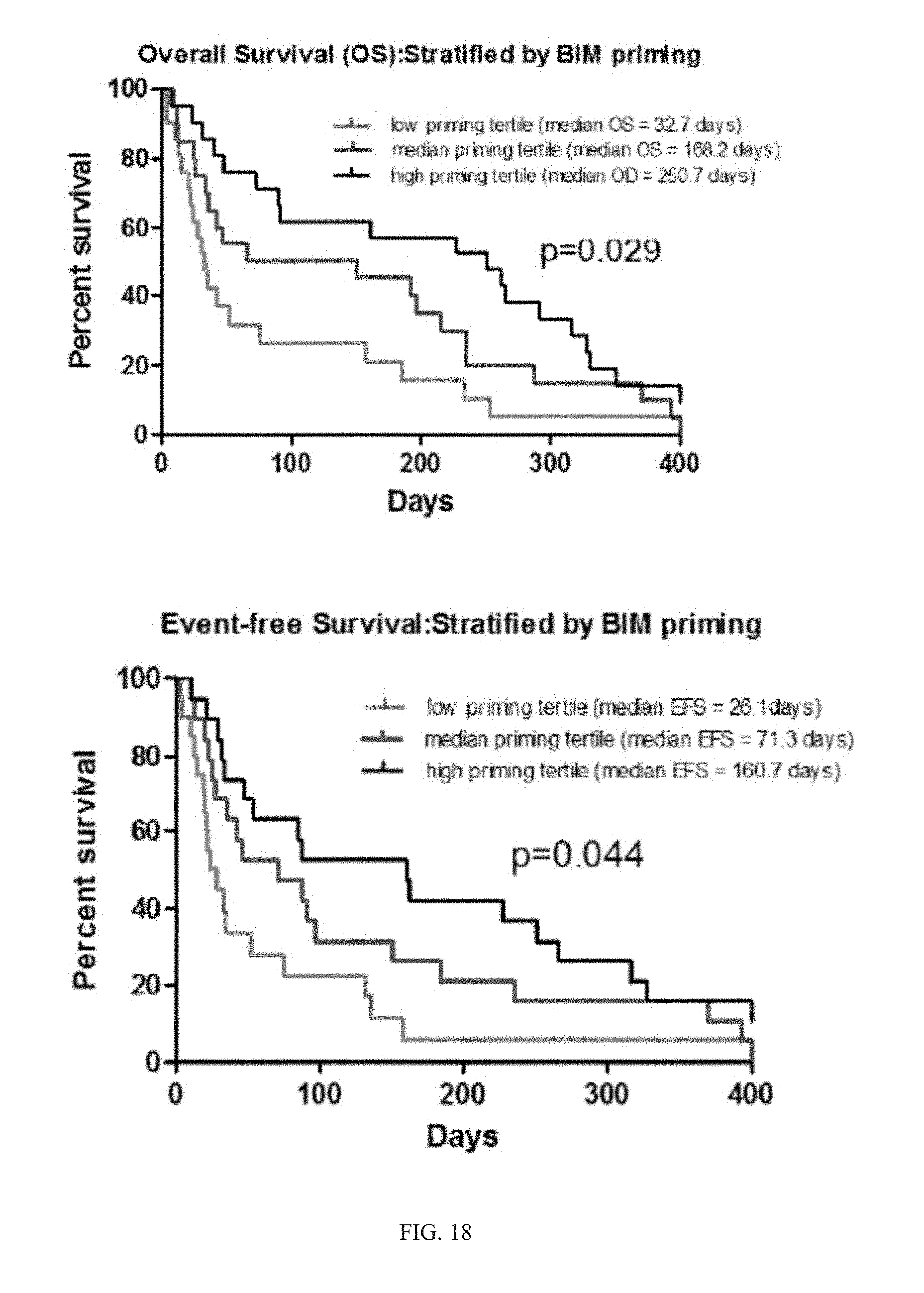 Interestingly, in partition model analyses, when the patient cohort was divided into tertiles by BIM percent priming (High Priming, Intermediate Priming, and Low Priming), corresponding OS yielded a median of 250.7, 168.2 and 32.7 weeks, respectively (p=0.029, logrank test for trend) (FIG. 18). When the same analysis of these tertiles was conducted for EFS, median EFS was 26.1, 71.3, and 160.7 weeks for low priming, intermediate priming, and high priming tertiles, respectively (p=0.044, logrank test for trend) (FIG. 18).