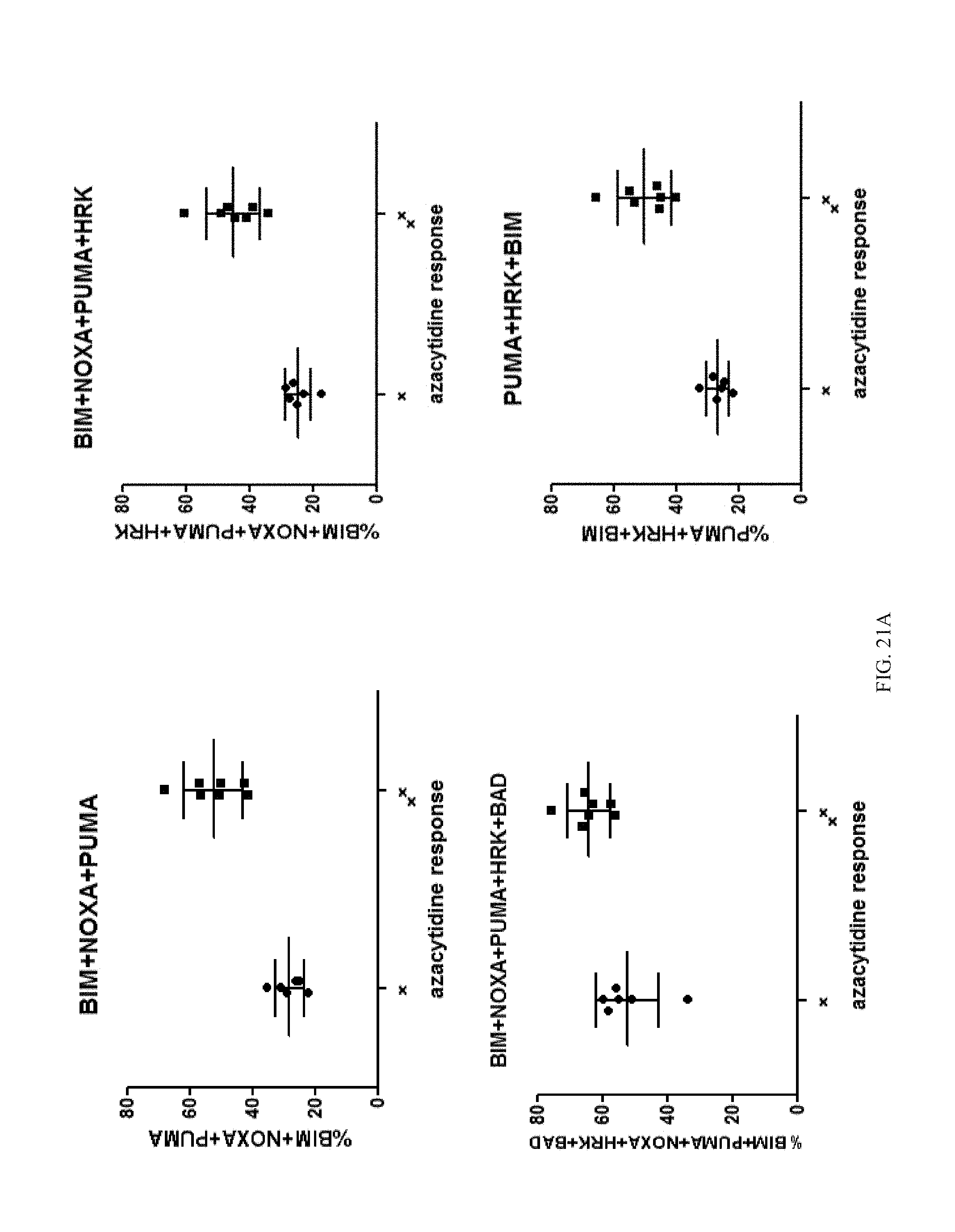AML and Azacytidine: Thirteen human AML derived cell lines were BH3 profiled and correlative analyses performed for in vitro azacytidine response. Partition models utilizing BH3 metrics discriminated azacytidine response with statistical significance (p<0.01) between more sensitive (IC50<2 uM) and less sensitive (IC50>2 uM) AML-derived cell lines using individual peptide-derived models (FIG. 19A, FIG. 19B, and FIG. 19C) as well as two peptide models (FIG. 20) and models comprising 3 or more peptides (FIG. 21A and FIG. 21B). Using continuous variable analysis, R2>0.7 for individual peptide-derived algorithms (FIG. 22A and FIG. 22B) and combined BH3 peptide models relative to[log]IC50s comprising two peptides (FIG. 23) and three or more peptides (FIG. 24A and FIG. 24B) when Puma (pan-priming indicator) is employed. Statistically significant p-values mostly track with models including Puma (p<0.01). Results are summarized in Table 5.