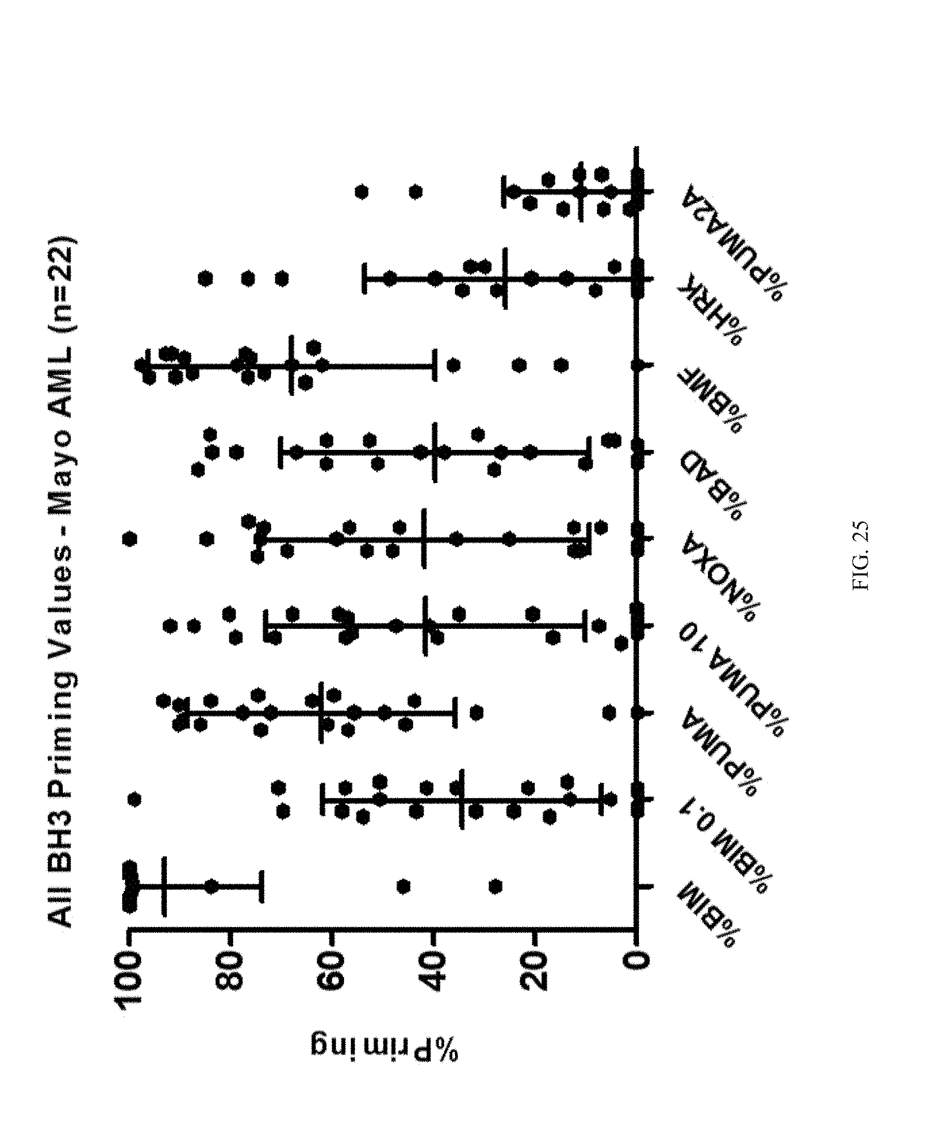 Supporting data for algorithms derived from BH3 metrics from azacytdine-treated AML patients has been generated. In a study comprising an N=28 combined cohort (13 (9 stable/CR; 4 refract/NR) specimens and 15 (all NR/refract)). One specimen was not evaluable. In all, 27 specimens were analyzed relative to response (19 NR, 8 R). The range of reported scores for this cohort is indicated in FIG. 25 and illustrates that the range of scores provides for a therapeutic window against which response and other clinical endpoints such as overall survival (OS) and event-free survival (EFS) may be measured.