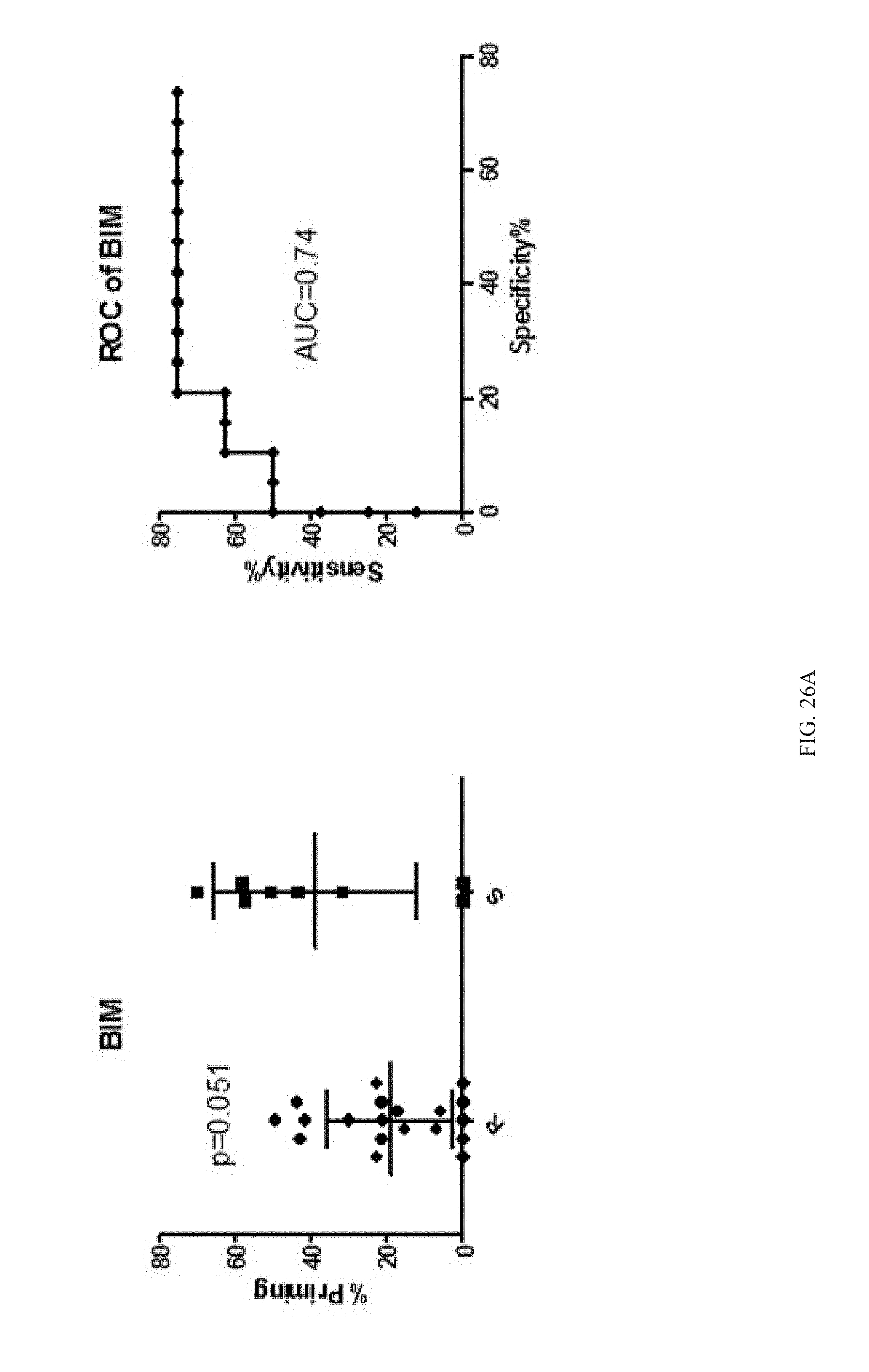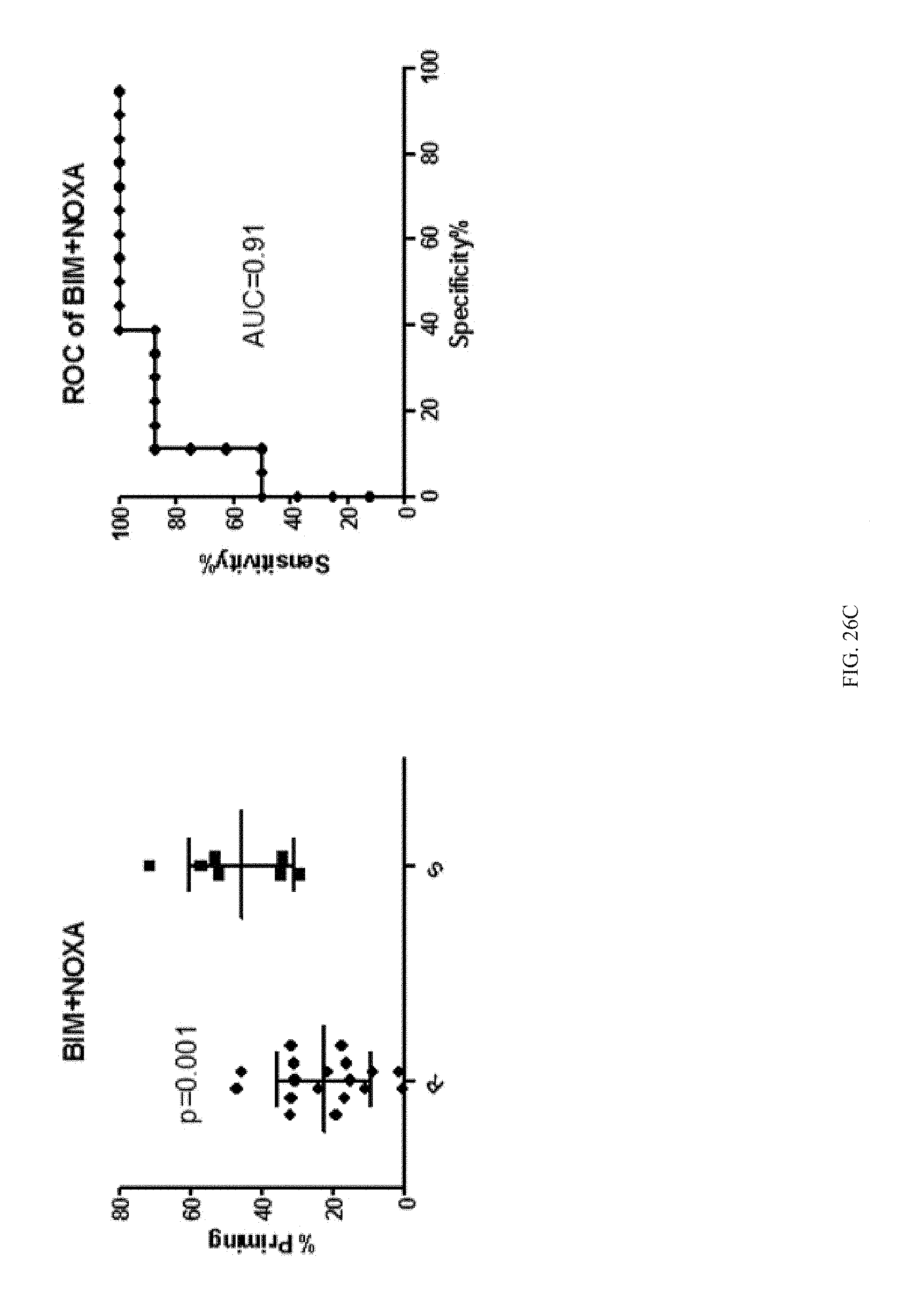 For individual markers, only BIM and NOXA yielded borderline significant association with response (p=0.05 and p=0.02, respectively). All other biomarker p-values>0.1. However, when BIM and NOXA were combined the presently described approach, correlation with response was highly significant (p=0.001). Further, the ROC for sensitivity/specificity was 0.91. This is univariate analyses only and may be stronger statistically when clinical adjustment variables are weighed (e.g., age, cytogenetic status, etc) (FIG. 26A, FIG. 26B, FIG. 26C, and FIG. 26D).