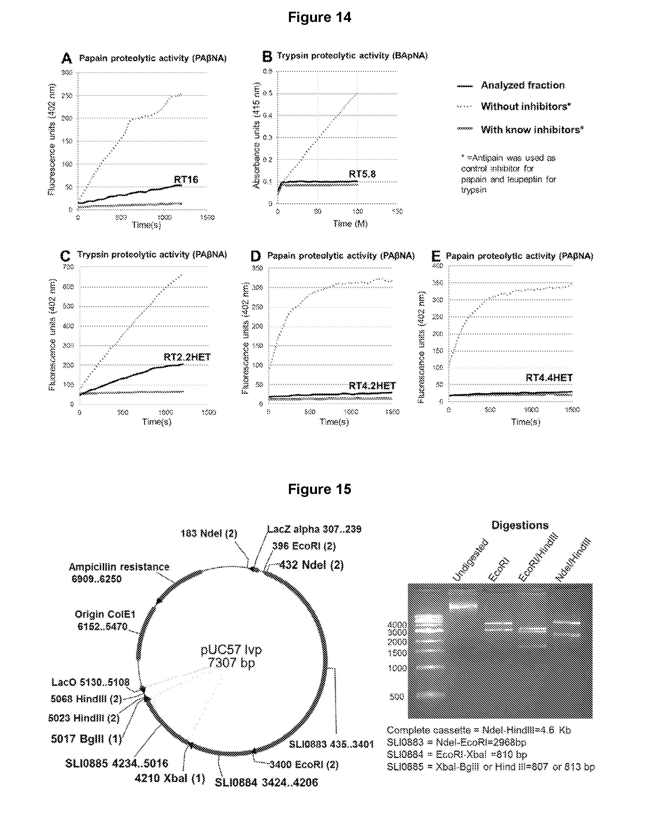 Differential fractions obtained by HPLC, were analyzed by mass spectrometry on LTQ Velos ion trap, Direct injection/ESI (Electrospray ionization), flow: 5 μl/min. For inhibition proteolysis assays, we used fluorometric methods based on the release of naphtylamide group of Phenyl-Arginyl-β-naphtylamide PAβNA, due to the proteolytic action of trypsin and papain. For the inhibition of trypsin by RT5.8, the same principle was used, but here we used a reagent that releases a chromophore (Nalpha-Benzoyl-D,L-arginine 4-nitroanilide or BApNA) whose presence can be detected by a colorimeter [30]. Reaction mixtures for enzymatic assays with PAβNA were prepared as indicated in table 3. The reaction was made in 96-well plates for fluorometer and read on a Tecan fluorometer (excitation wavelength 340 nm and 402 nm emission). For the enzymatic assay using BApNA, the fractions or peaks of interest were dissolved in 100 μL of 0.01M pH 8.0 tris-HCl buffer. For the assay of inhibitory activity, bovine trypsin was used as proteolytic enzyme. Each sample was added 25 μL bovine trypsin, including the enzyme control, which contained buffer instead of the sample. The reaction mixture was added 0.01M pH8 Tris-HCl and incubated at 37° C. for 120 min. Subsequently, the substrate BApNA was added, and the absorbance change was recorded on a colorimeter at 405 nm, every minute for 15 min.