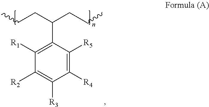 11. The polymer of claim 8, wherein R1, R2, R4, and R5are hydrogen, and R3is sulfonate or sulfonic acid.