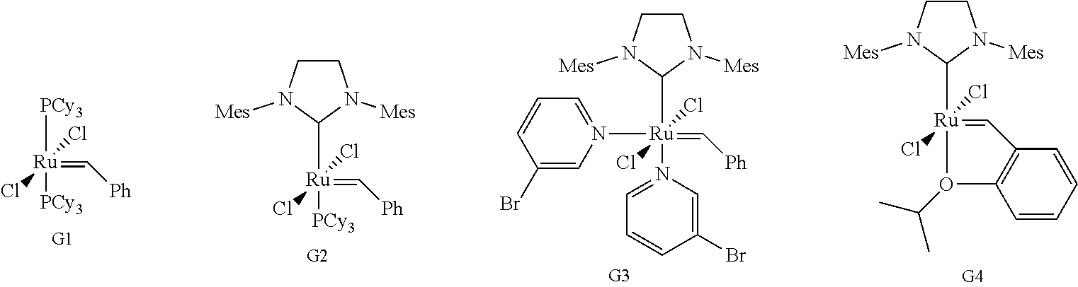 A sufficiently negative ΔH value of 4PCP was believed to suggest that high molar mass and high conversion were possible through temperature reduction and increasing monomer concentration. Therefore a series of polymerizations were performed with varying catalyst, solvent, and temperature (Table 1) to analyze the conversions and molar masses obtained. All samples were terminated with ethyl vinyl ether at the respective polymerization temperatures to prevent depolymerization upon warming.1H-NMR analysis (CDCl3) of each sample was performed to determine the percent conversion by integration ratios of the monomer and polymer olefinic proton peaks. (See FIG. 2). After catalyst removal and precipitation in methanol, the resulting white solids were analyzed via size exclusion chromatography (SEC) in THF to determine number-average molar mass (Mn) and dispersity (Ð) compared to a 10 point conventional calibration using narrow D polystyrene standards. For the temperature and catalyst studies, polymerizations were performed in duplicate to ensure consistent results. The values reported in Table 1 for % conversion, Mn, and Ð represented the average of both duplicate samples with the (±) standard error of the mean (Supporting information).