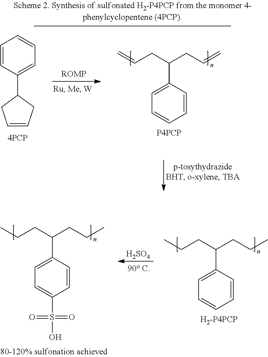 Preliminary attempts to sulfonate H2-P4PCP of molar mass ranging from 11-78 kg mol−1were successful with 80-120% sulfonation achieved as confirmed by elemental analysis, titration, and1H NMR spectroscopy (see Scheme 2).