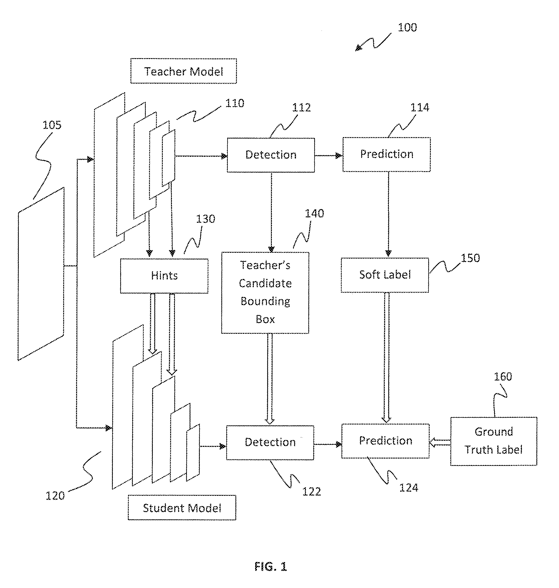 Finally, regarding teacher and student networks 110, 120, in the exemplary embodiments of the present invention, Faster R-CNN can be employed as the model for real-time object detection. The detection includes shared convolutional layers, a Region Proposal Network (RPN) and a Region Classification Network (RCN). Each network includes a classification task and a regression task. Moreover, in the application of object detection, several important cues under the knowledge distillation framework are introduced to simplify the network structures and preserve the performance of the networks. A new objective loss layer for the output feature to better match the source feature space is introduced for the knowledge distillation. Further, the adaptive domain transfer layer is introduced to regularize both the final output and intermediate layers of the student models 120. Thus, knowledge distillation and hint learning can be employed to generate the object detection area.