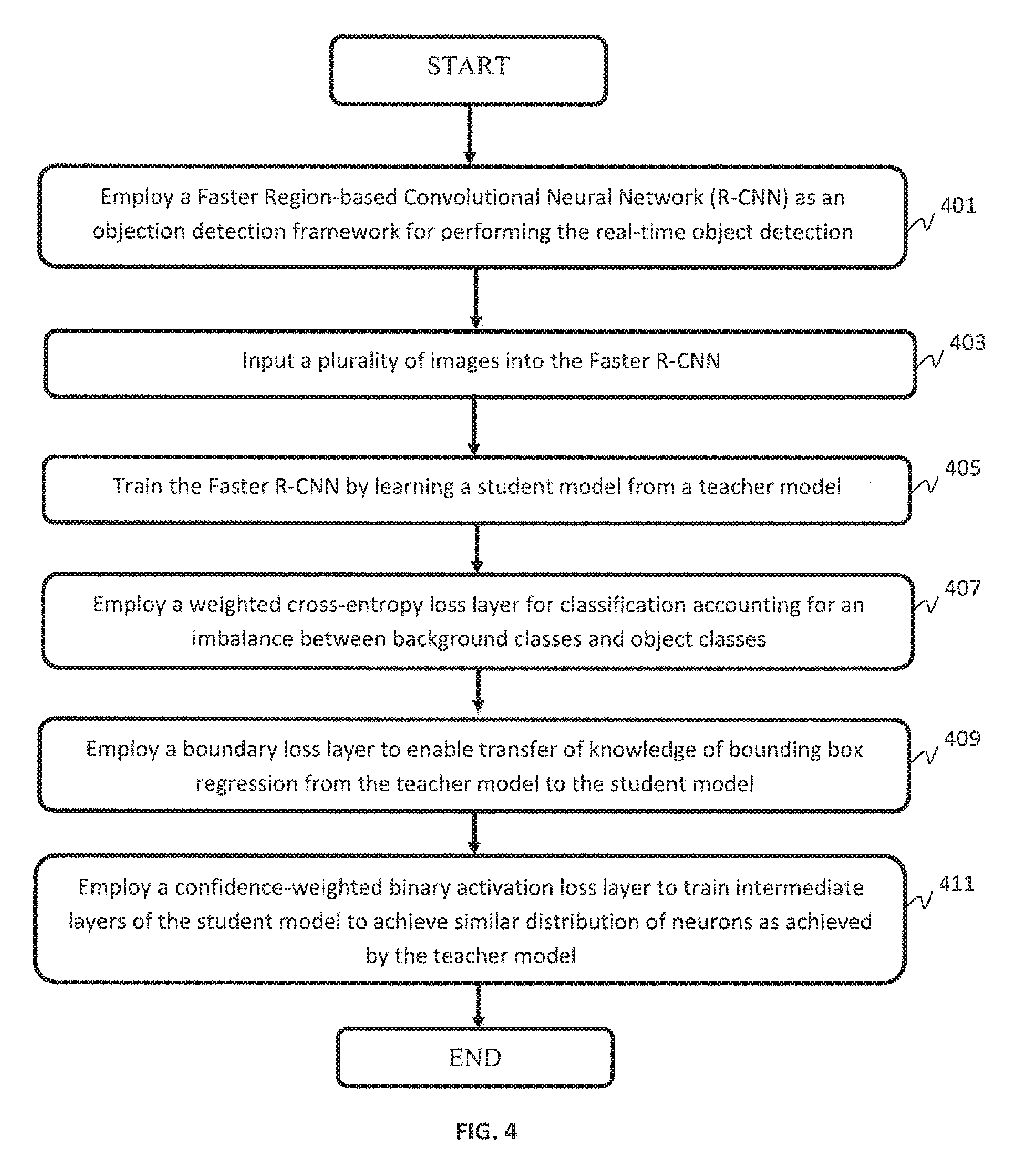 At block 401, a Faster Region-based Convolutional Neural Network (R-CNN) is employed as an objection detection framework for performing the real-time object detection.