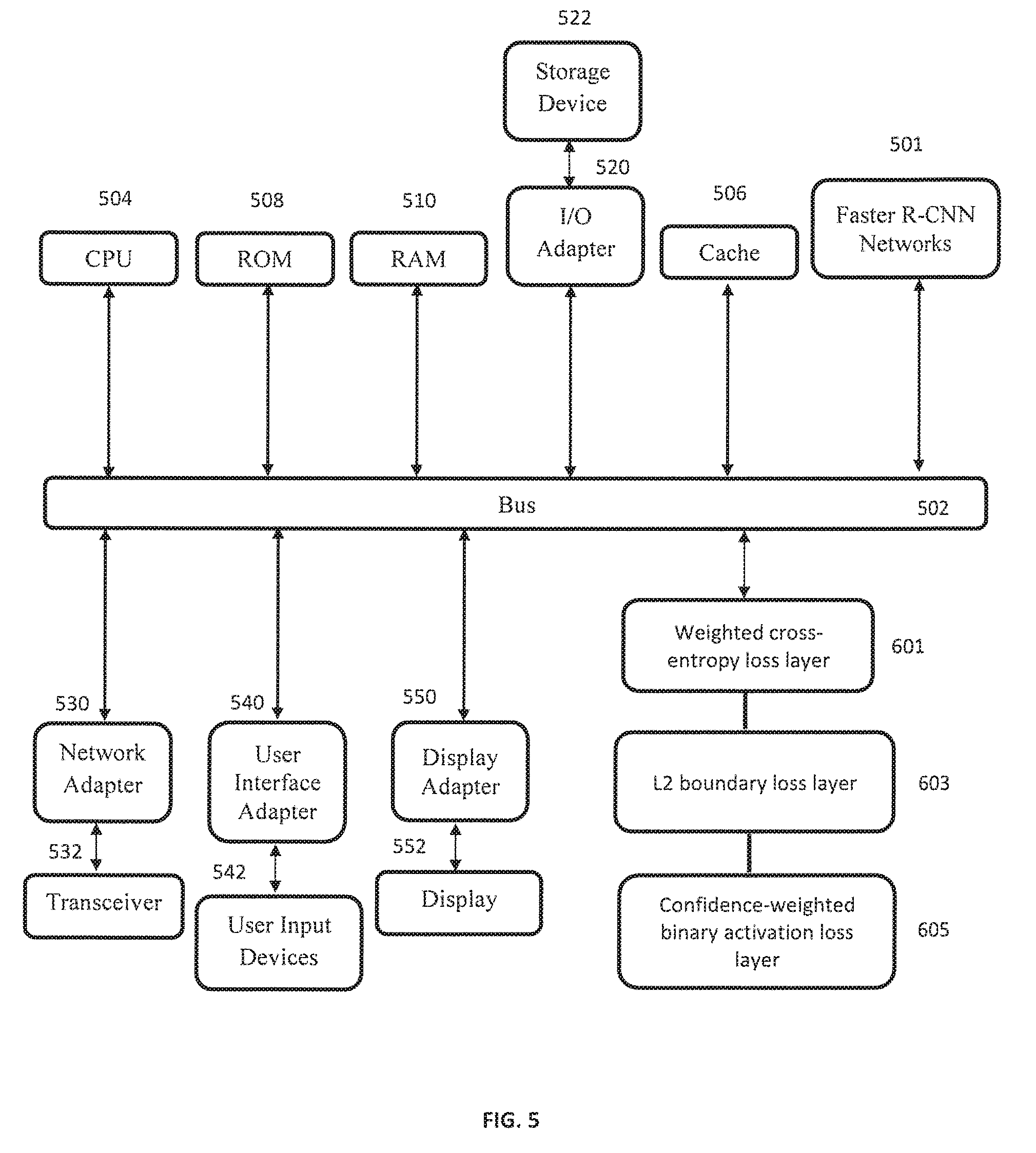 The processing system includes at least one processor (CPU) 504 operatively coupled to other components via a system bus 502. A cache 506, a Read Only Memory (ROM) 508, a Random Access Memory (RAM) 510, an input/output (I/O) adapter 520, a network adapter 530, a user interface adapter 540, and a display adapter 550, are operatively coupled to the system bus 502. Additionally, a Faster R-CNN network 501 for employing object detection is operatively coupled to the system bus 502. The Faster R-CNN 501 achieves object detection by employing a weighted cross-entropy loss layer 601, an L2 boundary loss layer 603, and a confidence-weighted binary activation loss layer 605.