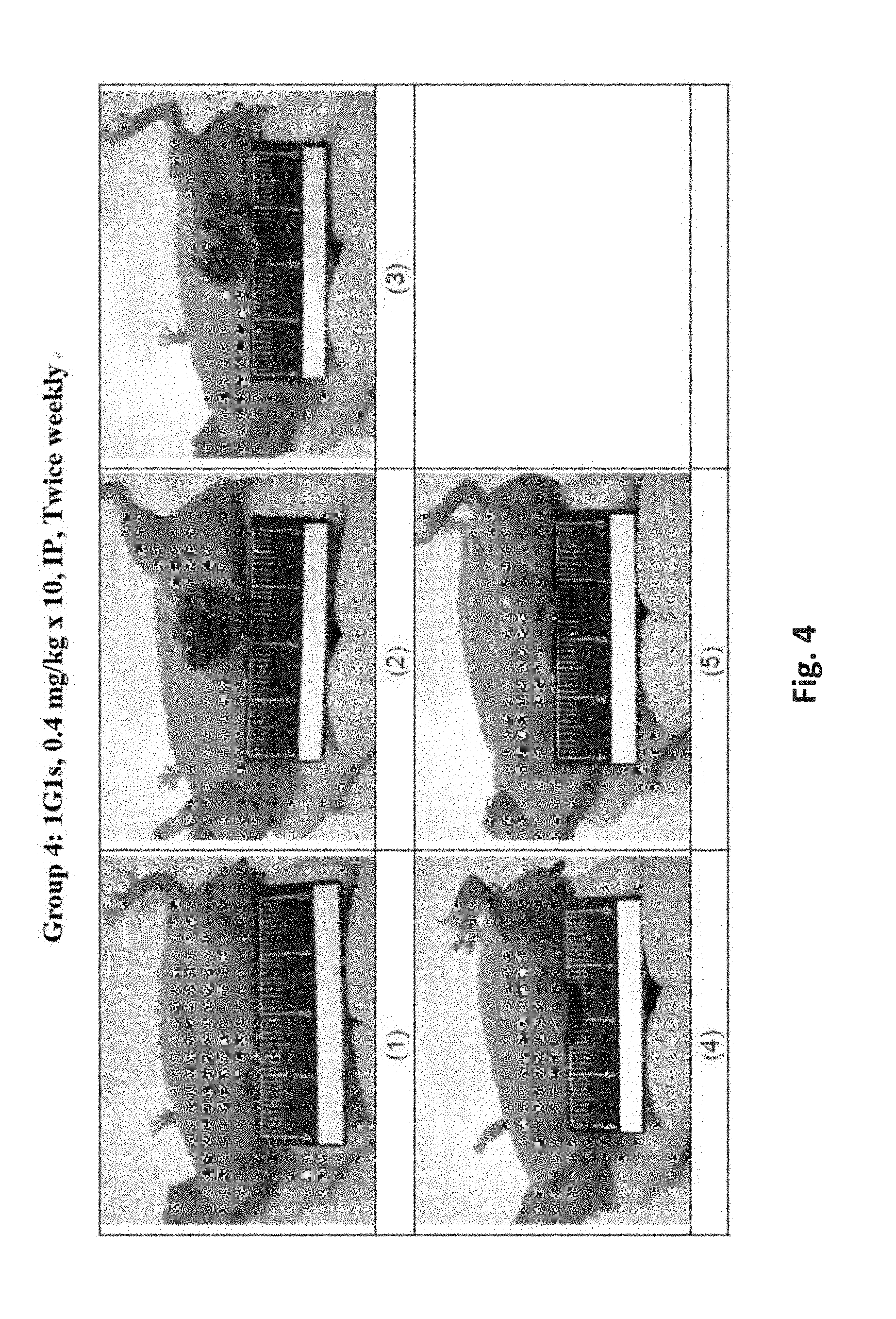 Tumor, Xenograft, Pancreas, HPAC, in Nude Mice Dose (mg/kg) Tumor Volume (mm3) Gr. Treatment (Route) No. Day 1 Day 4 Day 8 Day 11 Day 15 Day 18 Day 22 Day 25 Day 29 Day 32 Day 36 1 Vehicle 10 mL/kg × 1 70 93 164 225 250 336 529 670 954 1161 1565 (PBS, 10, IP 2 72 81 146 181 227 248 351 387 428 502 575 pH 7.4) (Twice weekly) 3 76 94 176 192 300 317 555 617 708 926 991 4 55 72 104 127 203 217 242 342 474 543 562 5 47 62 110 118 152 179 240 314 381 443 507 Mean 64 80 140 169 226 259 383 466 589 715 840 SEM 6 6 14 20 25 30 68 74 107 111 159 2 Globo 0.4 mg/kg × 1 83 108 166 202 262 252 368 396 541 572 657 H-2C2 10, IP 2 79 98 158 177 244 289 428 508 635 844 886 (Twice weekly) 3 49 62 70 87 115 128 154 200 201 250 329 4 52 68 93 113 122 143 186 267 269 317 379 5 53 84 104 127 163 195 233 272 340 297 340 Mean 63 84 118 141 181 201 274 329 397 456 518 SEM 7 9 19 21 31 31 53 55 82 89 87 % T/C 98 105 84 83 80 78 72 71 67 64 62 3 Commercial 0.4 mg/kg × 1 59 49 72 72 109 132 194 214 246 314 360 SSEA-4 Ab 10, IP 2 61 76 97 134 184 252 321 395 585 670 763 (MC-813- (Twice weekly) 3 60 91 148 200 240 313 424 505 701 779 1018 70) 4 54 66 100 140 223 256 325 404 451 620 702 5 84 125 228 288 424 530 635 856 1262 1554 2056 Mean 64 81 129 167 236 297 380 475 649 787 980 SEM 5 13 28 36 52 65 74 106 171 163 228 % T/C 100 101 92 99 104 115 99 102 110 110 117 4 1G1s 0.4 mg/kg × 1 45 118 133 125 189 225 268 314 369 384 841 10, IP 2 57 62 103 163 189 254 339 377 519 588 664 (Twice weekly) 3 62 98 130 181 245 312 362 468 547 626 706 4 83 80 95 121 171 203 259 322 415 490 579 5 78 83 149 166 234 310 340 407 505 553 583 Mean 65 88 122 151 206 261 314 378 471 528 675 SEM 7 9 10 12 14 22 21 28 34 34 38 % T/C 102 110 87 89 91 101 82 81 80 74 80 5 1J1s 0.4 mg/kg × 1 47 79 142 164 194 222 227 282 356 424 427 10, IP 2 73 91 127 159 181 266 366 408 482 545 610 (Twice weekly) 3 41 52 65 93 122 150 202 233 329 376 426 4 77 72 136 211 277 291 308 333 473 473 493 5 68 87 122 153 193 285 455 477 602 721 826 Mean 61 76 118 156 193 243 312 347 448 508 556 SEM 7 7 14 19 25 26 46 44 49 48 60 % T/C 95 95 84 92 85 94 81 74 76 71 66 6 2F20s 0.4 mg/kg × 1 53 74 85 129 164 161 231 265 375 402 499 10, IP 2 50 51 74 110 129 162 208 259 393 411 520 (Twice weekly) 3 92 95 175 244 268 322 446 447 637 670 768 4 73 83 127 162 214 269 337 348 446 490 514 5 52 59 86 109 158 206 273 296 450 516 536 Mean 64 72 109 151 187 224 299 323 460 498 567 SEM 8 8 19 25 25 31 43 35 47 38 40 % T/C 100 90 78 89 83 86 78 69 78 70 68