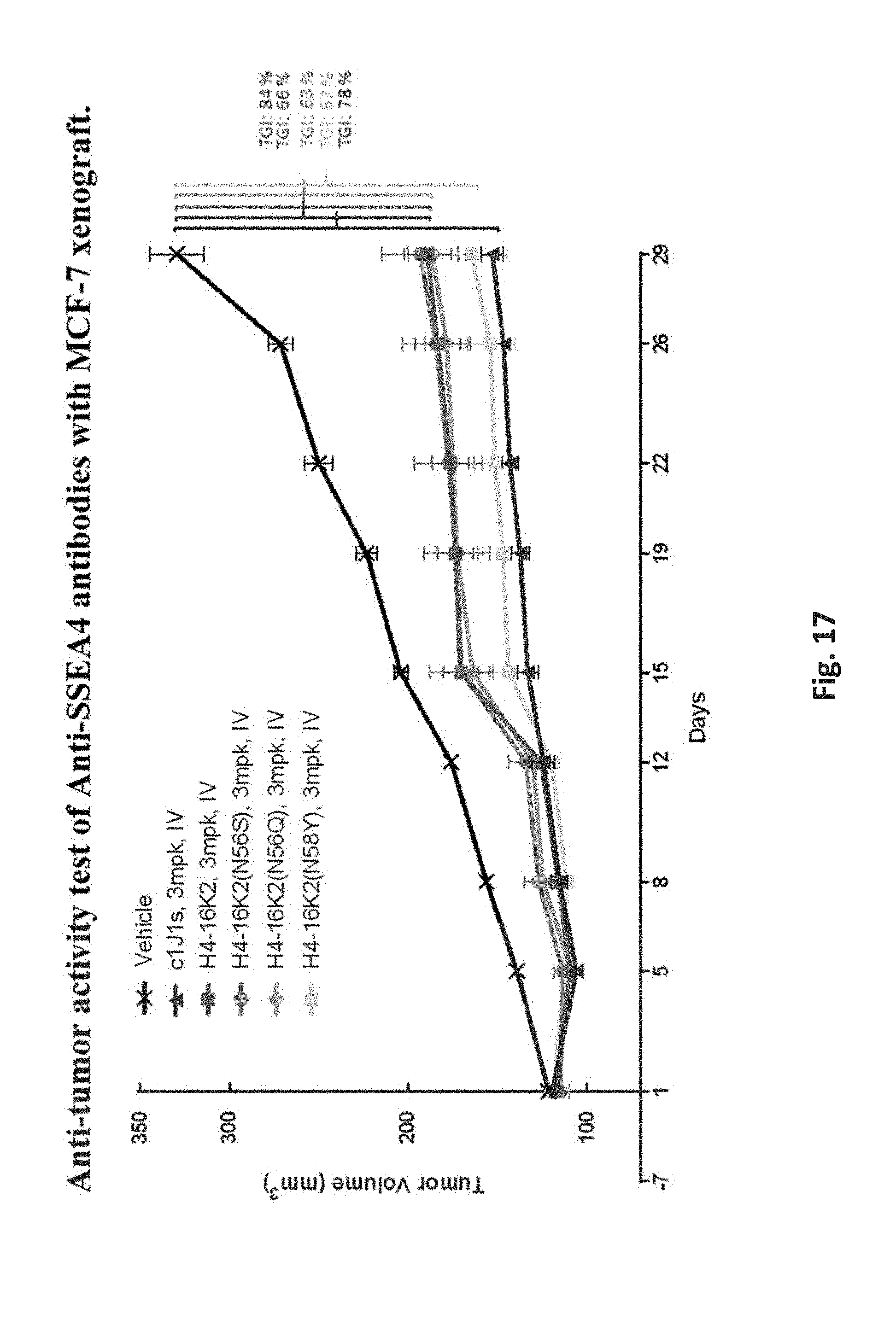 The binding characteristics of SSEA4 clones by using Flow Cytometry Humanized Chimeric H4-16K2 H4-16K2 H4-16K2 H4-16K2 SSEA4 Ab 1J1s H4-16K2 (N56S) (N56Q) (N58Y) (K3T/N56Q) Cell lines (Characteristic) % GM % GM % GM % GM % GM % GM TOV-112D SSEA4Low/GHLow/ 4.23 731 3.21 726 38.42 405 66.58 518 7.93 483 67.53 529 SSEA3Low SKBR3 SSEA4Low/GHLow/ 3.49 386 6.25 380 70.28 357 92.21 444 9.31 316 93.24 453 SSEA3Low SiMa SSEA4Low/ 4.47 333 3.43 354 17.06 285 32.59 261 15.01 394 28.6 266 GHLow/Medium/ SSEA3Low HuMEC SSEA4Low/GHLow/ 5.18 839 5.71 846 5.01 608 4.3 581 5.11 723 5.35 572 SSEA3Low NL-20 SSEA4Low/GHLow/ 3.2 470 8.25 354 5.97 366 13.7 395 4.2 555 16.75 395 SSEA3Low MDA-MB- SSEA4High/GHLow/ 97.21 6603 99.61 10436 99.91 18824 99.94 23720 99.42 9852 99.91 15667 231 SSEA3Low HCC-1428 SSEA4High/GHHigh/ 99.8 40838 98.6 12469 97.82 17791 96.55 16815 82.86 7103 98.01 13130 SSEA3High MCF-7 SSEA4High/GHHigh/ 63 1432 95.11 3359 98.36 4670 99.05 5409 92.04 3146 99.35 5118 SSEA3Medium SW480 SSEA4High/ 63.4 1427 92.26 3955 97.38 9356 98.36 11810 94.75 7563 99.73 10062 GHMedium/ SSEA3Low SKOV-3 SSEA4High/ 99.4 21771 98.9 28503 89.65 36609 98.6 35112 99.3 33477 99.31 67824 GHMedium/Low/ SSEA3High GM: geometric mean of fluorescent intensity %: the percentage of binding region of test cells above background Example 11: Carbohydrate Cross-Reactivity