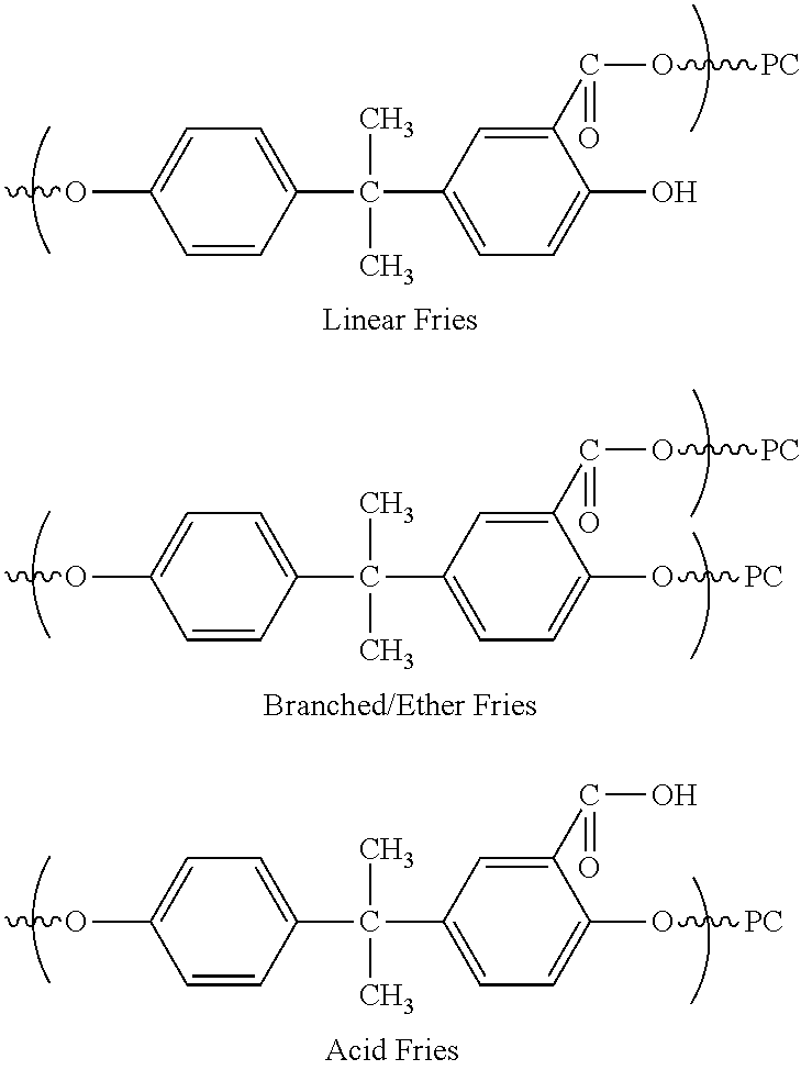 Aspect 15: The method of aspect 14, wherein the polycarbonate resin exhibits a fries concentration from about 1000 ppm to about 3000 ppm.